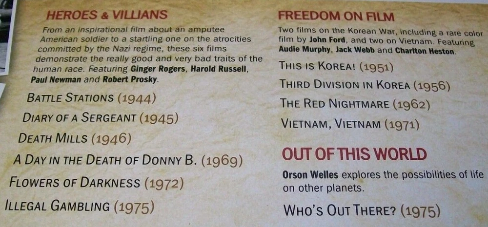 Cases have varying shelf/handling wear. Discs are in good condition or better. Some are new. New and Blu-rays will be identified in the titles and photos. We have lots of other items. They can all be found in our store Lucky's Lookout. All of our listings allow multiple item purchase discounts and combined shipping if purchased in the same checkout. If for some reason it does not work correctly, you may contact us before completing checkout for us to correct the problem or we will refund any amounts needed to apply the discount and combined shipping savings when we ship your order. For more listings like this one go to: Military/War/C ombat DVDs and Blu-rays # - C eBay item number: 115095247333 Military/War/C ombat DVDs and Blu-rays I - R eBay item number: 115843793496 Military/War/C ombat DVDs and Blu-rays S - Z eBay item number: 126464671169 Classic Movie and /TV DVDs and Blu-rays # thru H eBay item number: 124843161062 Classic Movie and /TV DVDs and Blu-rays I thru Z eBay item number: 126008590283 BBC & British Shows DVDs & Blu-rays eBay item number: 125692175184 Martial Arts Themed DVDs/Blu-rays eBay item number: 125498714848 Horror DVDs and Blu-rays 1 to D eBay item number: 114916571492 Horror DVDs and Blu-rays E to J eBay item number : 125877696532 Horror DVDs and Blu-rays K to R eBay item number : 125877711109 Horror DVDs and Blu-rays S to Z eBay item number: 125214044954 Sports Films/Movies DVDs/Blu-rays # - K eBay item number: 125445399509 Sports Films/Movies DVDs/Blu-rays L - Z eBay item number: 115868641834 Musicals and Music Themed DVDs/Blu-rays eBay item number: 115463939446 Concert and Music DVDs eBay item number: 115456117557 Brand New Horror DVDs and Blu-rays eBay item number: 125047318793 Various Brand New DVDs eBay item number: 114918879512 Various Blu-rays eBay item number: 124831044366 Disney DVDs #0 through L eBay item number: 114927785955 Disney DVDs M through Z eBay item number: 125546398679 Disney Blu-rays eBay item number: 115552095810 Other Childrens and Family DV Ds and Blu-rays # - L eBay item number: 115354076450 Other Childrens and Family DV Ds and Blu-rays M - Z eBay item number: 125986608525 New Unopene d Other Childrens and Family DVDs and Blu-rays eBay item number: 115504107547 Religious Themed DVDs # thru I eBay item number: 125683035440 Religious Themed DVDs J thru Z eBay item number: 126061310732 Western DVDs and Blu-rays # - K eBay item number: 115086791119 Western DVDs and Blu-rays L - Z eBay item number: 125965088769 Sci-Fi DVDs & Blu-rays # - J eBay item number: 124849948156 Sci-Fi DVDs & Blu-rays K - Z eBay item num ber: 125936967579 NEW Sci-Fi DVDs & Blu-rays eBay item number: 125422436461 Super Hero DVDs & Blu-rays eBay item number: 125245496714 Health and Fitness DV Ds eBay item number: 115040001181 Christmas DVDs and Blu-rays eBay item number: 115571149554 Christmas/Holiday CDs eBay item number: 125014251018 Digital Codes Notice: Do not buy this item if you are counting on the digital code to work to download and/or play digital copies. We do not guarantee any digital codes as they may have expired or otherwise not work. Also, we do not sell digital codes separately for the same reason. If they do work, they should be enjoyed as an extra benefit by the buyer. We do not accept returns, so please read item descriptions carefully and ask any questions before buying. If there are any problems with items purchased, please contact us directly and we will do our best to resolve the problems. All shipping charges include tracking/delivery confirmation. Thank you for shopping Lucky's Lookout.