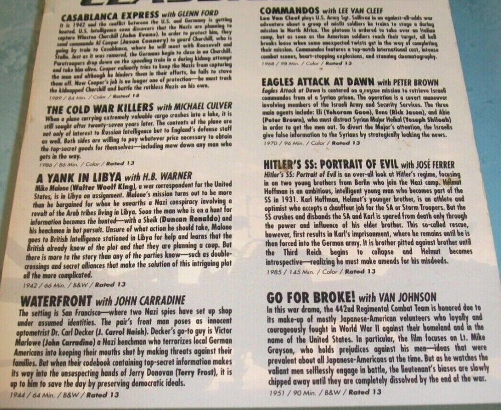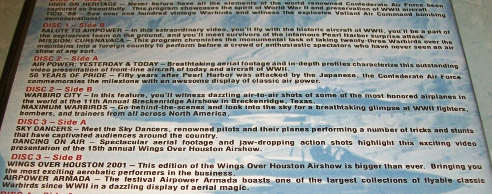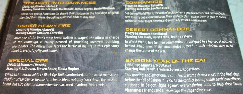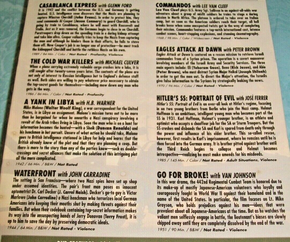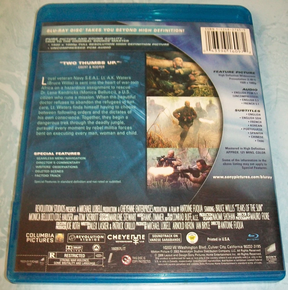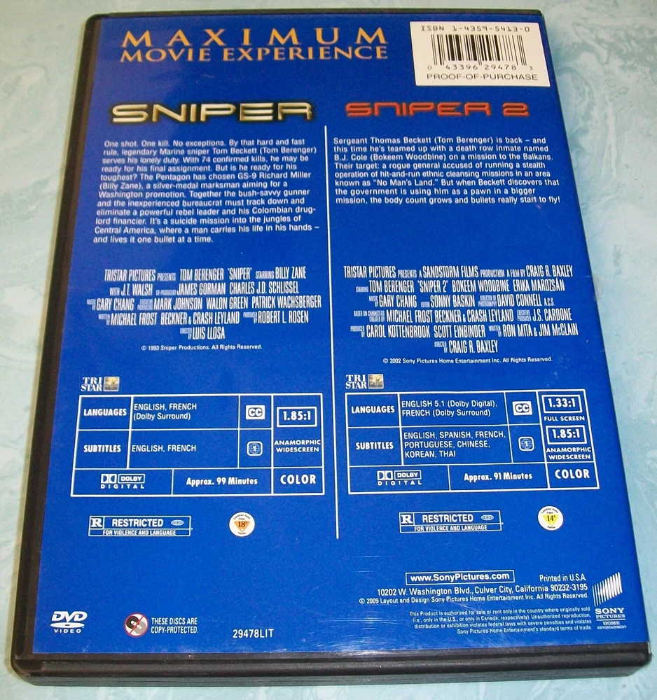 Cases have varying shelf/handling wear. Discs are in good condition or better. Some are new. New and Blu-rays will be identified in the titles and photos. We have lots of other items. They can all be found in our store Lucky's Lookout. All of our listings allow multiple item purchase discounts and combined shipping if purchased in the same checkout. If for some reason it does not work correctly, you may contact us before completing checkout for us to correct the problem or we will refund any amounts needed to apply the discount and combined shipping savings when we ship your order. For more listings like this one go to: Military/War/C ombat DVDs and Blu-rays # - C eBay item number: 115095247333 Military/War/C ombat DVDs and Blu-rays D - H eBay item number: 116169327290 Military/War/C ombat DVDs and Blu-rays I - R eBay item number: 115843793496 Classic Movie and /TV DVDs and Blu-rays # thru H eBay item number: 124843161062 Classic Movie and /TV DVDs and Blu-rays I thru Z eBay item number: 126008590283 BBC & British Shows DVDs & Blu-rays eBay item number: 125692175184 Martial Arts Themed DVDs/Blu-rays eBay item number: 125498714848 Horror DVDs and Blu-rays 1 to D eBay item number: 114916571492 Horror DVDs and Blu-rays E to J eBay item number : 125877696532 Horror DVDs and Blu-rays K to R eBay item number : 125877711109 Horror DVDs and Blu-rays S to Z eBay item number: 125214044954 Sports Films/Movies DVDs/Blu-rays # - K eBay item number: 125445399509 Sports Films/Movies DVDs/Blu-rays L - Z eBay item number: 115868641834 Musicals and Music Themed DVDs/Blu-rays eBay item number: 115463939446 Concert and Music DVDs eBay item number: 115456117557 Brand New Horror DVDs and Blu-rays eBay item number: 125047318793 Various Brand New DVDs eBay item number: 114918879512 Various Blu-rays eBay item number: 124831044366 Disney DVDs #0 through L eBay item number: 114927785955 Disney DVDs M through Z eBay item number: 125546398679 Disney Blu-rays eBay item number: 115552095810 Other Childrens and Family DV Ds and Blu-rays # - L eBay item number: 115354076450 Other Childrens and Family DV Ds and Blu-rays M - Z eBay item number: 125986608525 New Unopene d Other Childrens and Family DVDs and Blu-rays eBay item number: 115504107547 Religious Themed DVDs # thru I eBay item number: 125683035440 Religious Themed DVDs J thru Z eBay item number: 126061310732 Western DVDs and Blu-rays # - K eBay item number: 115086791119 Western DVDs and Blu-rays L - Z eBay item number: 125965088769 Sci-Fi DVDs & Blu-rays # - J eBay item number: 124849948156 Sci-Fi DVDs & Blu-rays K - Z eBay item num ber: 125936967579 NEW Sci-Fi DVDs & Blu-rays eBay item number: 125422436461 Super Hero DVDs & Blu-rays eBay item number: 125245496714 Health and Fitness DV Ds eBay item number: 115040001181 Christmas DVDs and Blu-rays eBay item number: 115571149554 Christmas/Holiday CDs eBay item number: 125014251018 Digital Codes Notice: Do not buy this item if you are counting on the digital code to work to download and/or play digital copies. We do not guarantee any digital codes as they may have expired or otherwise not work. Also, we do not sell digital codes separately for the same reason. If they do work, they should be enjoyed as an extra benefit by the buyer. We do not accept returns, so please read item descriptions carefully and ask any questions before buying. If there are any problems with items purchased, please contact us directly and we will do our best to resolve the problems. All shipping charges include tracking/delivery confirmation. Thank you for shopping Lucky's Lookout.
