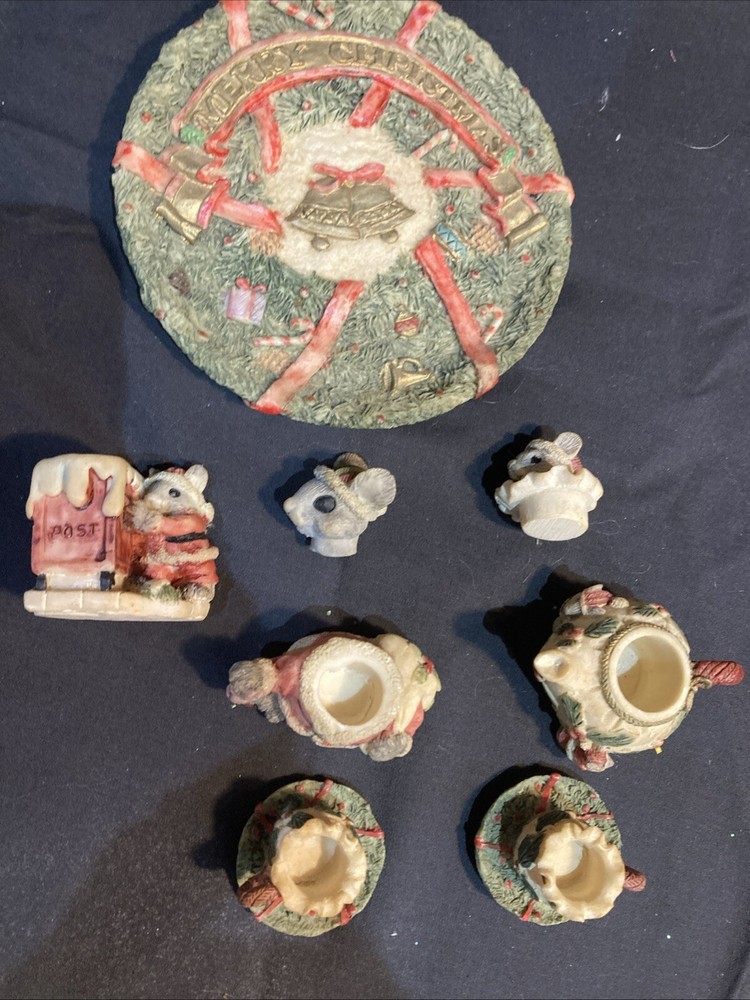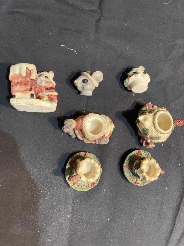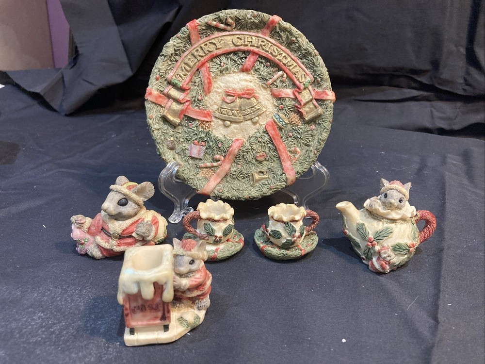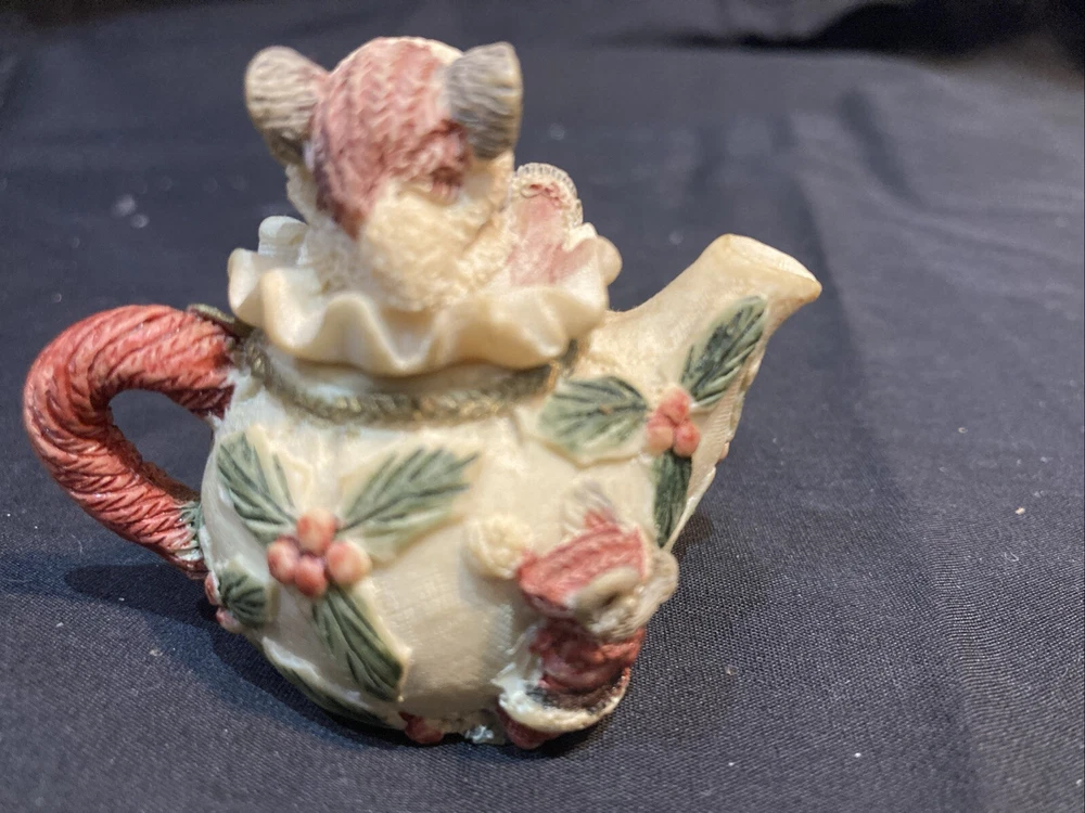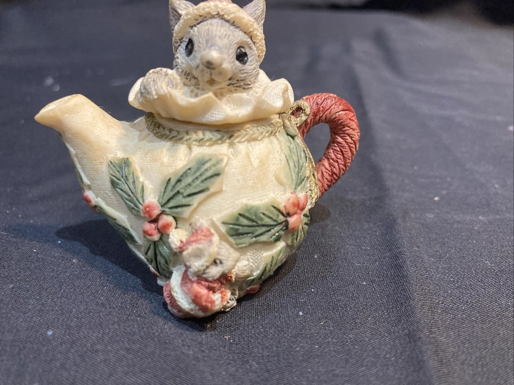 This charming miniature tea set features a cute mouse family design that's perfect for the holiday season. The set includes all the essentials, such as a teapot, cups, saucers, and a tray, all adorned with a festive Christmas theme. Each piece is meticulously hand-painted with a matte finish, giving them a unique and retro style. Made by Popular Imports, Inc. in 1994, this collectible tea set is a great addition to any room or collection. This set is unboxed and comes from a smoke-free and pet-free home. Happy bidding!