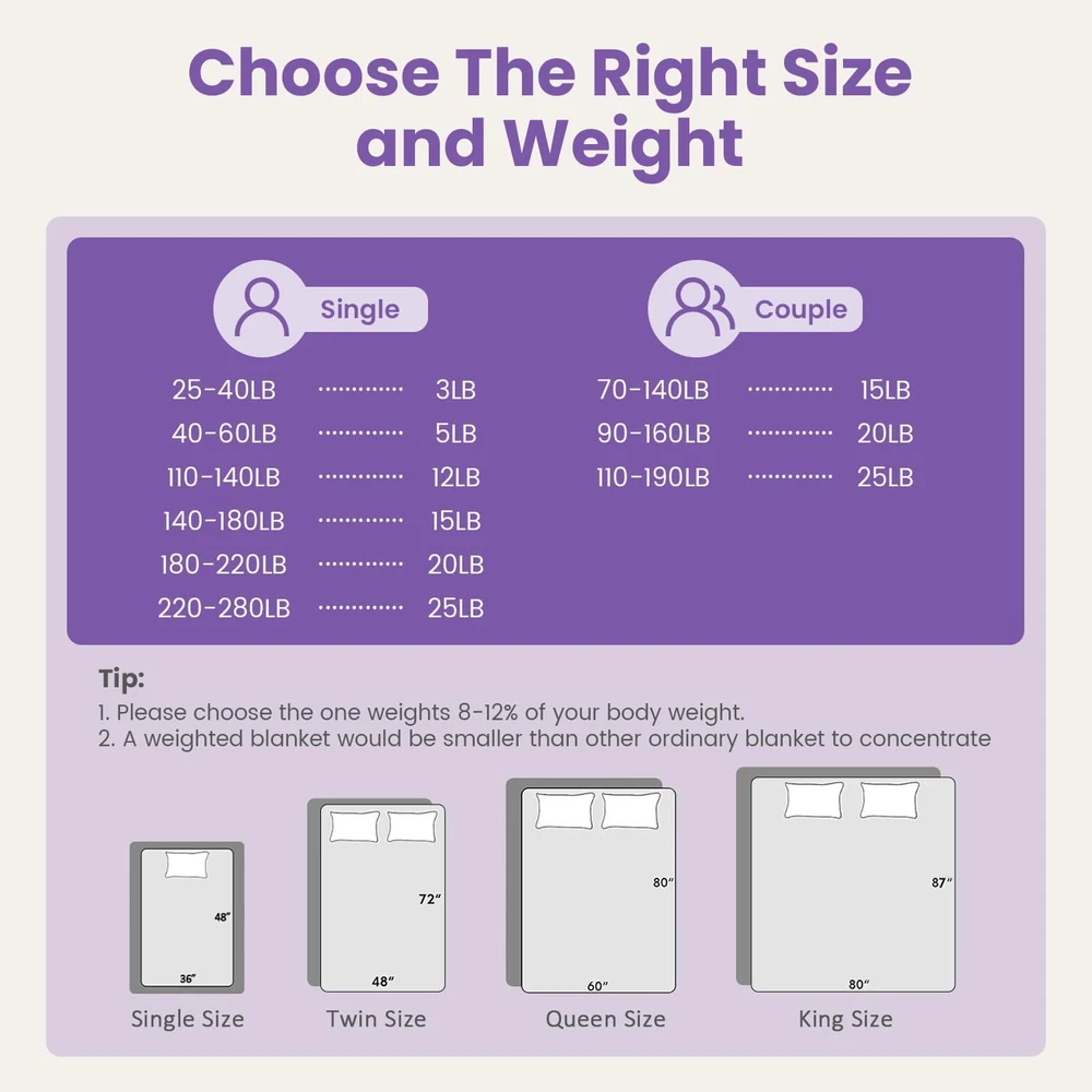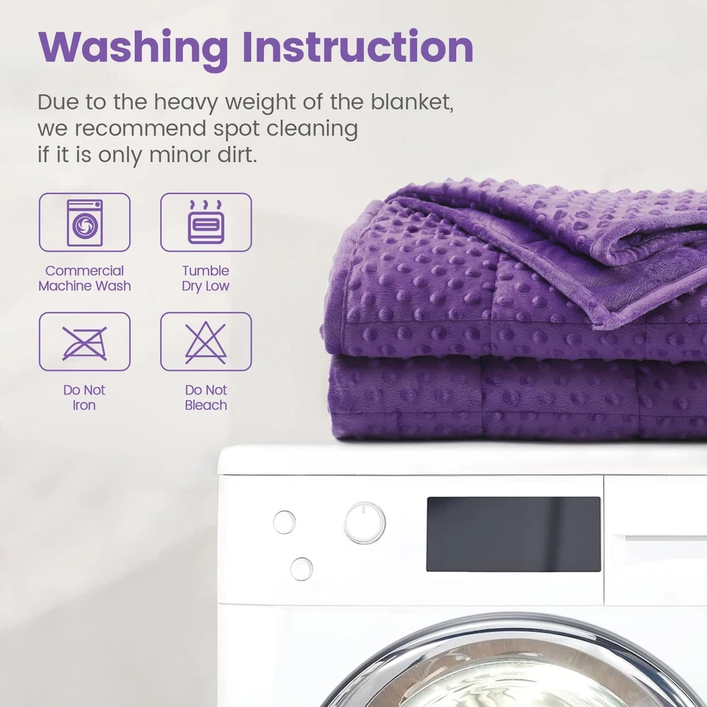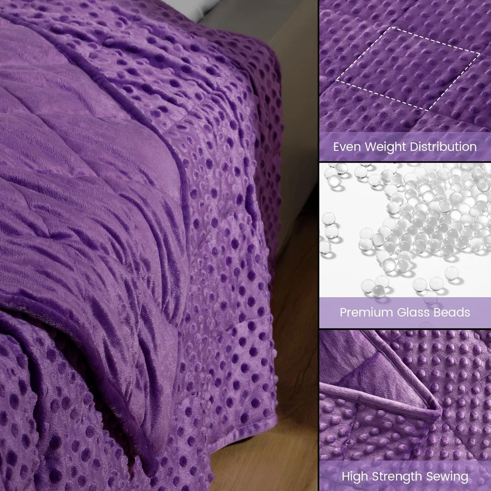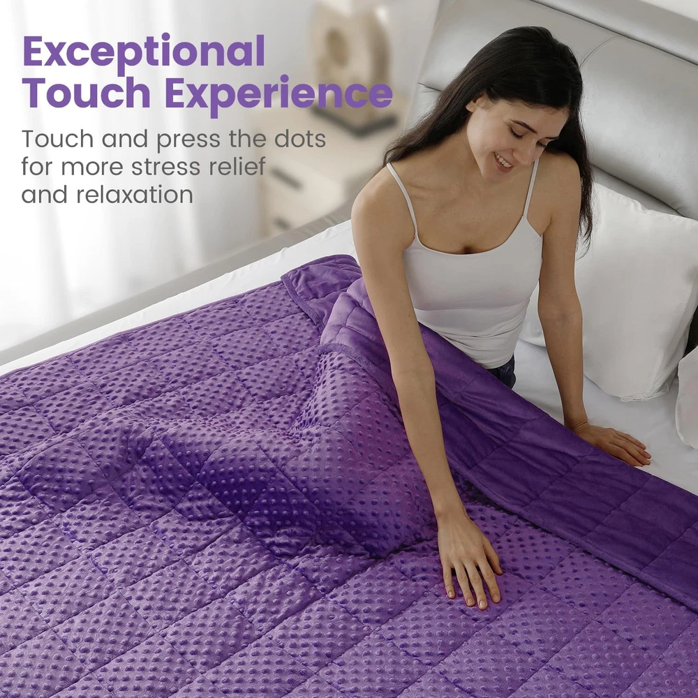 Store New Arrivals Add to Favorite View Feedback Contact Minky Dot Weighted Blanket for Adults King Size 15 Lbs, Soft Cozy Heavy Blanket for Bed and Couch, Breathable Blanket for All-Season with Glass Beads, Purple 80 X 87 Inches Description Style Modern Number of Items 1 Pattern Solid Country of Origin China Embellishment Plush Blanket Form Weighted Blanket Theme Occasion Product Dimensions 87"L x 80"W Material Crystal Velvet Age Range (Description) Adult Seasons All Water Resistance Level Not Water Resistant Item Weight 14.41 pounds Fill Material Ceramic Beads Special Feature Fade Resistant Fabric Warmth Description Moderate Color Purple Recommended Uses For Product Reading, Napping, Better Sleep Fabric Type Crystal Velvet Product Care Instructions Machine Wash, Tumble Dry Size 80" x 87" 15lbs Premium Weighted Blanket: The Bubble Pressure Weighted Blanket is made from plush, soft crystal velvet, suitable for all seasons. It contains 0.88mm hypoallergenic, non-toxic ceramic beads, evenly distributed within small squares for pressure dispersion. An extra layer of breathable microfiber minimizes bead leakage and noise, preventing bead tearing and spillage, thereby boosting durability and comfort Stress Relief & Better Sleep: Our weighted blanket is designed with pressure bubbles to give you an extraordinary touch experience. Its raised dot design will help you relieve stress faster and relax efficiently. Meanwhile, the weight of the blanket provides a feeling of security and comfort, replicating the feel of a warm embrace, promoting excellent quality sleep, making it your close sleep companion Choosing the Right Weight: We suggest that you start with a blanket which weighs approximately 8%-12% of your body weight. Usually, it takes 3-5 days to adjust to the weight of this blanket. A quick note: a weighted blanket would appear smaller than a traditional one since its weight needs to concentrate on your body, so the blanket doesn't hang over the edge of the bed Washing Instruction: Our weighted blankets are designed for durability and wrinkle resistance, no pilling, fading, or shrinking. We recommend washing in a commercial machine and tumble drying on a low temperature, blankets should not be bleached or ironed, if only lightly soiled we recommend spot cleaning Suitable for all season: Our adult weighted blankets are available in a variety of colors and sizes, perfect for all seasons, choose the right weighted blanket and experience the feeling of being wrapped up Minky Dot Weighted Blanket for Adults ABOUT US We offer the best prices around on high quality products. Our E-store includes media such as books, movies, music and games while offering electronics, toys, sporting apparel, clothing, tools, general home, garden items and more. SHIPPING We are always working hard to ensure your package arrives as soon as possible. Please understand that some factors like weather, high postal traffic, and the performance of shipping companies are outside of our control. We offer free shipping to the lower 48 states and ship within 2 business days of payment, usually sooner. We do not accept P.O. Boxes. Please provide a physical address. For shipping outside of the continental USA, we only use eBay's Global Shipping Program.The item is shipped to KY and then sent to the rest of the world. International customers are responsible for all duties and taxes. Continue to check out in order to calculate costs for shipping the item to your country. Messages regarding eBay's Global Shipping Program MUST be directed at eBay EXCLUSIVELY. RETURNS We offer a 30-Day Return Policy on items which you are not completely satisfied with. You have the option for a full-refund or an exchange of the item. No returns are available on items shipped outside of the USA. PAYMENT We accept PayPal. CONTACT US This page content is yet to come Please ad us to your favorite seller and visit again later Thank You CUSTOMER SATISFACTION We try our very best to make sure every customer is completely satisfied. If there's a problem, message us! We're happy to help.