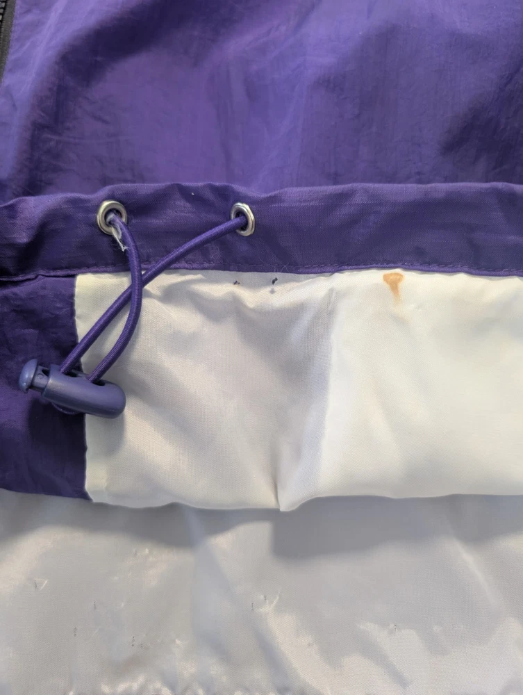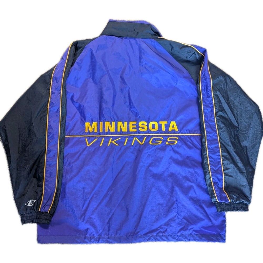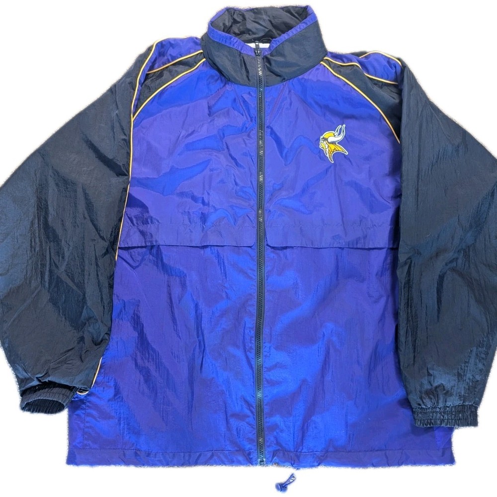 The Minnesota Vikings Vintage Game Day Wind Breaker Jacket is a full zip purple jacket officially licensed by the National Football League. It is designed for men and features the iconic Minnesota Vikings team logo, making it a perfect accessory for football fans. This jacket is perfect for showcasing your team pride during the regular season games. The jacket is in size L, making it a comfortable and stylish choice for any fan of the Minnesota Vikings.