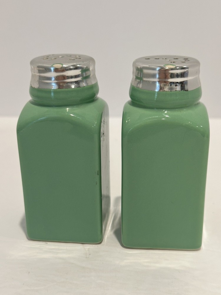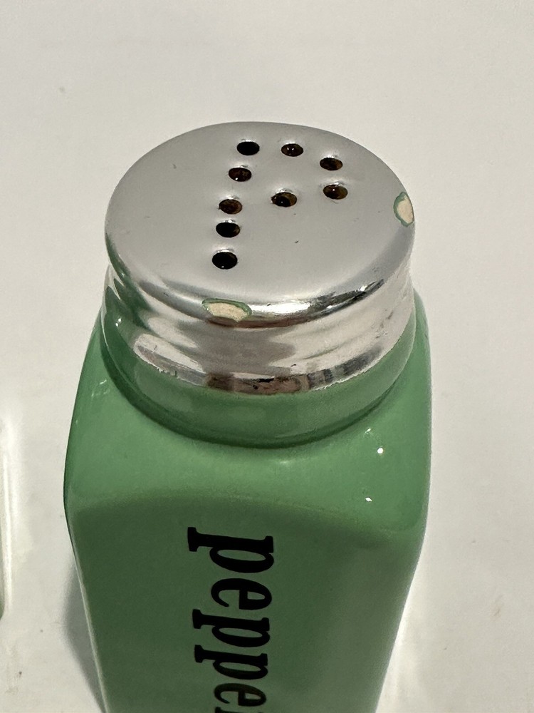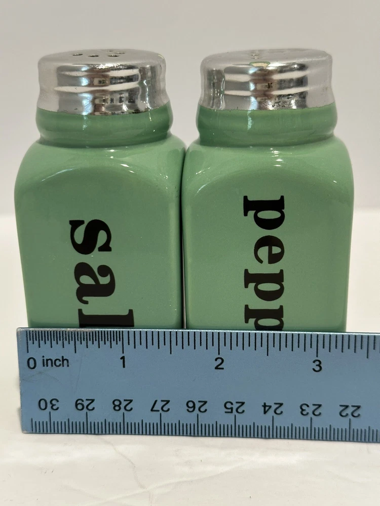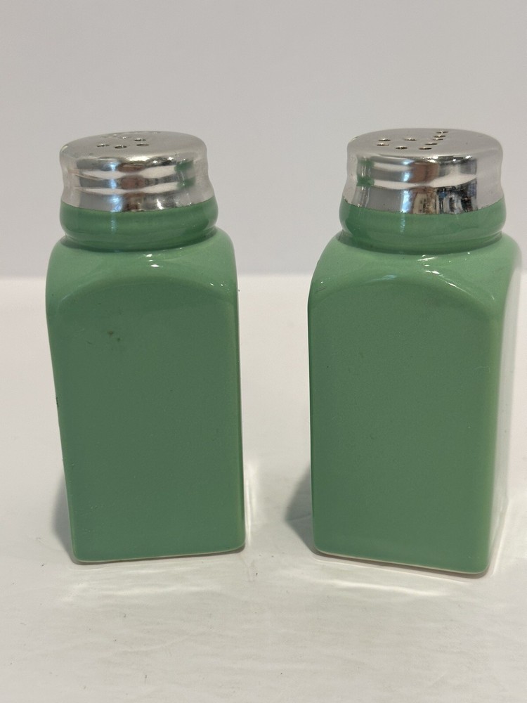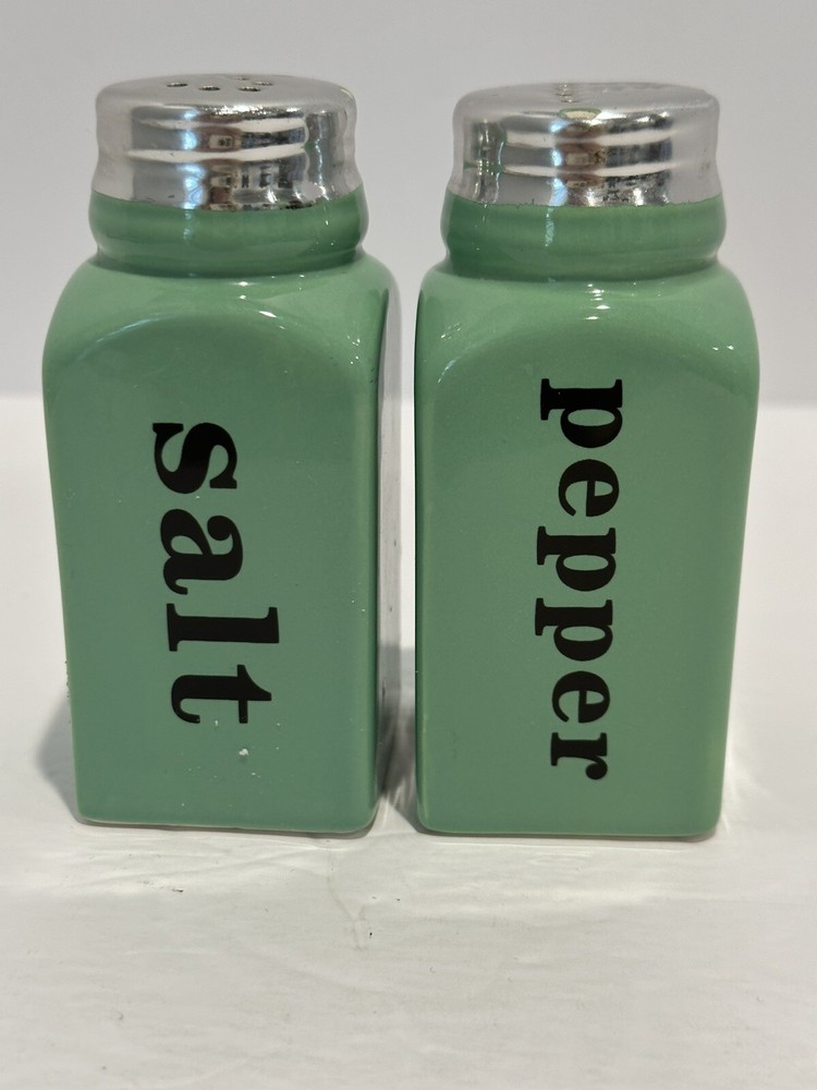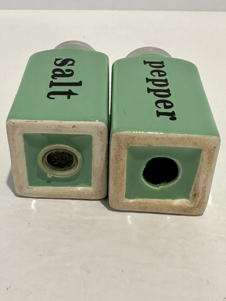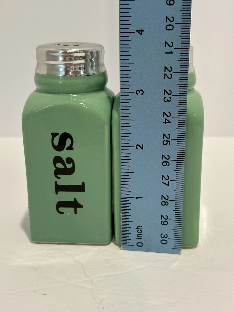 Mint Green Ceramic Salt And Pepper Shakers, Design Imports. 4 In. Tall. Condition is Used. Shipped with USPS Ground Advantage. Has some small paint chips and 1 missing stopper. See photos....
