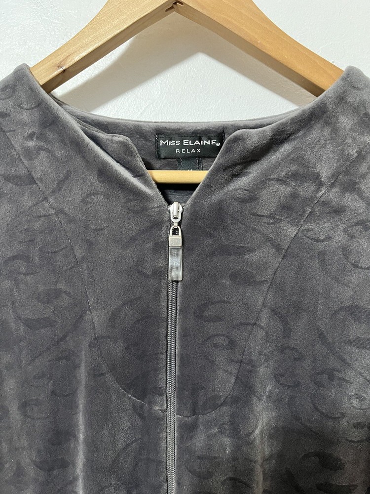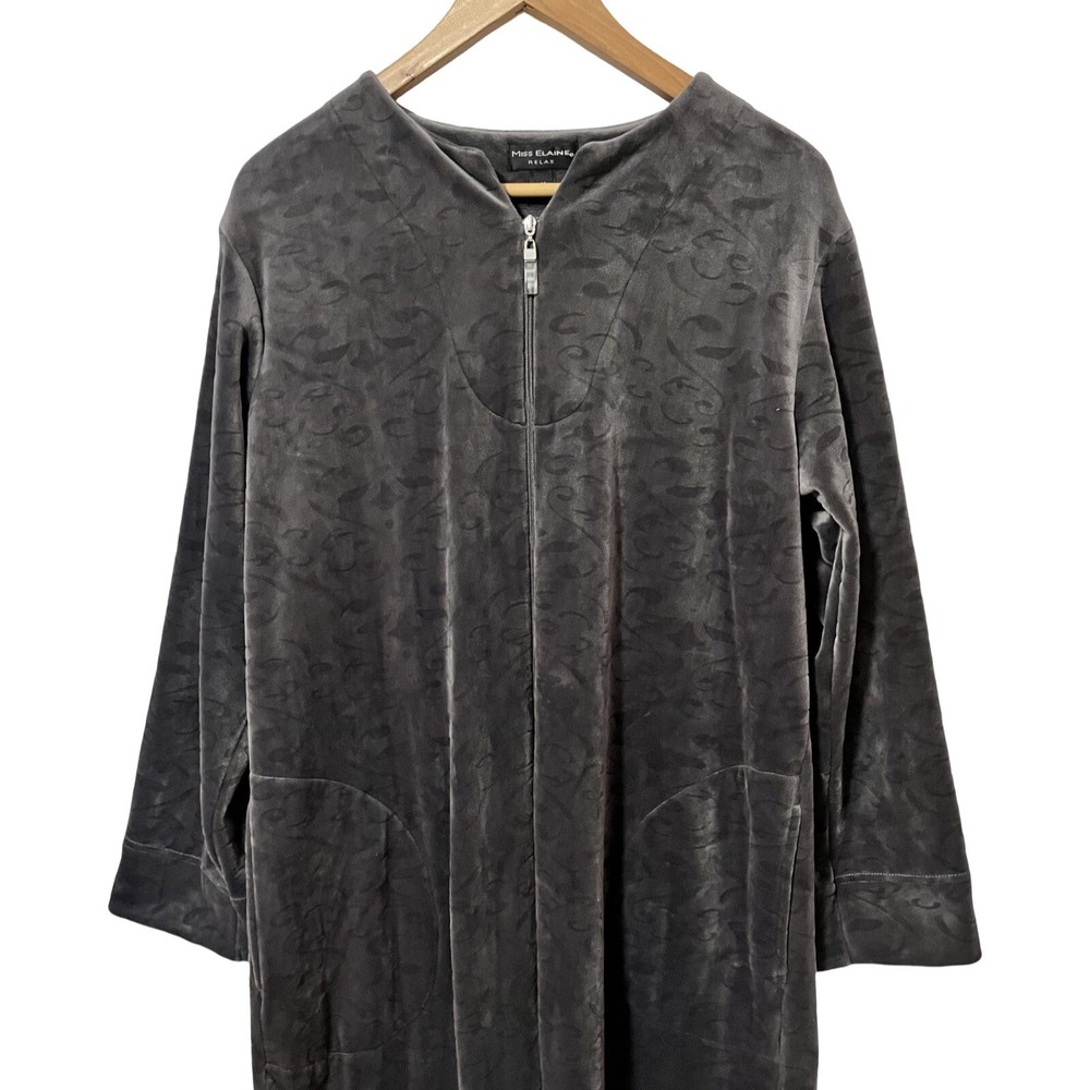 Cozy up in this warm and comfortable Miss Elaine fleece long zip front nightgown. The solid gray color and round neckline with long sleeves make it perfect for everyday loungewear. The gown features a zipper closure and side pockets for added style. It is made of soft fleece fabric which is machine washable for easy care. Approximate Measurements: Length: 47" Armpit to armpit: 24" Sleeve length: 21" Please note: All measurements are approximate and taken laying flat. Color may vary slightly in real life due to photo quality/lighting.