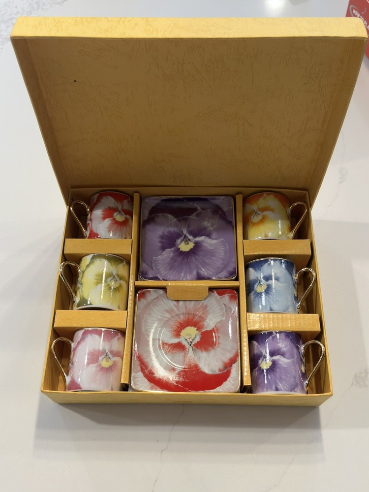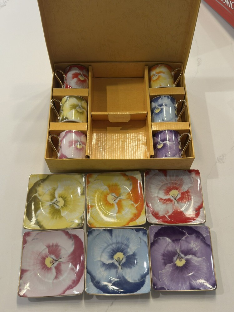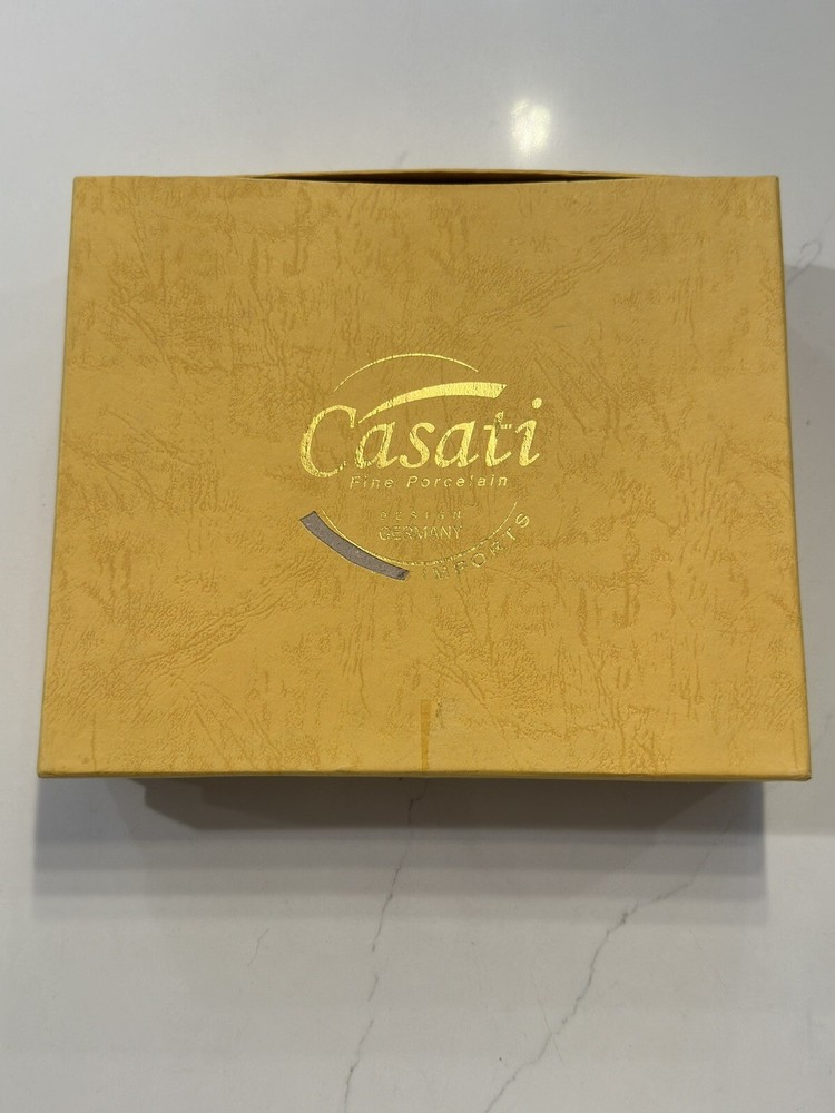 This mixed lot of 6 Casati Fine Porcelain German Design cups and saucers is sure to make your coffee or tea time extra special. The cups and saucers are made of high quality porcelain material, are multicolored and come in a set of 2 cups and 4 saucers. These cups and saucers are perfect for those who like to entertain guests. The fine porcelain Casati cups and saucers are imported by Aramco imports. The color and design are reminiscent of German art. Add a touch of elegance to your tea or coffee party by serving your friends and family drinks in these cups and saucers.