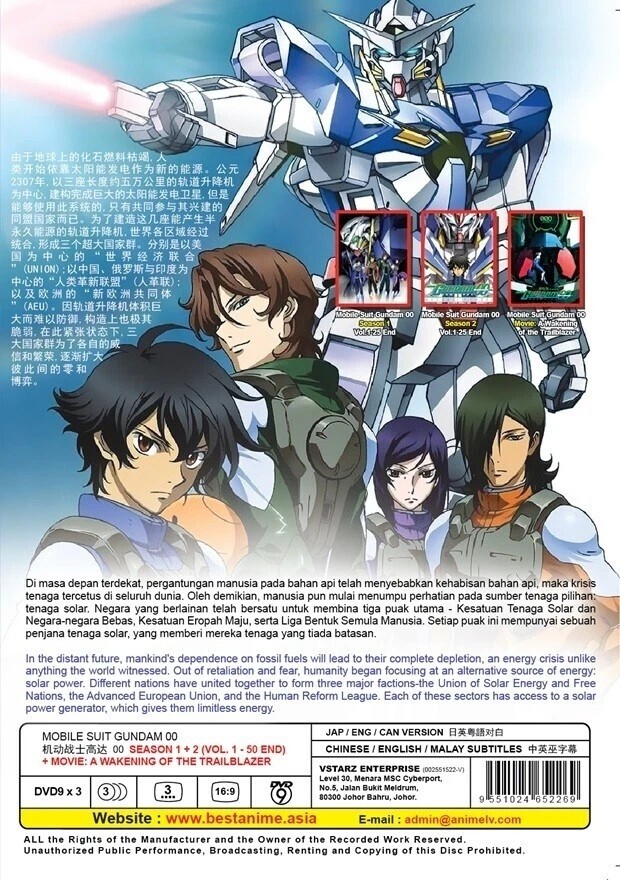 Welcome to Otaku Gift Store! ☆ We Offer ☆ - Standard Economic Shipping ( Takes Around 14-28 Days to arrive ) - Original DVDs from Licensed Publisher in Malaysia ( Certified Hologram & B-Cert ) - Solid Packaging ( Thick Bubble Wrappings ) - Free Anime Keychain One Acrylic Keychain Per DVD Purchase ( As Shown In Illustration ) Mobile Suit Gundam 00 Complete TV Series Volume 1-50 End + Movie Contents: Season 1 (Volume 1-25 End) Season 2 (Volume 1-25 End) Movie : Awakening Of The Trailblazer *NEW! English Audio Dubbed Version Optional: Japanese with English Subtitle ALL Region / Region Free Condition: Authentic Brand NEW, Original Factory Sealed. Episode: 1-50 End + Movie N o. of Discs: DVD x 3pcs Region Code: ALL Region, Region FREE "0" ( Able to play on DVD Players throughout the World ) Audio Language: English / Japanese Subtitles: English / Chinese Return Policy - We accept returns such as defective items or faulty discs and we will provide replacement discs promptly. - Buyer have to pay for the return shipping cost. We truly appreicate any form of support that is given to us and we will ship out your parcel once we've received your order.We take our orders very seriously and governs the flow of shipping transition.Rest assured ! We've got everything covered to make your purchase a pleasant one. P.S : Do not hesitate to message me if there's any problems in transit as well as complaints about the products being sold.We will strive to come out with resolutions to meet up your expectations.