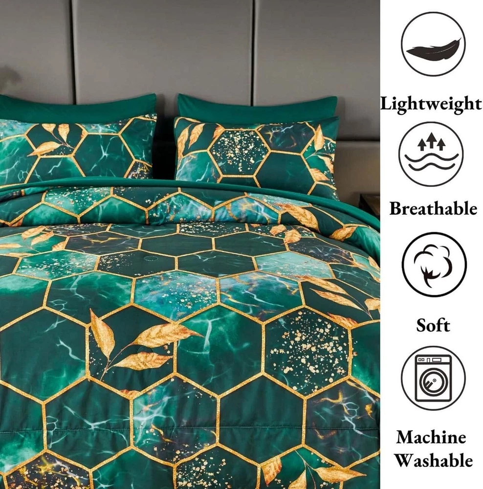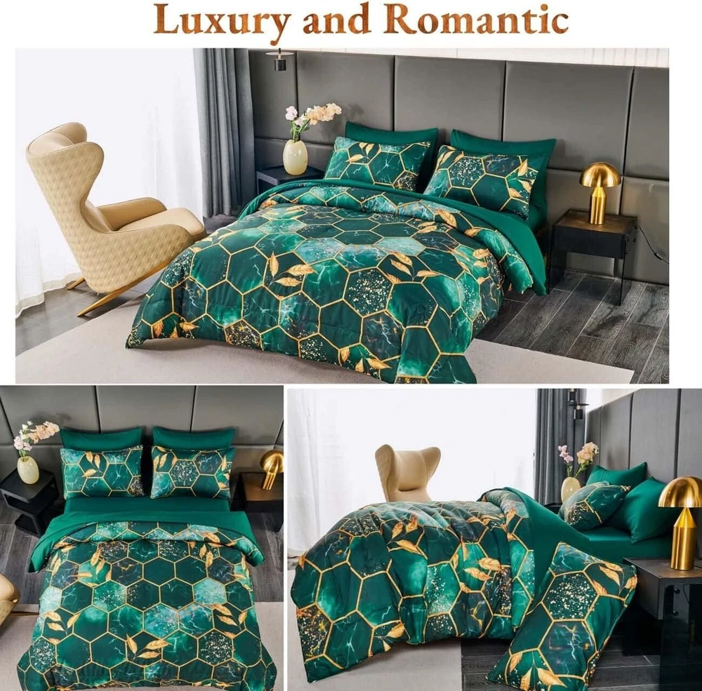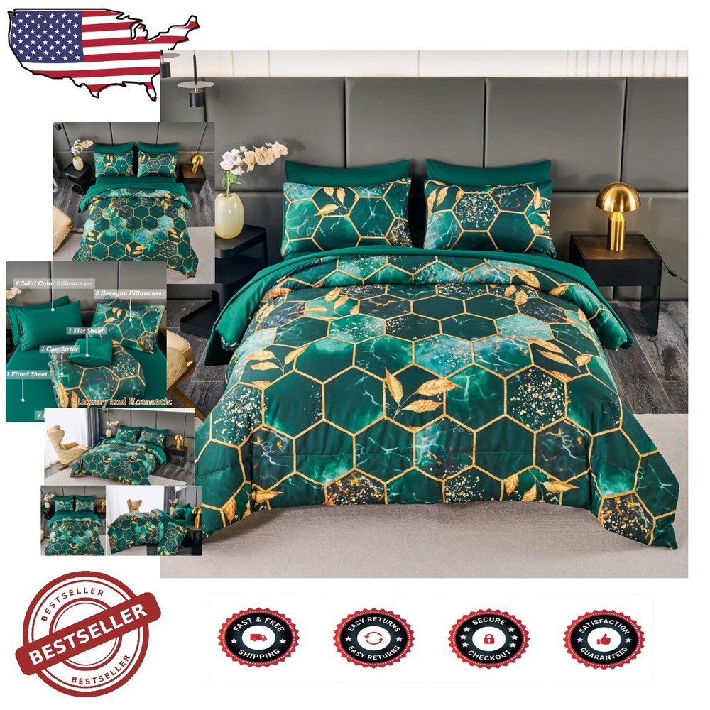 Modern Foil Print 7-Piece Emerald Green Comforter Set with Sheets & Pillowcases ‹ › ‹ › ‹ › ‹ › ‹ › ‹ › ‹ › ‹ › ‹ › ‹ › ‹ › Modern Foil Print 7-Piece Emerald Green Comforter Set with Sheets & Pillowcases Your sanctuary of rest deserves nothing but the utmost elegance. Introducing the Modern Foil Print Comforter Set, an exquisite blend of luxury and comfort tailored for a sophisticated bedroom aesthetic. Features: Quality: Crafted from high-quality brushed microfiber, this bedding set provides an unmatched softness and breathability, ensuring a comfortable sleep environment. Stylish Design: The stri gold geometric design against a rich emerald green background brings a touch of luxury that complements any bedroom decor. -Round Comfort: Ideal for all seasons - keeping you cozy in winter, while remaining breathable for summer nights. Complete Set: This 7-piece size set includes: 1 comforter (104'' x 90''), 1 fitted sheet (78'' x 80'' +16''), 1 flat sheet (102'' x 108''), 2 gold trim hexagon pillowcases (20'' x 36''), and 2 solid color pillowcases (20'' x 36''). Easy Care: Enjoy low-maintenance elegance with machine washable fabric. Simply wash in cold water and air dry for long-lasting beauty. Benefits: Provides a plush, cozy sleeping experience that regulates body temperature. Effortlessly enhances the visual appeal of your bedroom with its modern geometric design. Durable and lightweight fabric guarantees long-term use. Versatile enough to be used with or without a duvet cover, ensuring ease in daily setup. Why Choose Our Comforter Set? This Modern Foil Print Comforter Set seamlessly combines sophistication with functionality, ma it a must-have for those who appreciate luxury in their living space. The stylish geometric pattern not only elevates your bedroom design but also invites comfort to your sleep routine. Embrace elegance and transform your space with this stunning bedding set. Indulge yourself in this perfect blend of luxury and practicality - order your Modern Foil Print 7-Piece Comforter Set today and experience the lavish comfort you deserve! Shipping Free & Fast Shipping - We offer free shipping to most of the USA with a normal delivery time of 3-7 days. However, due to the current situation, additional delivery time (up to 3 weeks) may be required for some items. Alternative Carriers - We may use alternative carriers (e.g. USPS, FedEx, UPS, etc.) to ensure your package arrives safely and on time. Due to the use of multiple carriers, we are unable to provide a tracking number automatically. Handling Time - Orders are processed and shipped within 1-2 business days of receiving cleared payment. Shipping Restrictions - Shipping to Alaska, Hawaii, Puerto Rico, Guam, and other US territories may incur shipping charges or delivery restrictions. Please contact us before ordering, or your order can be refunded/cancelled. State Restrictions - There may be restrictions based on your state of purchase. For example, certain items may not be shipped to California due to state regulations. Contact for Tracking Updates - If you require tracking updates or have any concerns about the delivery of your order, please feel free to contact us, and we will be happy to assist you. Return 30-Day Hassle-Free Returns - We want you to be completely satisfied with your purchase. If you are not, you can return the item within 30 days of receiving it for a full refund or exchange. Easy Return Process - To start a return, simply contact us and we will provide you with a prepaid return shipping label and detailed instructions. Restocking Fee - There are no restocking fees for returns. However, the buyer is responsible for return shipping costs if the return is not due to a seller's error. Refund Processing Time - Refunds will be processed within 5 business days of receiving the returned item in its condition. Payment We accept all major credit cards, PayPal, and Apple Pay for your convenience. Your payment information is secure and encrypted to ensure a safe and seamless transaction. Please complete your payment within 3 days of purchase to avoid any delays in shipping. Feedback Your feedback is extremely important to us. We strive to provide the best products and customer service possible. If you are satisfied with your purchase, please take a moment to leave us a positive review. If you have any concerns or issues with your order, please contact us before leaving negative feedback. We are committed to resolving any problems and ensuring your satisfaction. Contact Us If you have any questions or concerns, please feel free to out to our customer support team. You can contact us through the eBay messaging system. We are available Monday to Friday, 9:00 am to 5:00 pm EST, and we will do our best to respond to your inquiry within 24 hours. Buy it now and enjoy a pleasant shopping experience! Set Includes: Comforter Set,comforter,fitted sheet,flat sheet,gold trim hexagon pillow cases,solid color pillowcases Material: Microfiber,brushed microfiber,microfiber inner fill,polyester Features: Lightweight,breathable,comfortable,soft,durable,easy to care for Theme: Geometric Care Instructions: Machine Wash,machine wash cold,do not bleach,air dry,dry on low temperature Department: Unisex Baby & Toddler,Kids,Teens,Adults Room: Bedroom Size: King Type: Comforter Color: Green Fill Material: Microfiber Pattern: Marble Insulation: All Seasons Number of Items in Set: 7 Style: Geometric Season: All Closure Type: No Closure Thread Count: Unknown GSM (Grams per Square Meter): Unknown