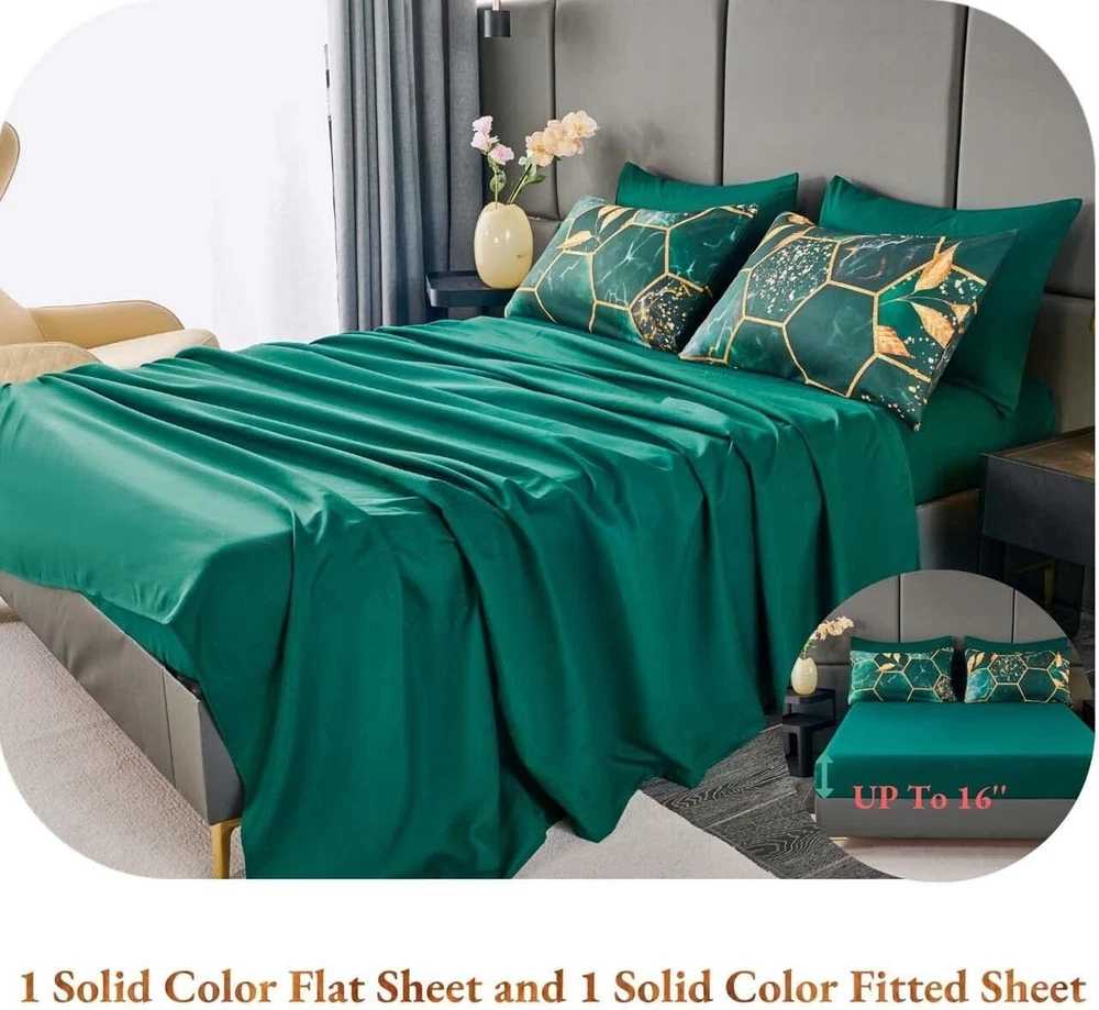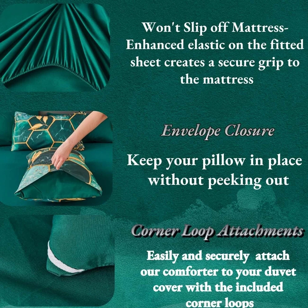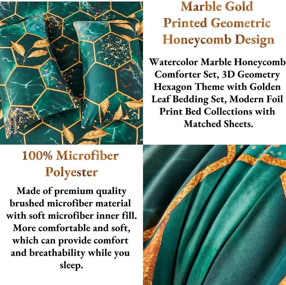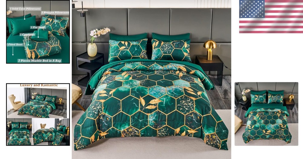 Modern Foil Print 7-Piece Emerald Green Comforter Set with Sheets & Pillowcases ‹ › ‹ › ‹ › ‹ › ‹ › ‹ › ‹ › ‹ › ‹ › ‹ › ‹ › Modern Foil Print 7-Piece Emerald Green Comforter Set with Sheets & Pillowcases Your sanctuary of rest deserves nothing but the utmost elegance. Introducing the Modern Foil Print Comforter Set, an exquisite blend of luxury and comfort tailored for a sophisticated bedroom aesthetic. Features: Quality: Crafted from high-quality brushed microfiber, this bedding set provides an unmatched softness and breathability, ensuring a comfortable sleep environment. Stylish Design: The stri gold geometric design against a rich emerald green background brings a touch of luxury that complements any bedroom decor. -Round Comfort: Ideal for all seasons - keeping you cozy in winter, while remaining breathable for summer nights. Complete Set: This 7-piece size set includes: 1 comforter (104'' x 90''), 1 fitted sheet (78'' x 80'' +16''), 1 flat sheet (102'' x 108''), 2 gold trim hexagon pillowcases (20'' x 36''), and 2 solid color pillowcases (20'' x 36''). Easy Care: Enjoy low-maintenance elegance with machine washable fabric. Simply wash in cold water and air dry for long-lasting beauty. Benefits: Provides a plush, cozy sleeping experience that regulates body temperature. Effortlessly enhances the visual appeal of your bedroom with its modern geometric design. Durable and lightweight fabric guarantees long-term use. Versatile enough to be used with or without a duvet cover, ensuring ease in daily setup. Why Choose Our Comforter Set? This Modern Foil Print Comforter Set seamlessly combines sophistication with functionality, ma it a must-have for those who appreciate luxury in their living space. The stylish geometric pattern not only elevates your bedroom design but also invites comfort to your sleep routine. Embrace elegance and transform your space with this stunning bedding set. Indulge yourself in this perfect blend of luxury and practicality - order your Modern Foil Print 7-Piece Comforter Set today and experience the lavish comfort you deserve! Shipping Free & Fast Shipping - We offer free shipping to most of the USA with a normal delivery time of 3-7 days. However, due to the current situation, additional delivery time (up to 3 weeks) may be required for some items. Alternative Carriers - We may use alternative carriers (e.g. USPS, FedEx, UPS, etc.) to ensure your package arrives safely and on time. Due to the use of multiple carriers, we are unable to provide a tracking number automatically. Handling Time - Orders are processed and shipped within 1-2 business days of receiving cleared payment. Shipping Restrictions - Shipping to Alaska, Hawaii, Puerto Rico, Guam, and other US territories may incur shipping charges or delivery restrictions. Please contact us before ordering, or your order can be refunded/cancelled. State Restrictions - There may be restrictions based on your state of purchase. For example, certain items may not be shipped to California due to state regulations. Contact for Tracking Updates - If you require tracking updates or have any concerns about the delivery of your order, please feel free to contact us, and we will be happy to assist you. Return 30-Day Hassle-Free Returns - We want you to be completely satisfied with your purchase. If you are not, you can return the item within 30 days of receiving it for a full refund or exchange. Easy Return Process - To start a return, simply contact us and we will provide you with a prepaid return shipping label and detailed instructions. Restocking Fee - There are no restocking fees for returns. However, the buyer is responsible for return shipping costs if the return is not due to a seller's error. Refund Processing Time - Refunds will be processed within 5 business days of receiving the returned item in its condition. Payment We accept all major credit cards, PayPal, and Apple Pay for your convenience. Your payment information is secure and encrypted to ensure a safe and seamless transaction. Please complete your payment within 3 days of purchase to avoid any delays in shipping. Feedback Your feedback is extremely important to us. We strive to provide the best products and customer service possible. If you are satisfied with your purchase, please take a moment to leave us a positive review. If you have any concerns or issues with your order, please contact us before leaving negative feedback. We are committed to resolving any problems and ensuring your satisfaction. Contact Us If you have any questions or concerns, please feel free to out to our customer support team. You can contact us through the eBay messaging system. We are available Monday to Friday, 9:00 am to 5:00 pm EST, and we will do our best to respond to your inquiry within 24 hours. Buy it now and enjoy a pleasant shopping experience! Set Includes: Comforter Set,comforter,fitted sheet,flat sheet,gold trim hexagon pillow cases,solid color pillowcases Material: Microfiber,brushed microfiber,microfiber inner fill,polyester Features: Lightweight,breathable,comfortable,soft,durable,easy to care for Theme: Geometric Care Instructions: Machine Wash,machine wash cold,do not bleach,air dry,dry on low temperature Department: Unisex Baby & Toddler,Kids,Teens,Adults Room: Bedroom Size: King Type: Comforter Color: Green Fill Material: Microfiber Pattern: Marble Insulation: All Seasons Number of Items in Set: 7 Style: Geometric Season: All Closure Type: No Closure Thread Count: Unknown GSM (Grams per Square Meter): Unknown