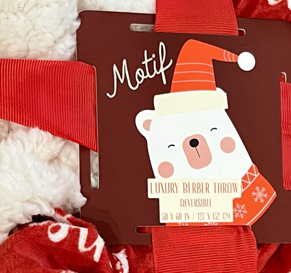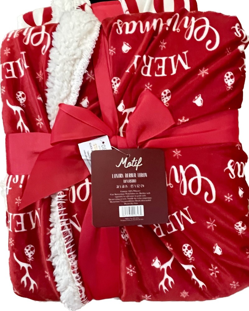 Add a touch of luxury to your holiday décor with this reversible Merry Christmas Luxury Berber Throw Blanket. Measuring 50x60 inches, this rectangular-shaped throw red with MERRY CHRISTMAS Lettering in white. Made of 100% polyester, it is soft, warm, and perfect for all seasons. This contemporary style throw blanket is ideal for any room in your home, including the bedroom, living room, family room, or den. Care instructions are simple, as it is machine washable. Wrap yourself up in this stunning throw and enjoy the cozy comfort it will bring to your space.