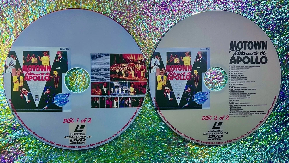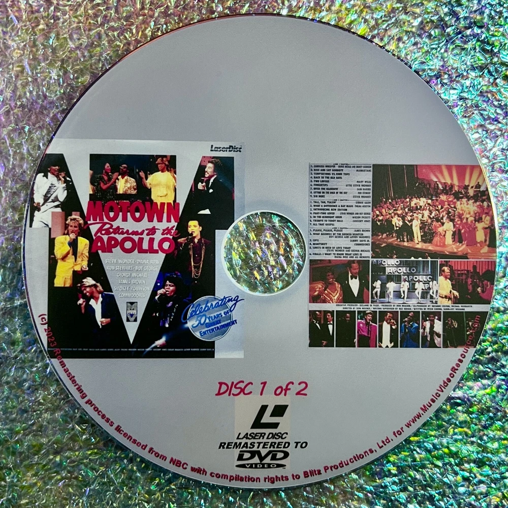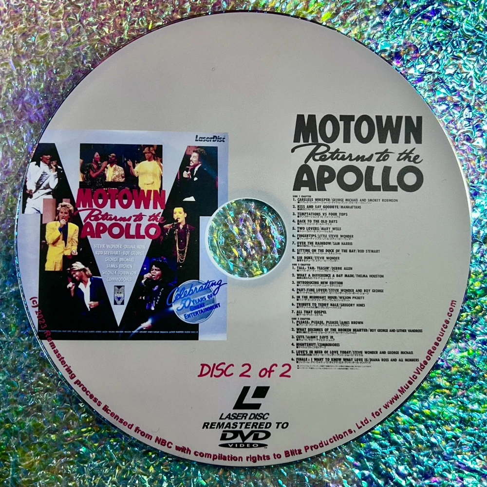 Motown Returns To The Apollo Celebrating 50 Years of Great Entertainment (1985) (Remastered from LaserDisc to DVD) 2 DVD Set OVER 2 HOURS Featuring: George Michael (WHAM!), Boy George (Culture Club), Stevie Wonder, Diana Ross, Luther Vandross, James Brown and MUCH MORE! Description: Motown Returns To The Apollo Celebrating 50 Years of Great Entertainment (1985) (Remastered from LaserDisc to DVD) 2 DVD Set This "Remaster from LaserDisc to DVD" is on line at Music Video Resource and the description below along with any photos of the DVD has been used with permission by Music Video Resource. Remasters: LaserDisc to DVD This special category from MVR displays all the music video collections and live concerts that have been digitally remastered in both picture and sound from the original LaserDiscs with digital audio converted to Dolby Digital 2.0 Sound on DVD. In most cases these titles were offered only on LaserDisc exclusively with some also released in the VHS format. Check individual descriptions for original format history of each title along with track listings and photo of MVR’s exclusive artwork. Each DVD in this series includes beautifully customized artwork that mimics the theme of the original art work that was made exclusively for the LaserDisc release. ALL of these titles offered here have NEVER been released on DVD until now! An entire exclusive selection from your team at MVR. Technical note for ideal listening: If your DVD Player has an optical out and is connected to your amplifier that has a built in decoder in your home entertainment system; you will experience the true dynamic range of the original digital audio recording. Motown Returns To The Apollo Celebrating 50 Years of Great Entertainment (1985) (Remastered from LaserDisc to DVD) 2 DVD Set DESCRIPTION Released exclusively on the long since discontinued and deleted formats of VHS and LaserDisc the following has NEVER been REMASTERED and released on DVD until NOW! This REMASTERED DVD is sourced directly from the original high quality LaserDisc and remastered to DVD for the first time ever! Quality is unmatched as it transferred from the long since deleted LaserDisc Master from OVER THIRTY FIVE years ago. Background: This concert celebrating the 50th anniversary of the Apollo theater was a 3-Hour TV Special that was NEVER released in any format at any time in the USA. This one time broadcast of this hugely popular TV special was released only in Japan on a special Double LaserDisc Set years later in 1993. This Double LaserDisc Set contained an impressive variety of artists and groups totaling over 2 Hours and 25 minutes long and included all of the entire original broadcast. Years later in 2004 a DVD was released again only in Japan. This 2004 DVD (which is no longer available and was never re-issued) contained less than half the content of the original multi LaserDisc release from 1993 with a running time of only 71 minutes. The original release of the Japan only LaserDisc Set was sourced for the REMASTERING of this 2 DVD Set. Still to this day, (apart from Japan) this vintage concert celebration has NEVER been officially released in ANY COUNTRY on DVD until NOW! So here, offered for the first on DVD in its original full length version and in the best possible quality is the REMASTERED from LaserDisc to DVD for all collectors of artists such as George Michael, Boy George Stevie, Wonder and so much more! Description: On May 5th, 1985 the Apollo's renovation is celebrated with a 50th Anniversary grand reopening and television special entitled, “Motown Returns to the Apollo Celebrating 50 Years of Great Entertainment”. This TV special aired only one time on American television on May 19th 1985. This remastered 2 DVD set has the ENTIRE 3 HOUR PROGRAM as it originally aired. It's important to note that the running time (as commercials were omitted from the official release) is nearly 2.5 hours which makes this particular version the most complete version of this concert celebration anywhere in the world. Content: Performance of music and dance, interspersing live performances with archival films and pre-recorded segments (titled Apollo memories and Apollo backstage) featuring brief statements by performers and audience members. Among the evening's offerings are a re-creation of the Motown Revue; a tribute to female performers titled "Tall, tan, teasin'"; Gregory Hines' tribute to dancer Teddy Hale; a tribute to the great tap dancers of the past and present and a celebration of the music of Jackie Wilson, Otis Redding, Sam Cooke, and Marvin Gaye. Host: Bill Cosby Performances: George Michael, Smokey Robinson, The Manhattans, The Cadillacs, The Drifters, The Four Tops, Willie Tyler and Lester, Mary Wells, Martha Reeves, Stevie Wonder, Sam Harris, Rod Stewart, Billy Preston, Joe Cocker, Patti LaBelle, Jennifer Holliday, Thelma Houston, Marilyn McCoo, Vanessa Williams, Debbie Allen, New Edition, Boy George, Wilson Pickett, Chuck Jackson, Little Richard, Gregory Hines, Mavis Staples, Al Green, New Jersey Mass Choir, Sarah Vaughan, Billy Eckstine, James Brown, Luther Vandross, Sammy Davis, Jr., Bunny Briggs, Chuck Green, Gregg Burge, Ludie Jones, Jimmy Slyde, Sandman Sims, Harold Nicholas, The Commodores, DeBarge as a group and El DeBarge (solo), Lou Rawls and Diana Ross Performers appearing only in archival footage: Richard Pryor; The Vandellas; The Contours; The Supremes; Marvin Gaye; The Marvelettes; The Miracles; Moms Mabley; Duke Ellington; Cab Calloway; Lena Horne; Fats Domino, Bo Diddley, Tina Turner, Jimmie Lunceford; Nat King Cole; Buck and Bubbles; Bill "Bojangles" Robinson; Tip, Tap & Toe; Fayard Nicholas; Berry Brothers; Coles and Atkins; Peg Leg Bates and Little Buck; Dewey "Pigmeat" Markham Original Concert Celebration was named as “Motown Returns to the Apollo Celebrating 50 Years of Great Entertainment” which was recorded LIVE at the Apollo Theater on May 5, 1985 New York, New York USA which received 10