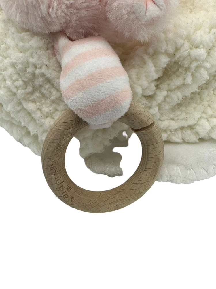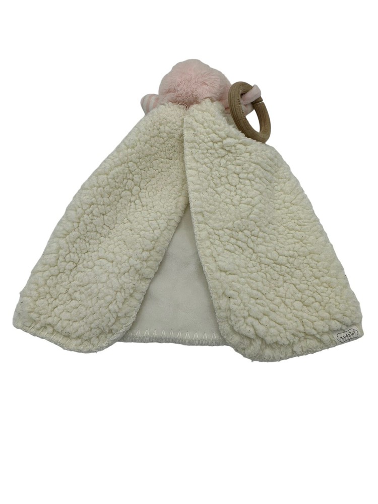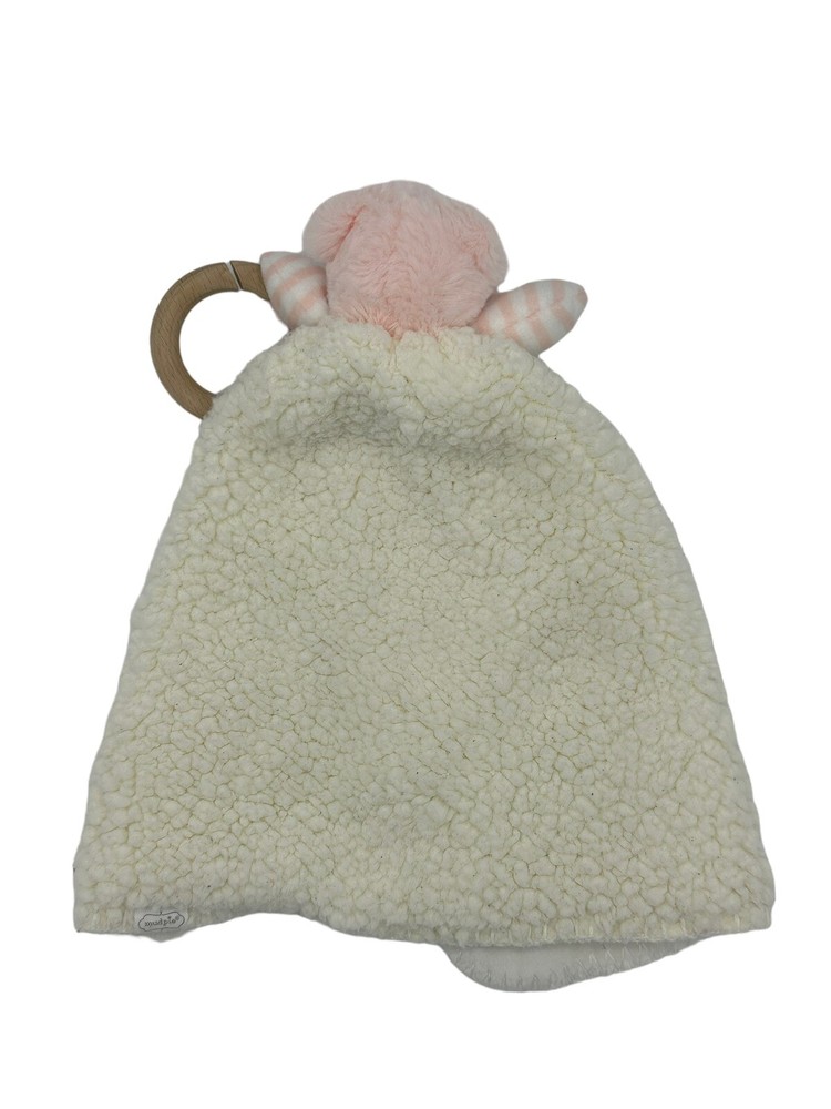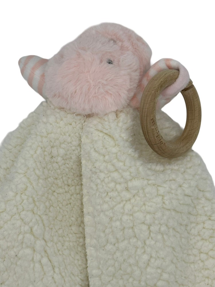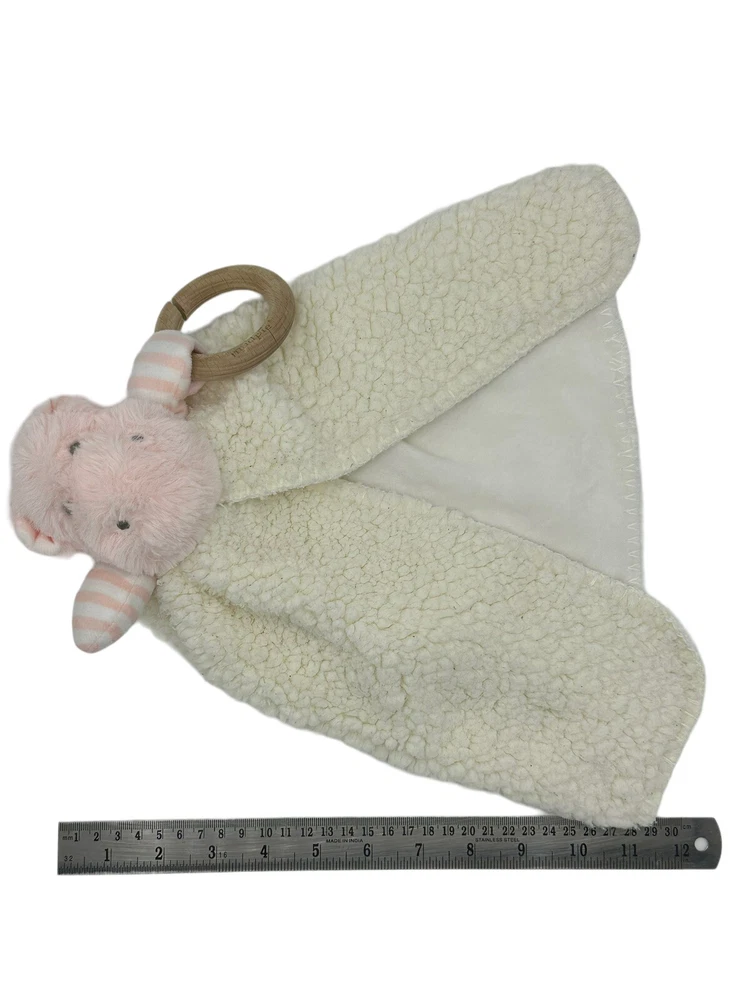 Adorable pink hippo lovey security blanket from Mudpie. The hippo head is pink with pink and white striped arms. The lovey is a sheepskin type material on one side and a soft fleece on the other side. This lovey has the wooden ring in the left hand. This measures 15".
