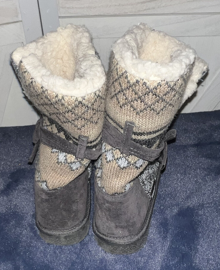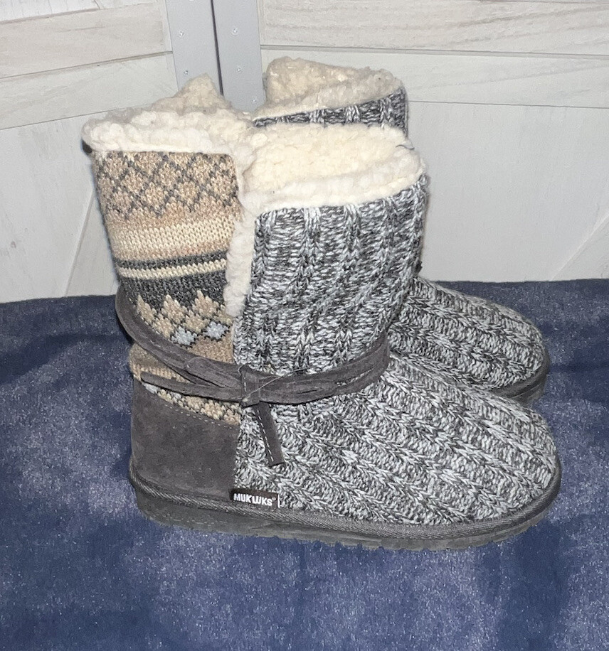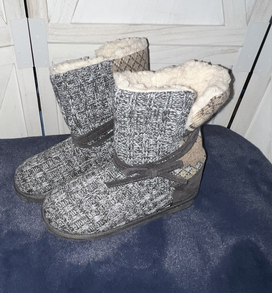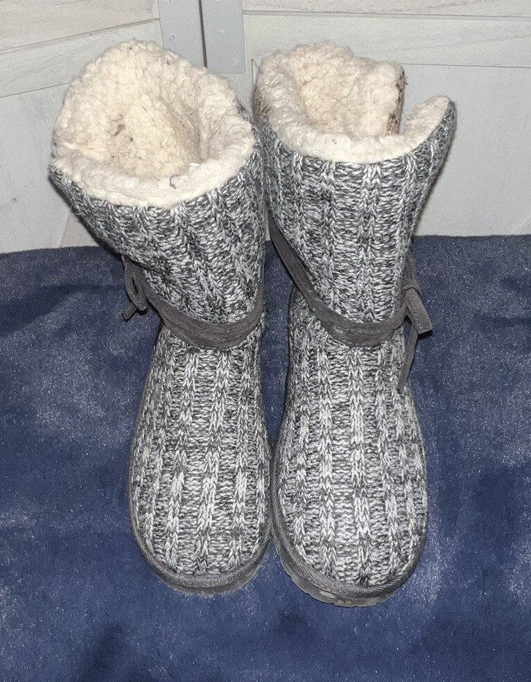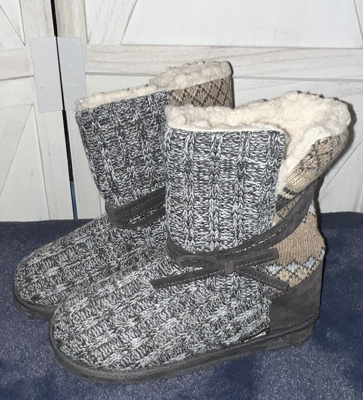Stay warm and stylish this winter season with these cozy Muk Luks boots in size 8 for women. The mid-calf, round toe boots are designed with a pull-on closure for easy wear, while the faux fur upper and insole material offer unmatched comfort. The gray color and knit fabric type make them perfect for casual occasions and the rubber outsole material provides durability for winter weather. These snow boots feature a flat heel style and low (1-1.9 in) heel height, making them practical for long walks. A perfect addition to any winter wardrobe, these Muk Luks boots are ideal for staying warm and comfy without sacrificing style.