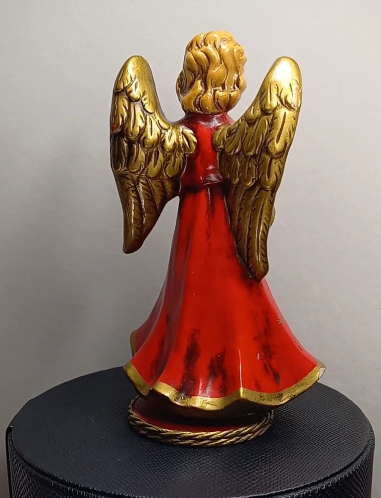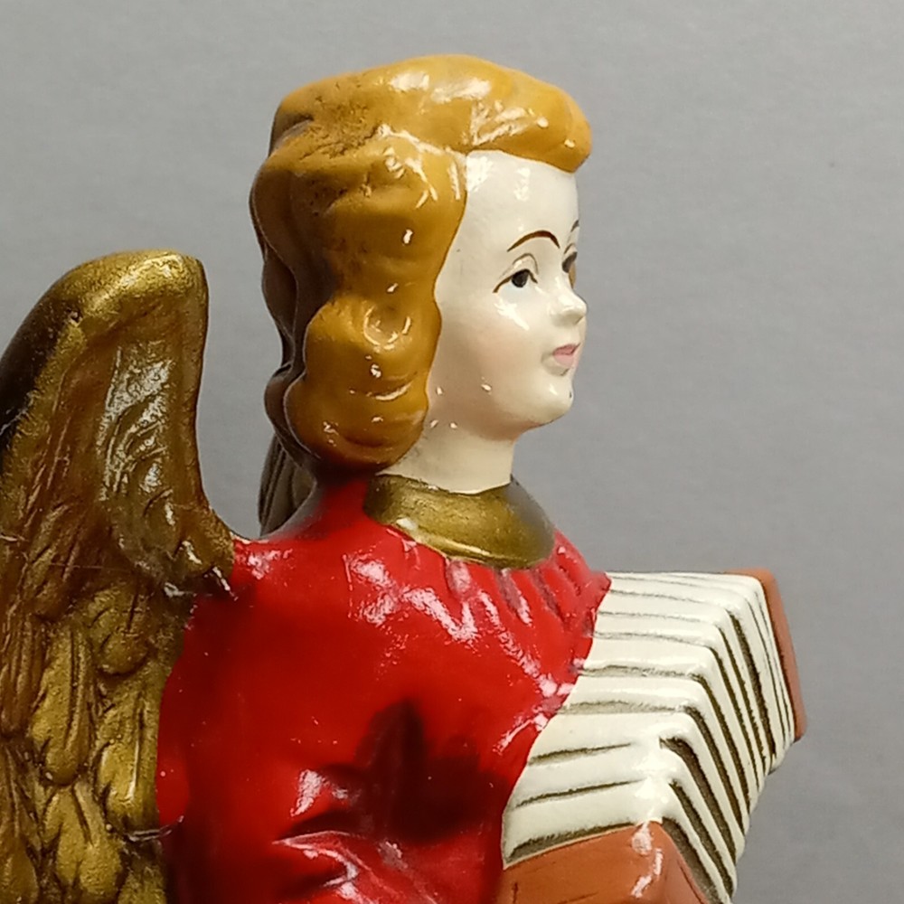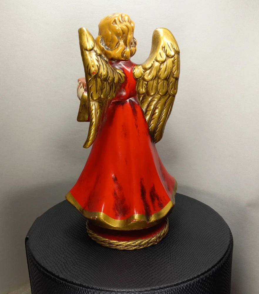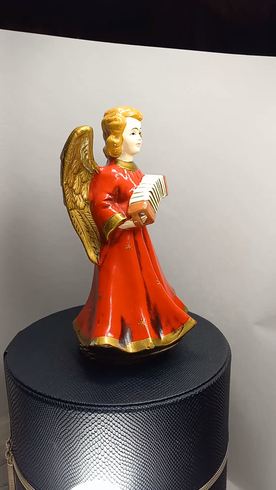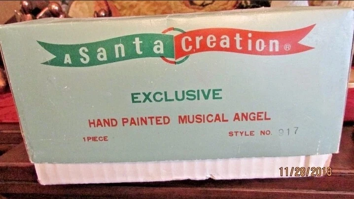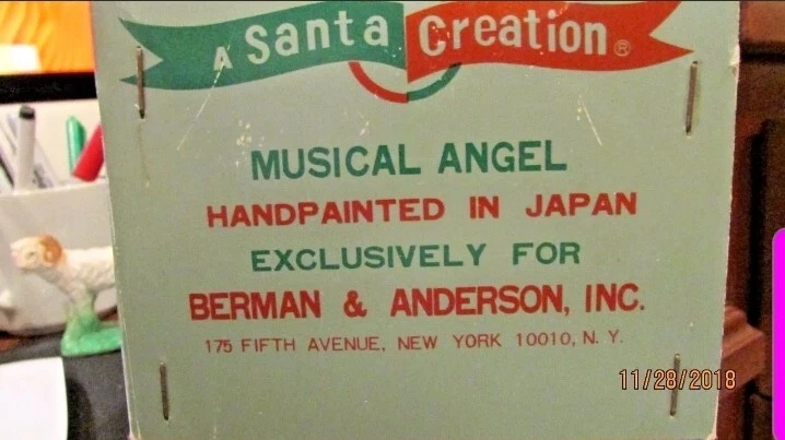 "A Santa Creation Exclusive" hand-painted Musical Angel. 8" tall on a wood rotating base. Plays Silent Night. Starts to make a grinding-like noise during the song (listen in video). Hand painted in Japan exclusively for Berman & Anderson, Inc. The right wing has been broken and glued back together and there's a couple of chips and nicks on the angel's dress (see photos). Style no. 917 *Does NOT come with the box pictured in the last two photos*