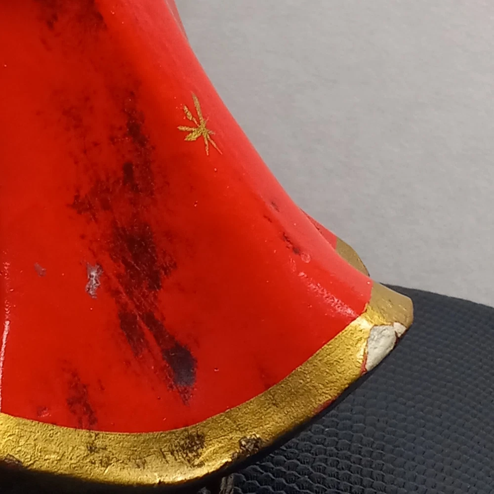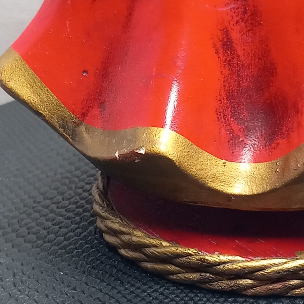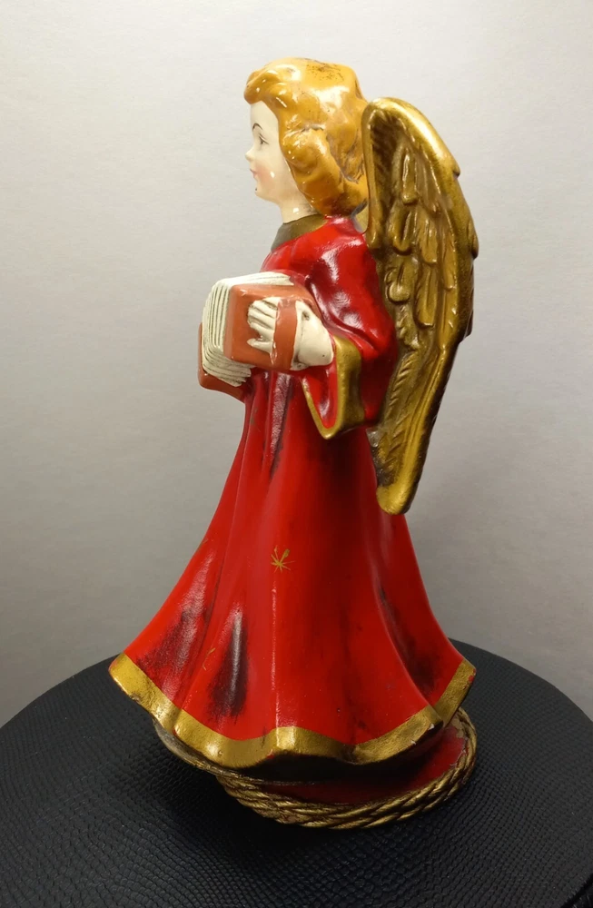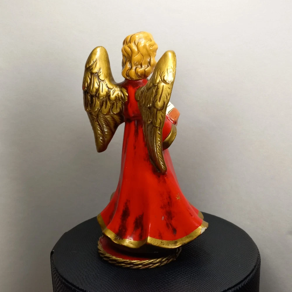 "A Santa Creation Exclusive" hand-painted Musical Angel. 8" tall on a wood rotating base. Plays Silent Night. Starts to make a grinding-like noise during the song (listen in video). Hand painted in Japan exclusively for Berman & Anderson, Inc. The right wing has been broken and glued back together and there's a couple of chips and nicks on the angel's dress (see photos). Style no. 917 *Does NOT come with the box pictured in the last two photos*