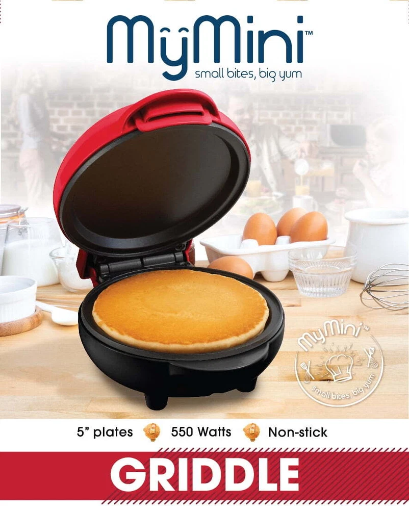 A quick and healthier way to cook eggs, omelets, pancakes, hashbrowns, breakfast sandwiches, quesadillas, pizza, cookies and more. Perfect for breakfast, lunch, dinner, and dessert! The Nostalgia MyMini Griddle is easy to use. Simply plug it in, wait 1-3 minutes until preheated and when the indicator light shuts off you can begin cooking. You can use your own custom ingredients to make so many different recipes to suit vegan meals, keto meals, low-carb diets, and more. QUICK COOKER: Quick and healthier way to cook eggs, omelets, pancakes, hashbrowns, breakfast sandwiches, quesadillas, pizza, cookies and more. Perfect for breakfast, lunch, dinner, and dessert! CUSTOM RECIPES: Use your mini griddle cooker for healthy keto meals, vegan meals, and other alternative or low-calorie meal ideas using your own custom recipes and ingredients. EASY TO USE: Simply plug it in, wait 1-3 minutes until preheated and when the indicator light shuts off you can begin cooking! COMPACT & LIGHTWEIGHT: Its small size makes it an excellent fit for any kitchen, apartment, office, dorm, and camper/RV DUAL-SIDED COOKING SURFACE: Each cooking surface is 5-inches wide - providing quick, efficient and consistent results. The nonstick surface easily wipes clean COOL-TOUCH HANDLES: Cool-touch handle allows you to keep your hands safe when opening and closing lid INDICATOR LIGHTS: The power and preheat indicator light will let you know when it's time to start cooking