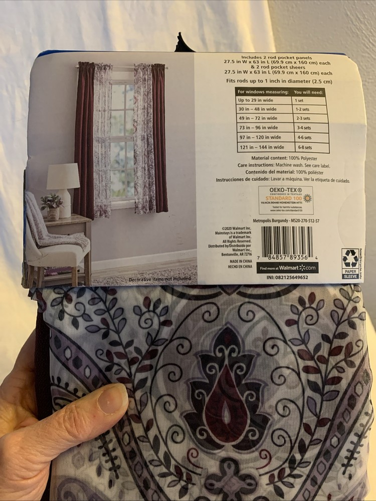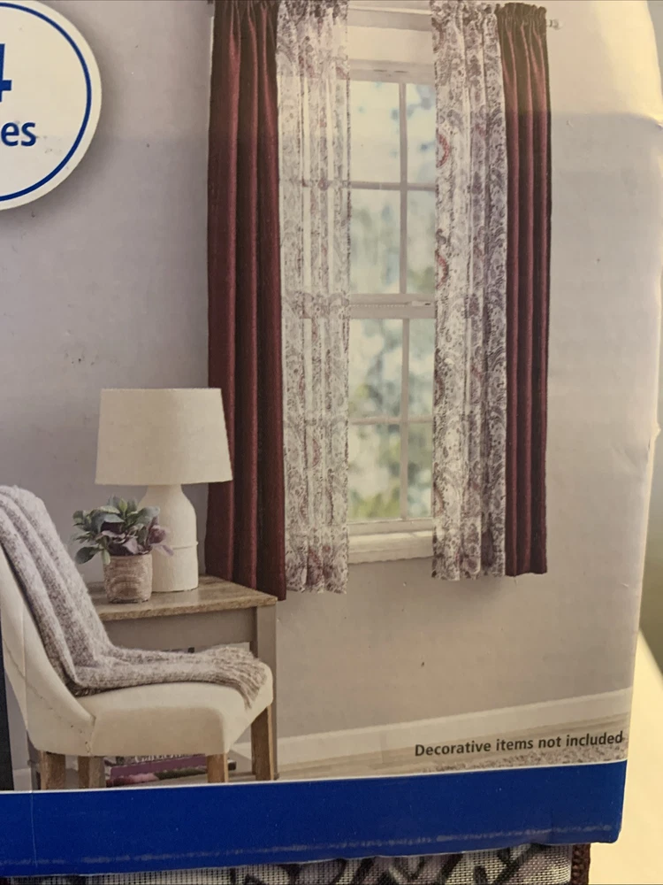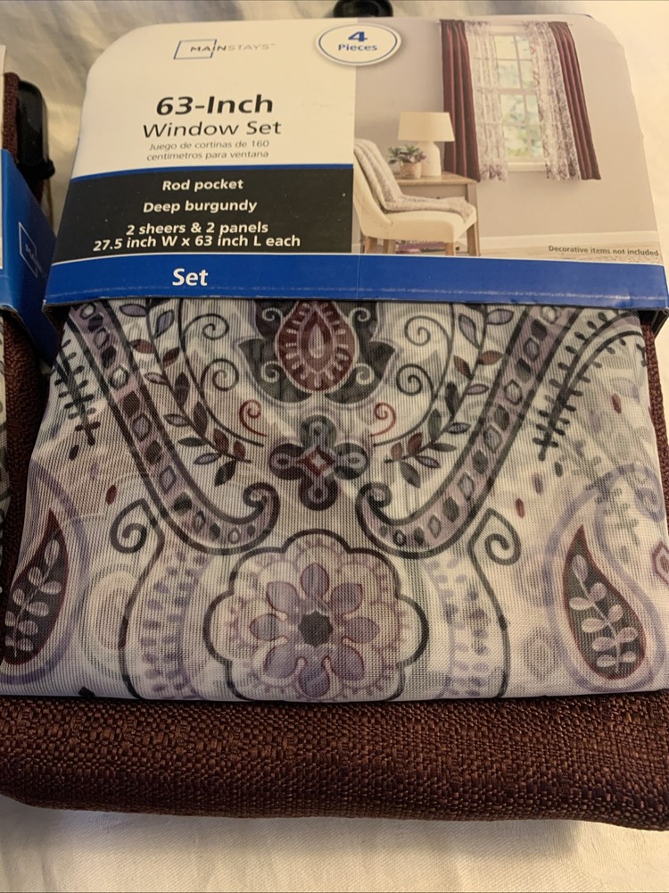 This is a lot of two window curtain sets that include four panels and four sheer panels in a modern style. The curtains are designed in burgundy and gray colors with a solid and paisley pattern, providing a lovely look in any room. They have rod pocket headings for easy installation and are made of polyester material. Each panel measures 63 inches in length and 27.5 inches in width, suitable for adult use in indoor settings. The curtains are light to medium weight. Gray paisley sheers Linen look solid Burgundy panels Please see the picture * This is enough for two average/normal size windows.