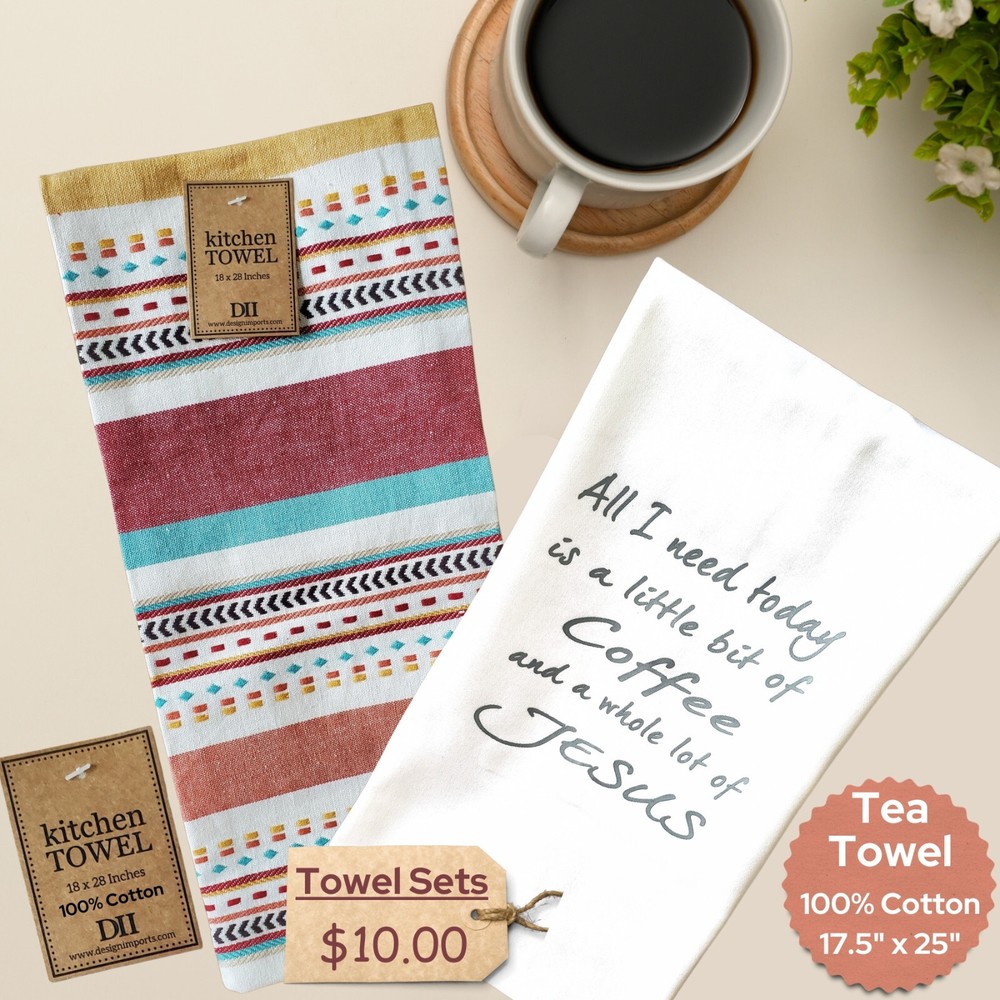 These kitchen towels are absolutely charming! The soft cotton feels high-quality, and the "coffee & Jesus" design is so uplifting. They dry dishes well but look cute enough to leave hanging on display. Perfect for gifting—wonderfully designed, durable, and thoughtful. Love the cheerful colors and meaningful message. A great little pick-me-up for any Christian coffee lover!