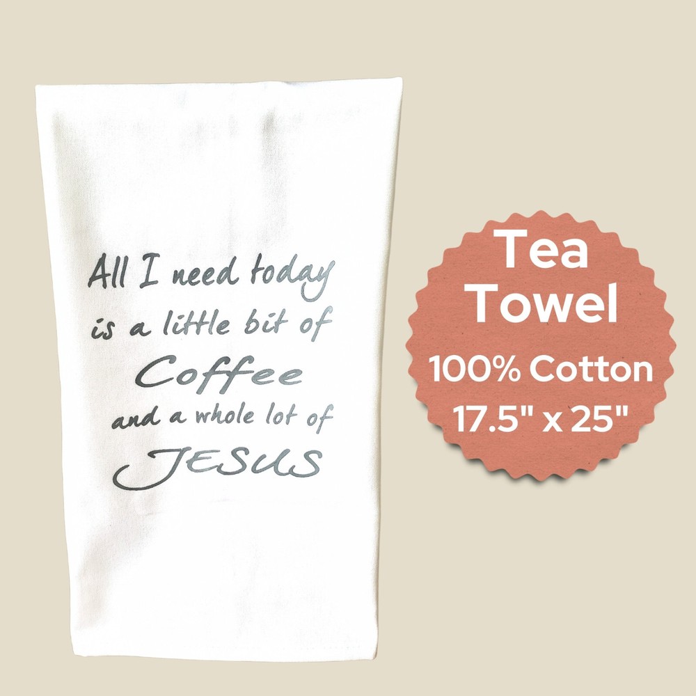This Christian-themed kitchen towel set is the perfect addition to any home. The set includes two unique towels that feature a coffee & Jesus theme, making it a great gift for Mother's Day, Christmas, birthdays, or any other special occasion. The towels are made of high-quality 100% cotton and come in a beautiful multi-color and white design. The white tea towel has the phrase, "All I need today is a little bit of coffee and a whole lot of Jesus" written in dark gray lettering. The towels are multipurpose, making them suitable for use in the kitchen or they can be proudly displayed on the oven door. They are also machine washable, making maintenance a breeze. Get this amazing towel set today and enjoy fast & free shipping! Towels are stored in a Smoke-FREE environment. **Coffee and Flowers Pictured are not included**