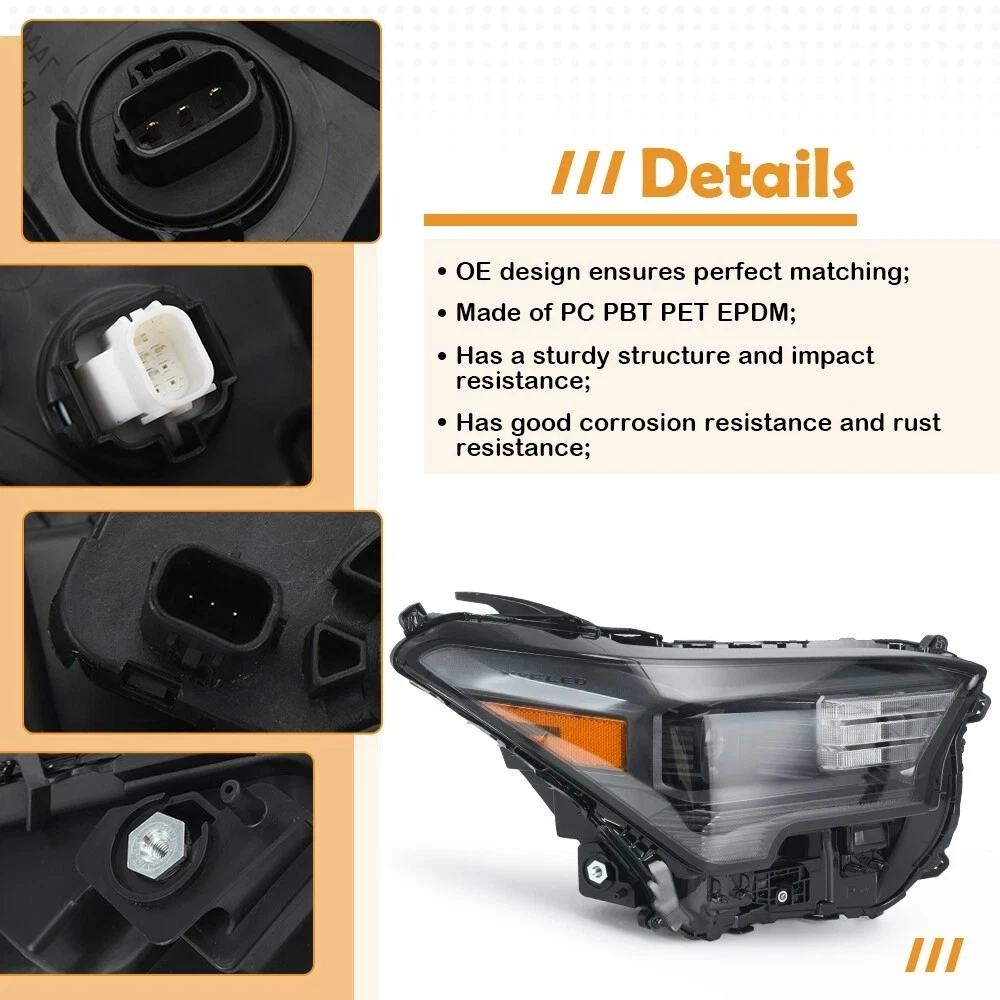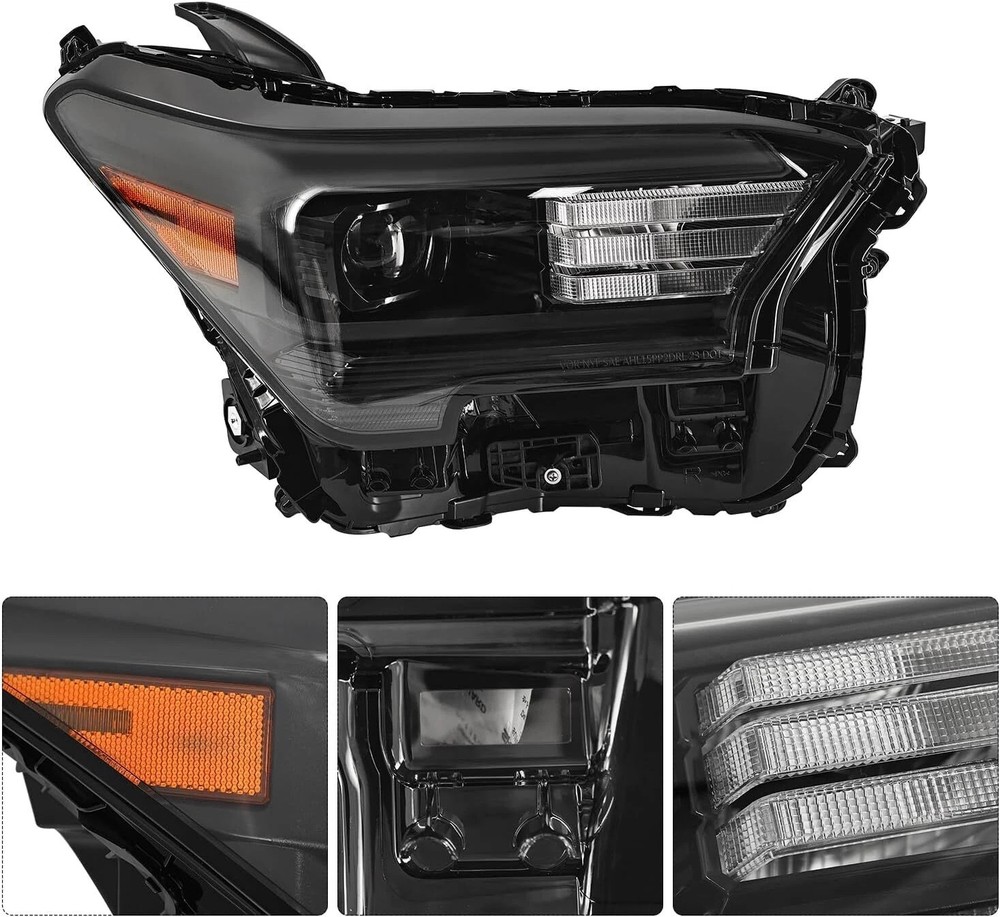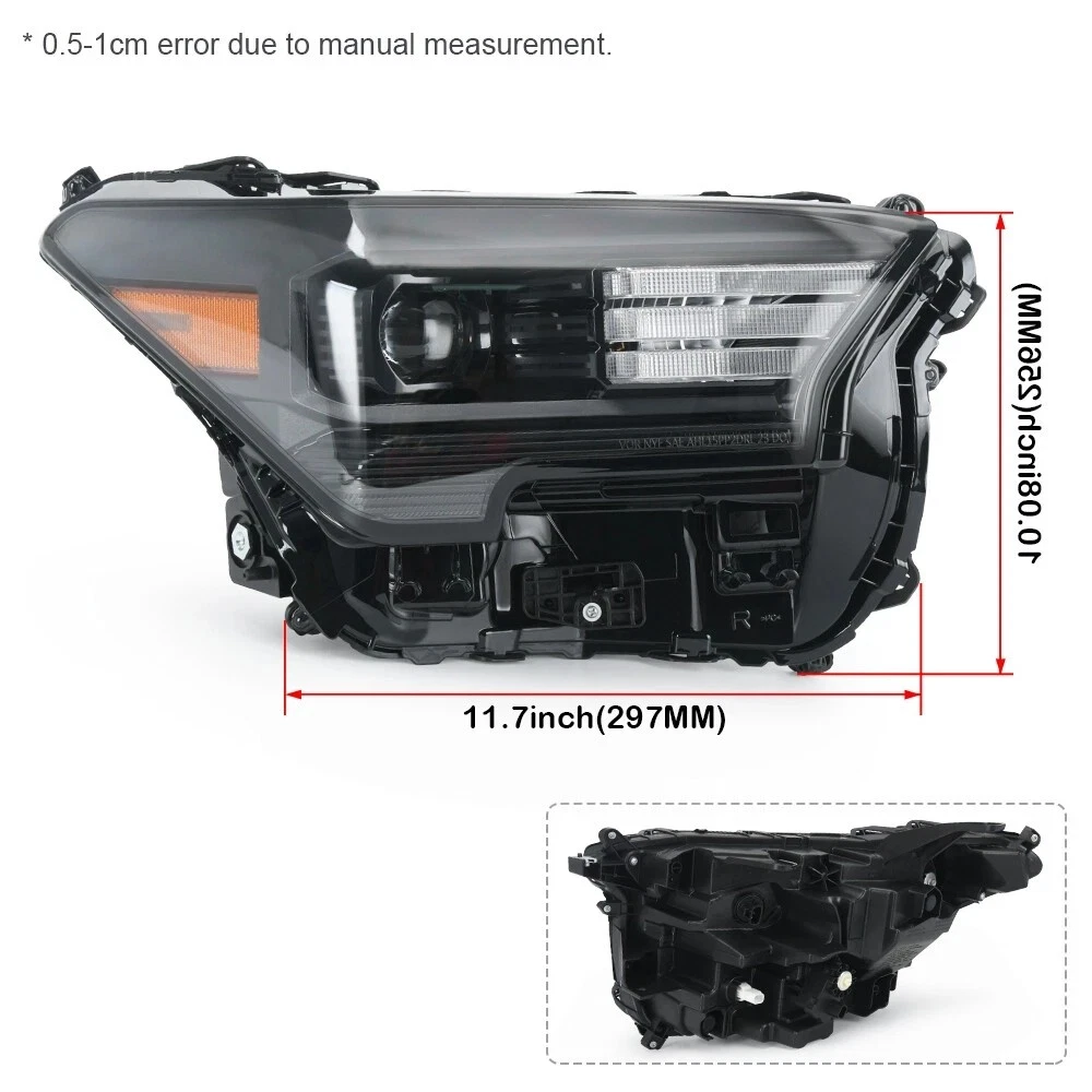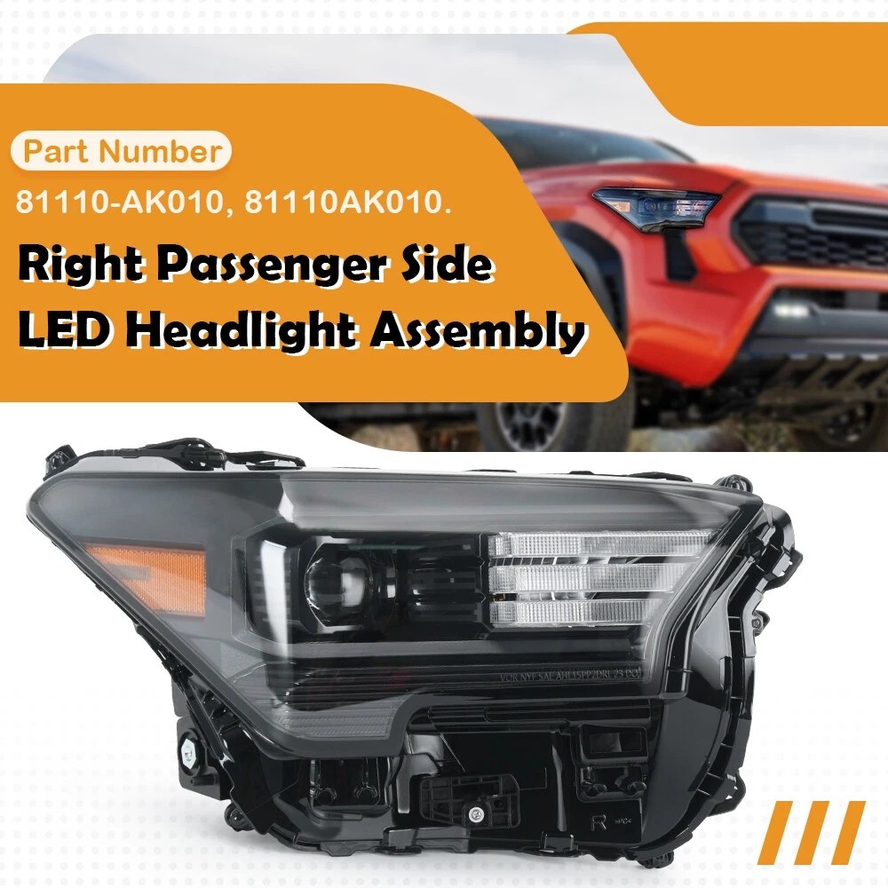 Description: Safe Driving: Our headlights can emit uniform light, improving visibility during night time, heavy rain, snow, or dense fog, enhancing driving safety. Good Sealing Performance: Adopts a fully sealed structure to prevent rain or dust from entering, prolonging the life of the tail light and maintaining it good working condition. Material: Made of PC&PBT&PET&EPDM, it has a sturdy structure, impact resistance, resistance to deformation, corrosion resistance, and can be used in outdoor environments for a long time. Notice: The high and low beams and side lights are LEDs (bulbs ibcluded), the daytime running lights and turn signals are halogen bulbs (not included, use original one) Fitment For Toyota Tacoma 2.4L L4 Engines: Fit for Toyota Tacoma Limited Crew Cab Pickup 4-Door 24-on. Fit for Toyota Tacoma SR5 Crew Cab Pickup 4-Door 24-on. Fit for Toyota Tacoma SR Crew Cab Pickup 4-Door 24-on. Fit for Toyota Tacoma TRD Off-Road Crew Cab Pickup 4-Door 24-on. Fit for Toyota Tacoma TRD Pro Crew Cab Pickup 4-Door 24-on. Fit for Toyota Tacoma TRD Sport Crew Cab Pickup 4-Door 24-on. Fit for Toyota Tacoma Trailhunter Crew Cab Pickup 4-Door 24-on. Fit for Toyota Tacoma HEV Crew Cab Pickup 4-Door 24-24. Fit for Toyota Tacoma Sport Crew Cab Pickup 4-Door 24-24. Right Side Part Number: 81110-AK010, 81110AK010 Package Includes: 1x Right Passenger Side Headlight Assembly On Jul 24, 2025 at 05:12:01 PDT, seller added the following information: