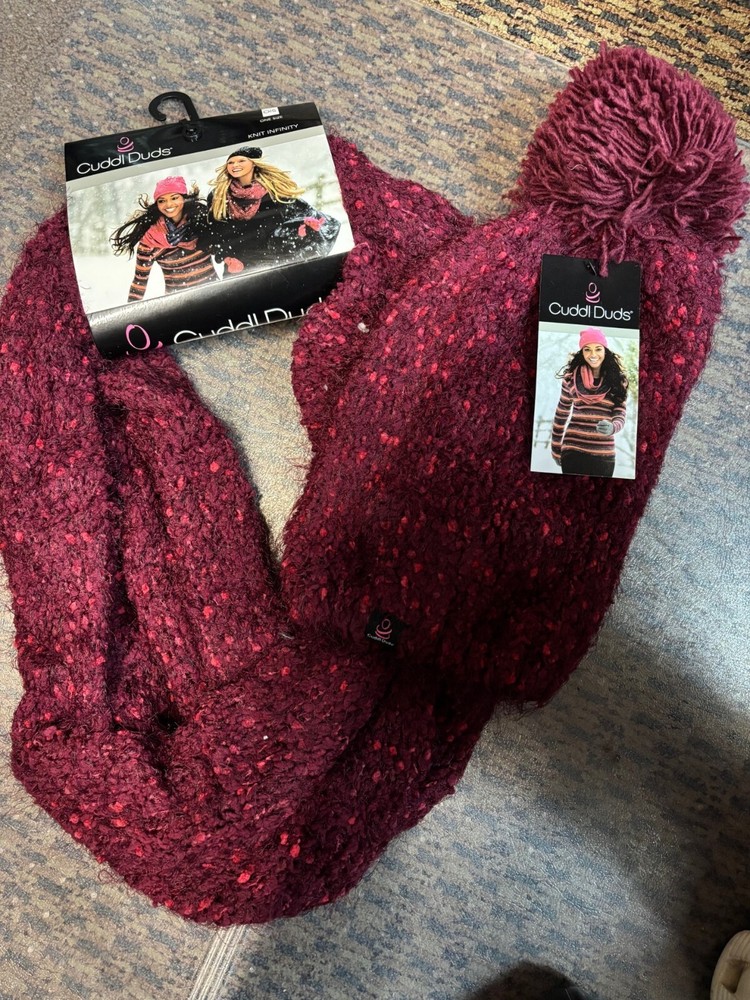 NWT, new with tags. Set of 2 pieces - Live in Layers infinity scarf and beanie hat. Original prices: $58.00 plus tax FABRIC - 74% Polyester/26% Nylon, Pom: 100% Acrylic CARE - Hand wash cold. Use only non-chlorine bleach when needed. Reshape and dry flat. FEATURES - Wear scarf 4 different ways Super soft knit Pom pom detail on top of beanie Infinity styling Mid-weight Beautiful burgundy red and hot pink blend FIT & SIZING One size fits most