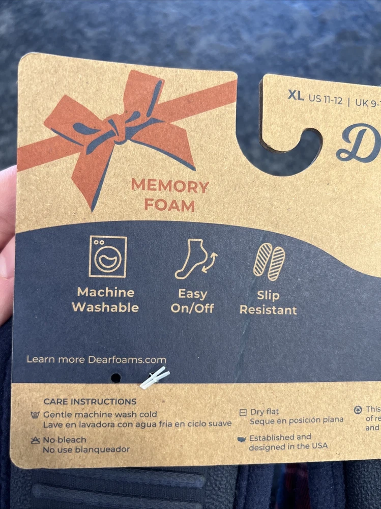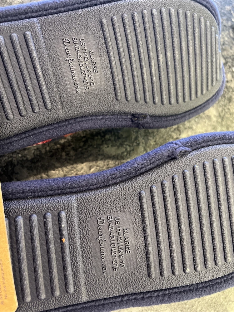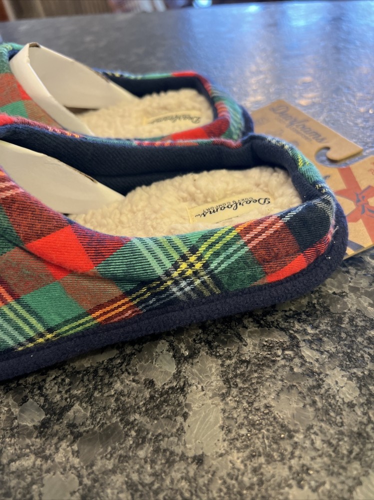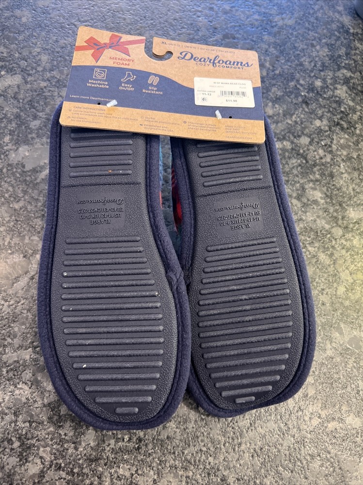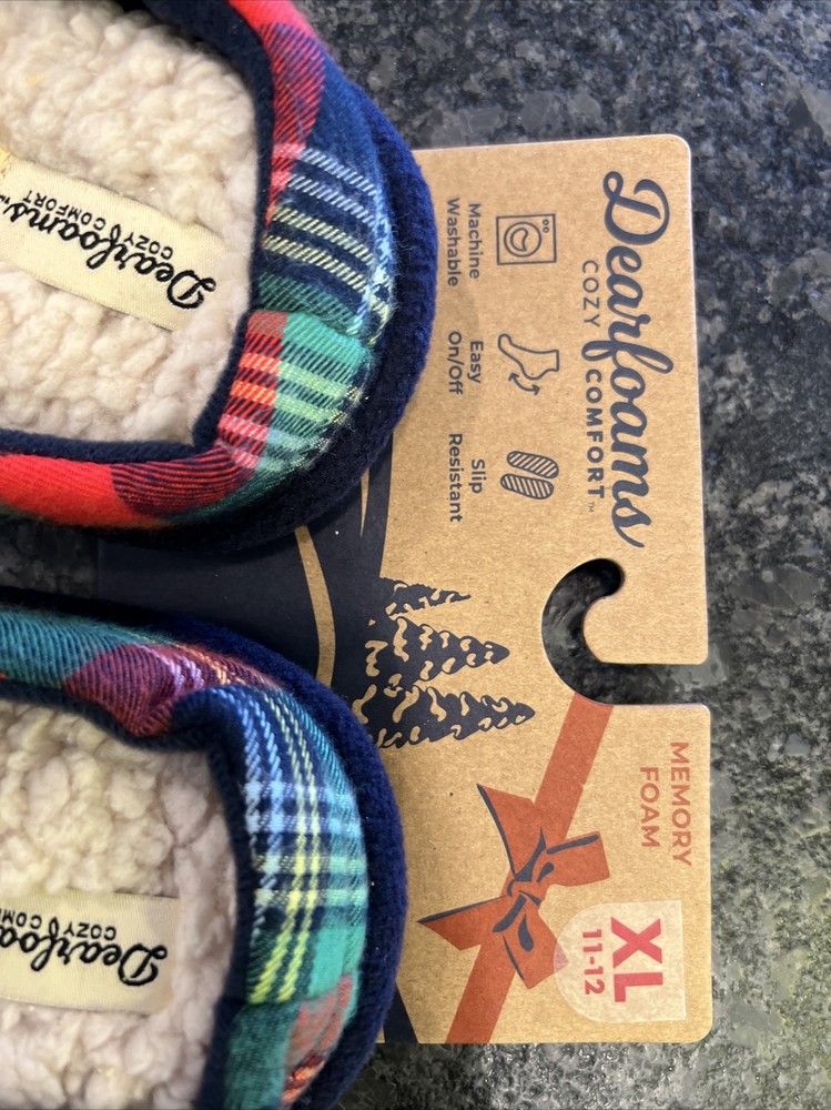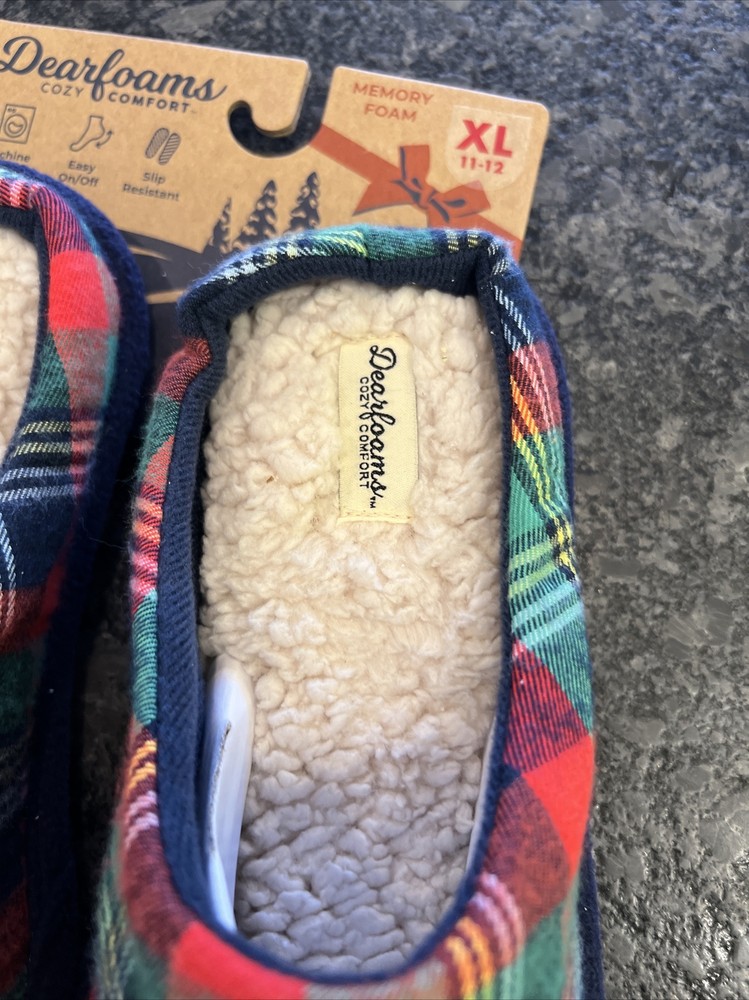 Stay cozy and comfortable with these Dearfoams slip-on slippers featuring a fun plaid pattern and the adorable Mama Bear character. Perfect for holiday or everyday wear, these slippers are made of a soft cotton blend upper material and lined with faux fur for added warmth. The slipper's insole is also made of faux fur for extra cushioning and comfort. These size 11-12 slippers are brand new in original packaging and have never been worn. Ideal for women of all ages, these Dearfoams Mama Bear slippers are a must-have for those looking for a cute and comfortable footwear option.