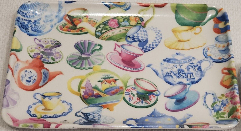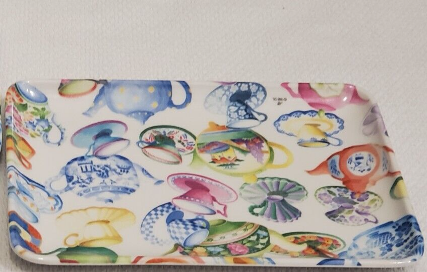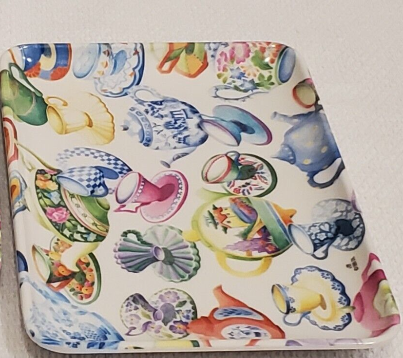 Design Imports Limited - One teapots/tea cups pattern melamine tray . Measures approximately 4" x 6". Item is in new and never displayed condition, from a smoke and pet free home. There is a blemish on the back of one area of the tray that does not have a gloss surface (as when purchased) - See Photos. Shipped via USPS Ground Advantage.