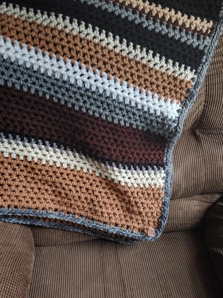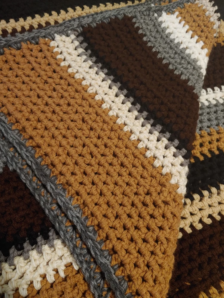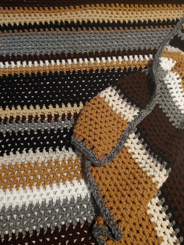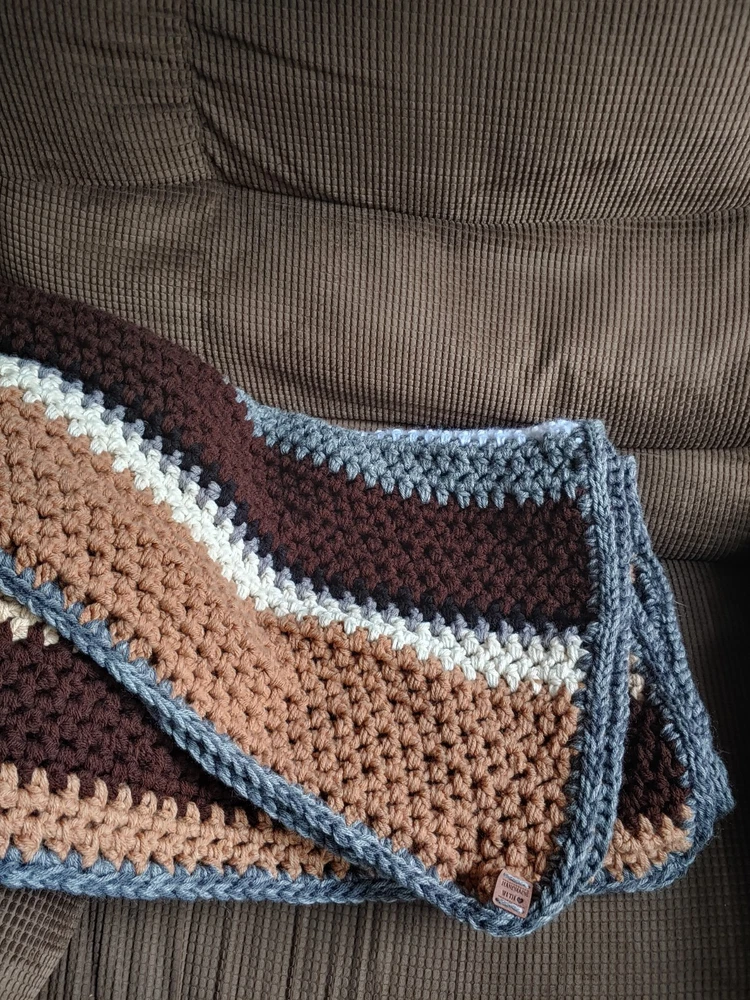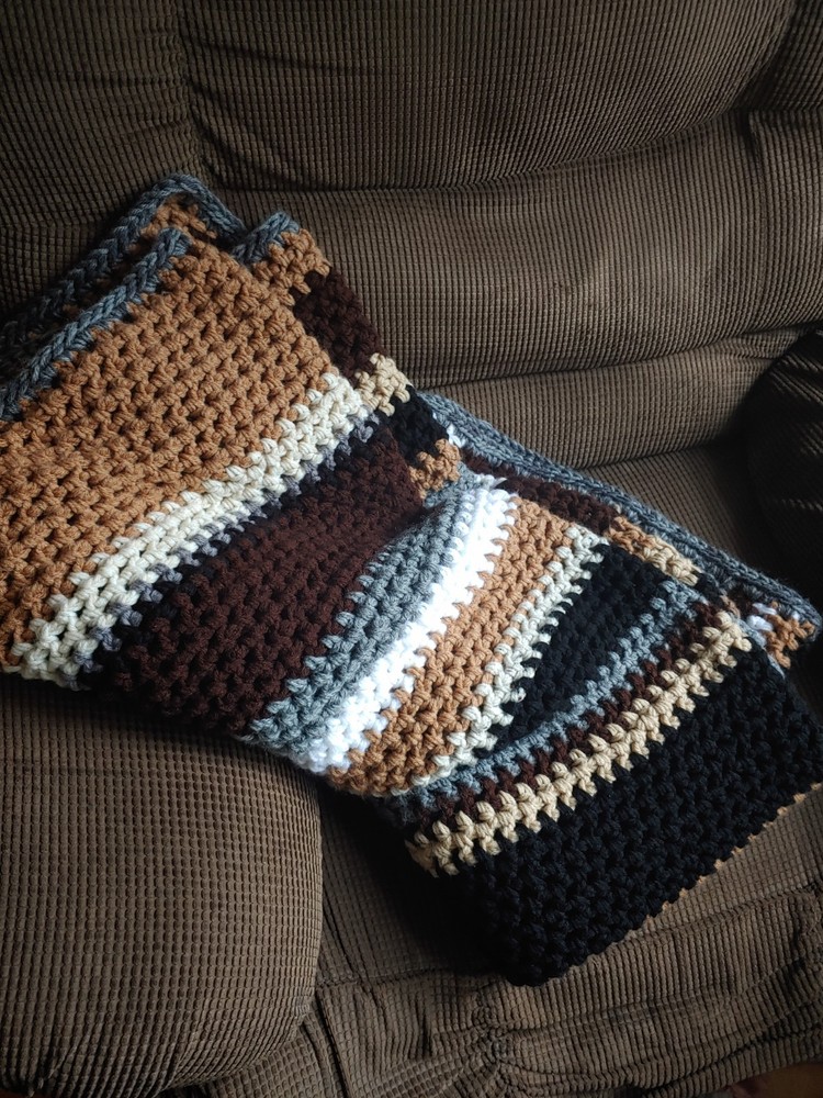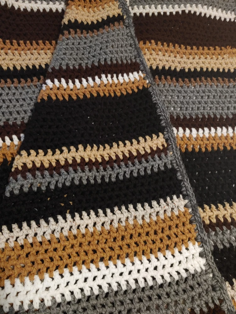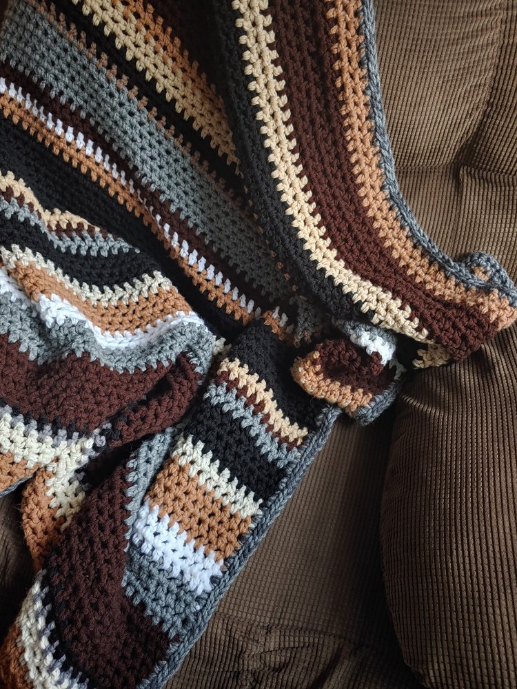 This blanket was handmade by me and it is made out of acrylic yarns. This blanket measures about 66" in width and about 64" in length. It can basically almost completely fit a full-size bed. The yarn weight was made chunky by using two weight 4 yarns together row after row. To care for this blanket, you can machine wash it, but tumble dry low for a very short amount of time (maybe 20 minutes or less than 20 minutes) / air dry it after. Please feel free to ask any questions and please see all photos, thank you :)