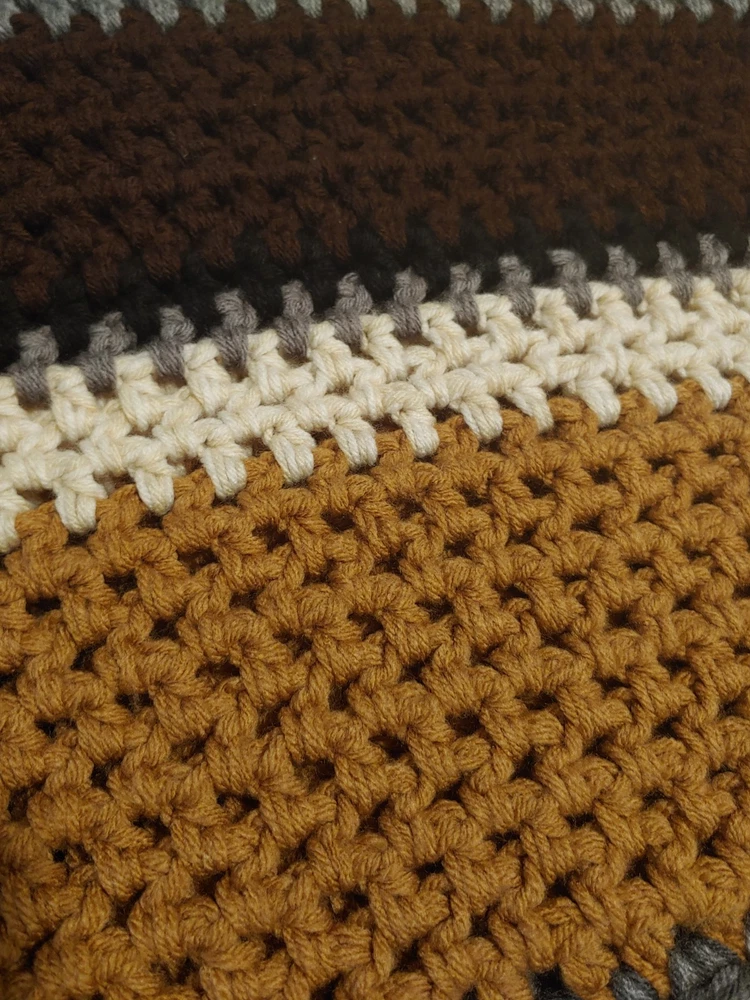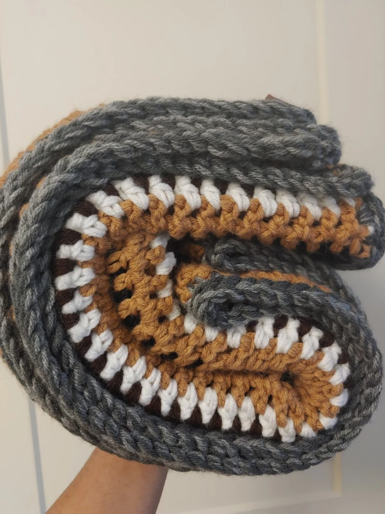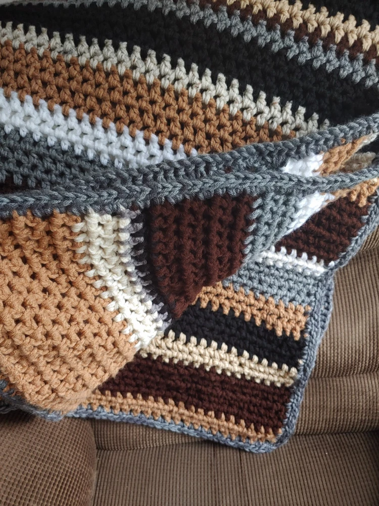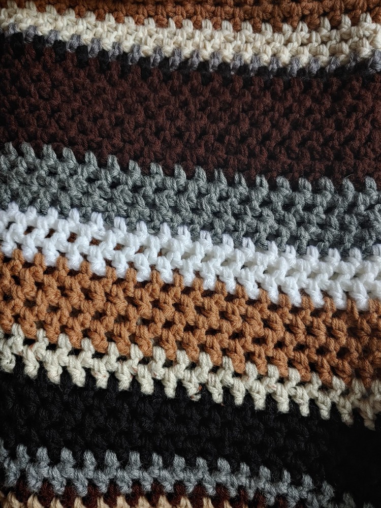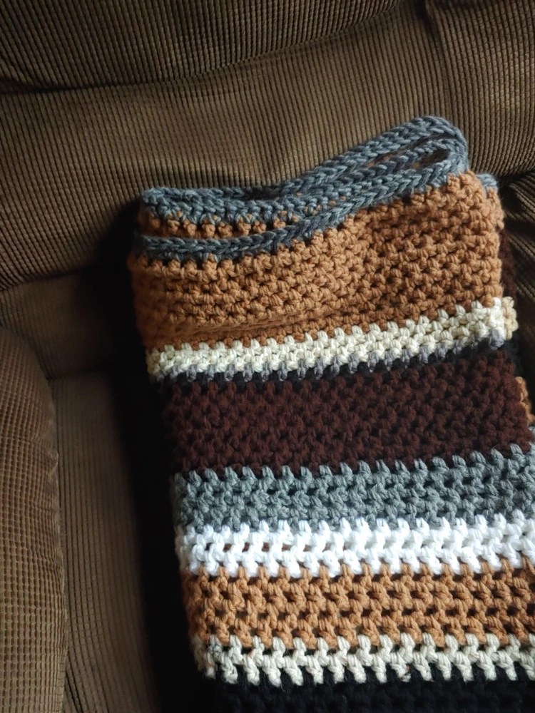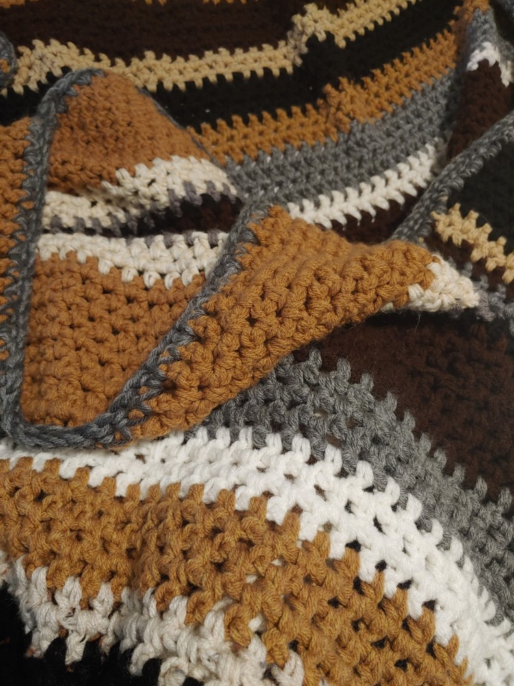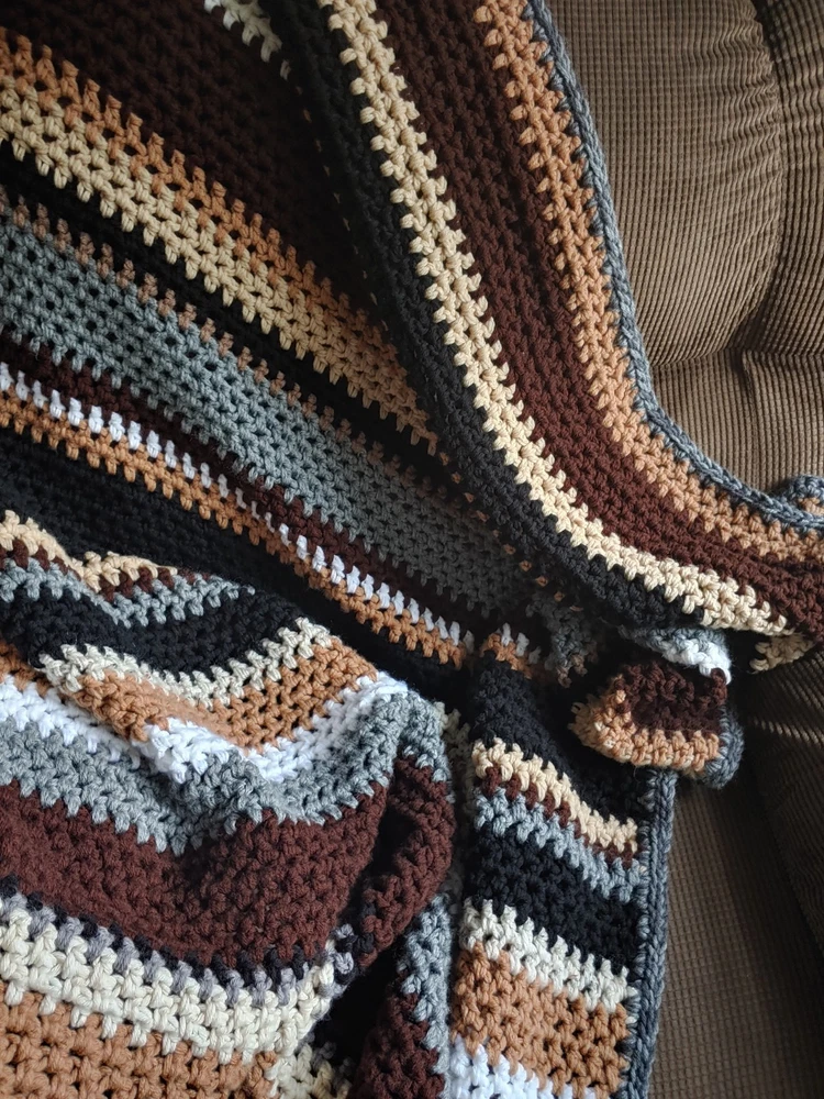 This blanket was handmade by me and it is made out of acrylic yarns. This blanket measures about 66" in width and about 64" in length. It can basically almost completely fit a full-size bed. The yarn weight was made chunky by using two weight 4 yarns together row after row. To care for this blanket, you can machine wash it, but tumble dry low for a very short amount of time (maybe 20 minutes or less than 20 minutes) / air dry it after. Please feel free to ask any questions and please see all photos, thank you :)