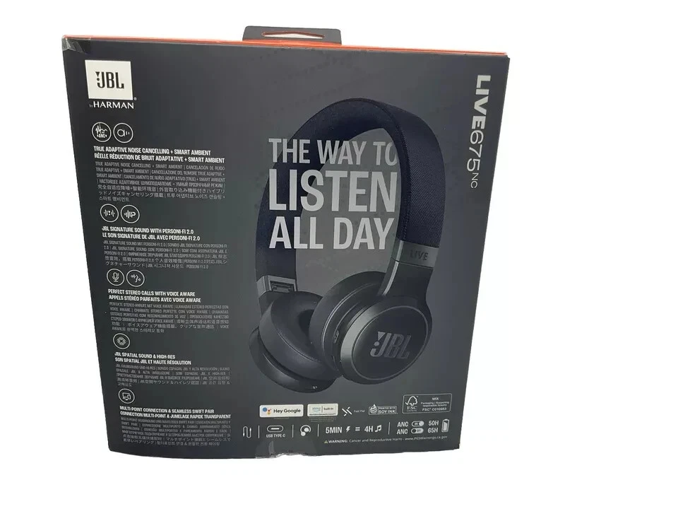 JBL Live 675NC headphones deliver powerful JBL Signature Sound in a comfortable On-Ear headband style. True Adaptive Noise Cancelling with Smart Ambient technology lets you decide which sounds to keep out and let in. Access your preferred voice assistant with either a hot-word or a tap on the earcup. You’ll enjoy up to 65 hours (50 hours with BT+TANC on) of music streaming—and a 5-minute speed charge gives you another four hours. Features: JBL Signature Sound and surround sound Bluetooth 5.3 with LE audio supported* True Adaptive Noise Cancelling with Smart Ambient Up to 65 hours* of battery life and speed charge Auto Play and Pause Multi-point connection Seamless connectivity with any device 2 beamforming microphones for calls Comfort-fit fabric headband and carrying pouch JBL Headphones App Personi-Fi 2.0 Dear Customer: your satisfaction is our highest priority. If you encounter any issues or have concerns regarding our products/services, please do not hesitate to reach out to us. We are committed to addressing any problems promptly and effectively.