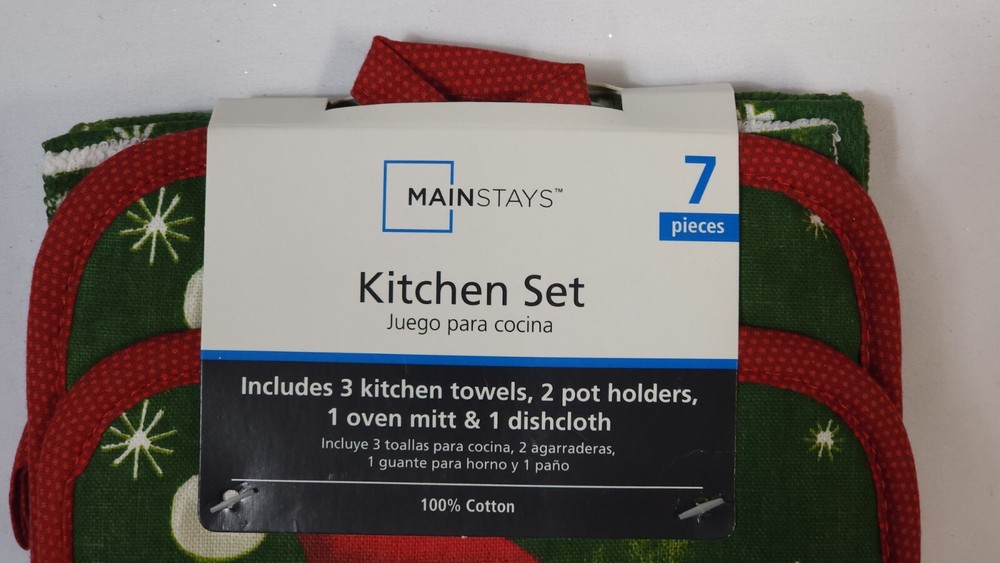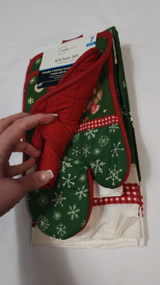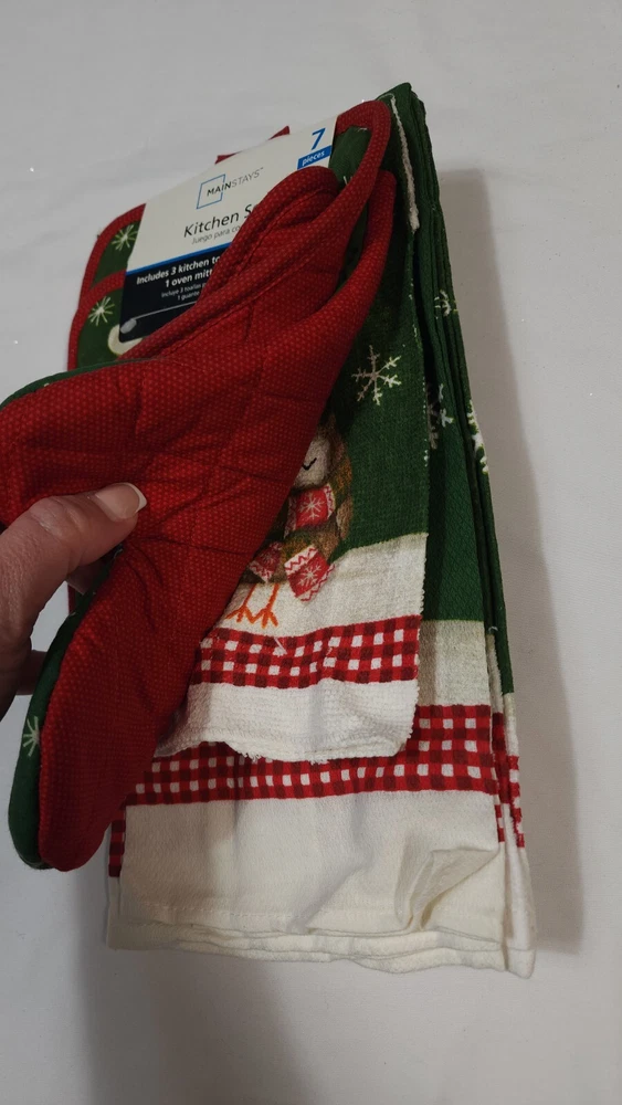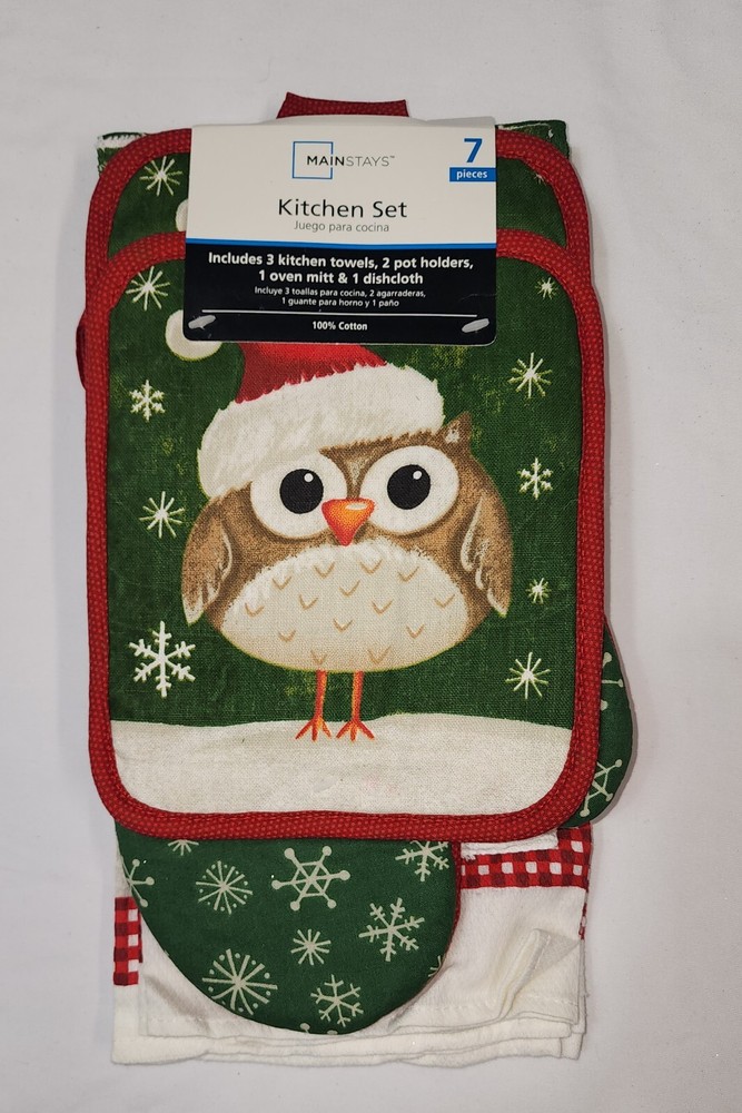 NEW Mainstays 7-piece Christmas Kitchen Set with a festive owl design (K) 3 Kitchen Towels 2 Pot Holders 1 Oven Mitt 1 Dishcloth 100% Cotton...