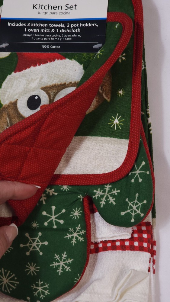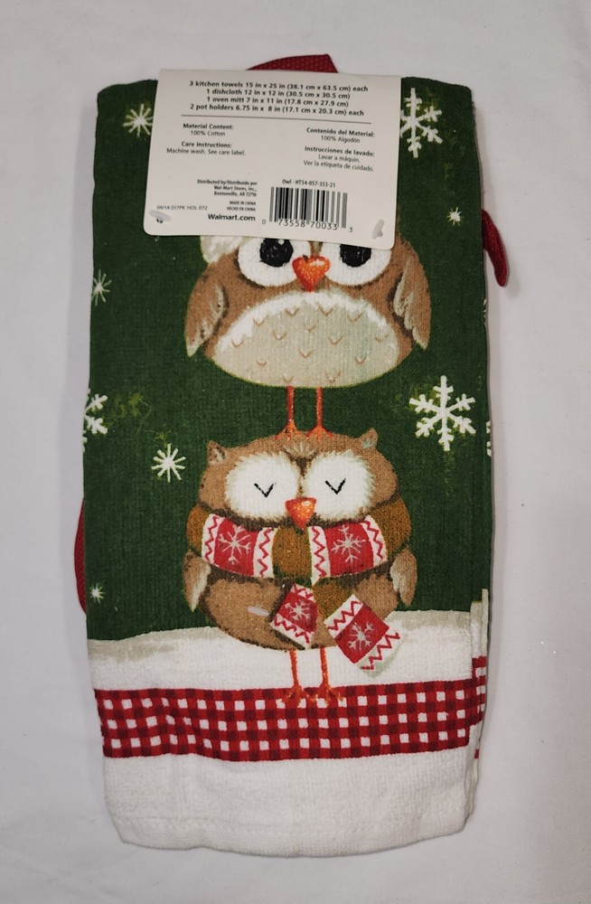 NEW Mainstays 7-piece Christmas Kitchen Set with a festive owl design (K) 3 Kitchen Towels 2 Pot Holders 1 Oven Mitt 1 Dishcloth 100% Cotton