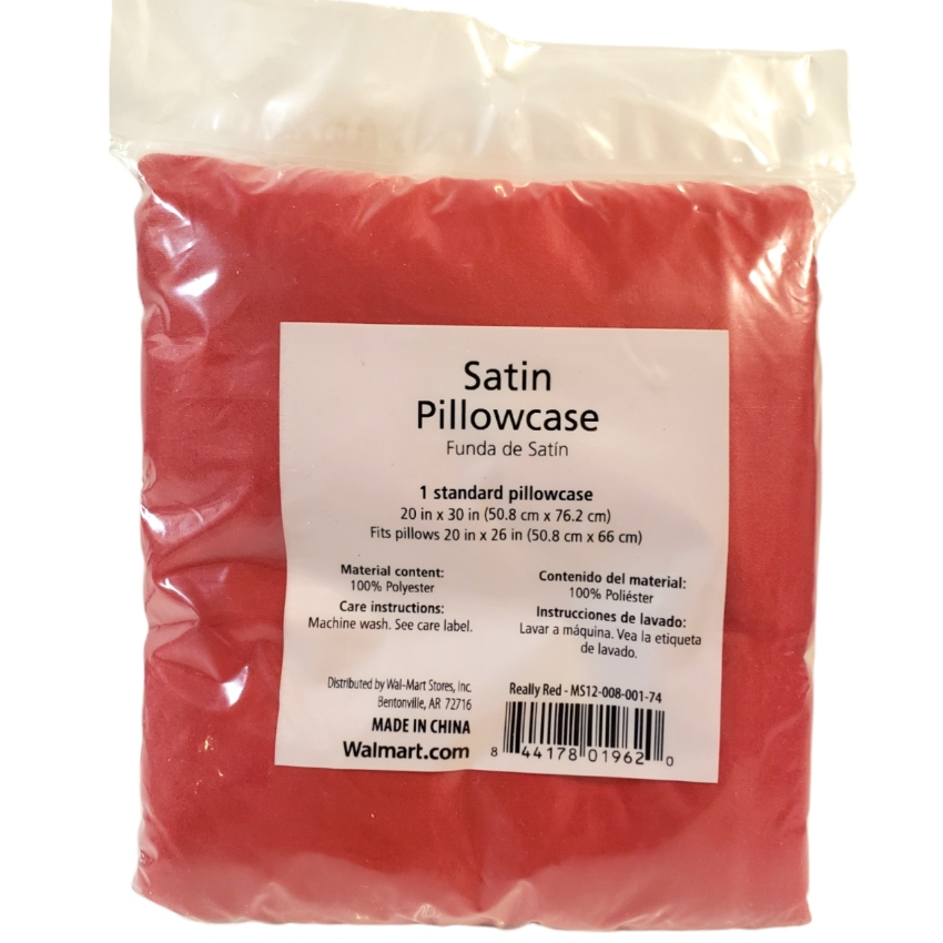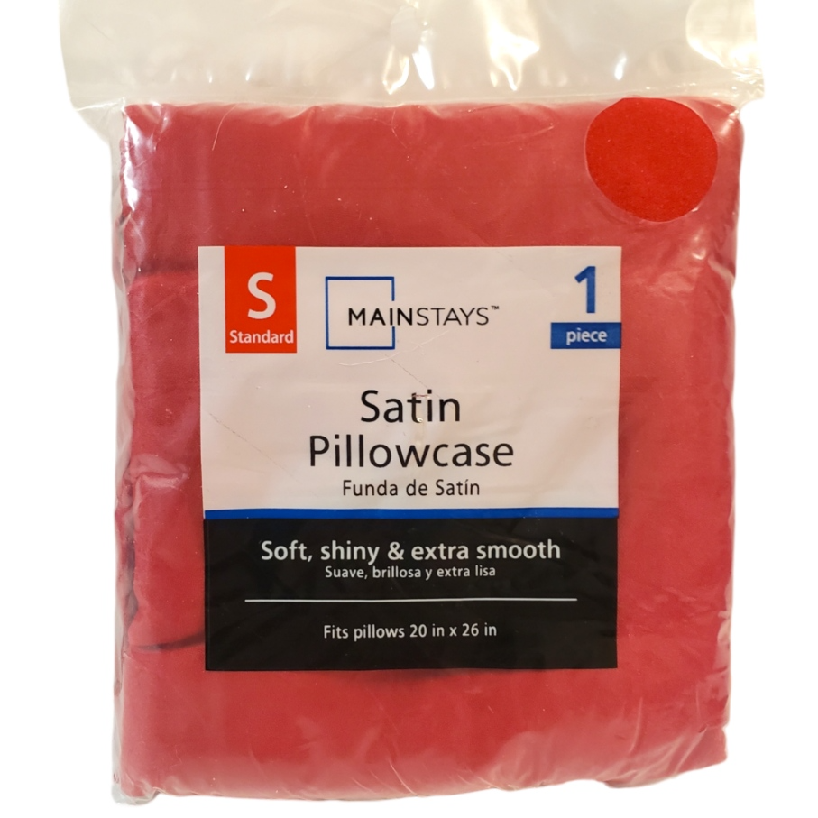 NEW in Package Mainstays S Standard Size Satin Pillowcase Really Red - MS12-008-001-74 Soft Shiny Extra Smooth 1 Piece Per Package 20 in x 30 in, fits pillow 20 in x 26 in I have 4 of these available Crafted for comfort and style, the Mainstays Standard Red Satin Pillowcase offers a luxurious feel for your bedding ensemble. The soft, shiny satin fabric provides an extra smooth touch, perfect for a cozy night's sleep or a chic accent on your bed. The solid red color adds a pop of vibrancy to any bedroom decor, while the 20 x 30 inch size ensures a snug fit for most standard pillows. This single-piece package makes it easy to elevate your bedroom with a simple yet elegant touch.