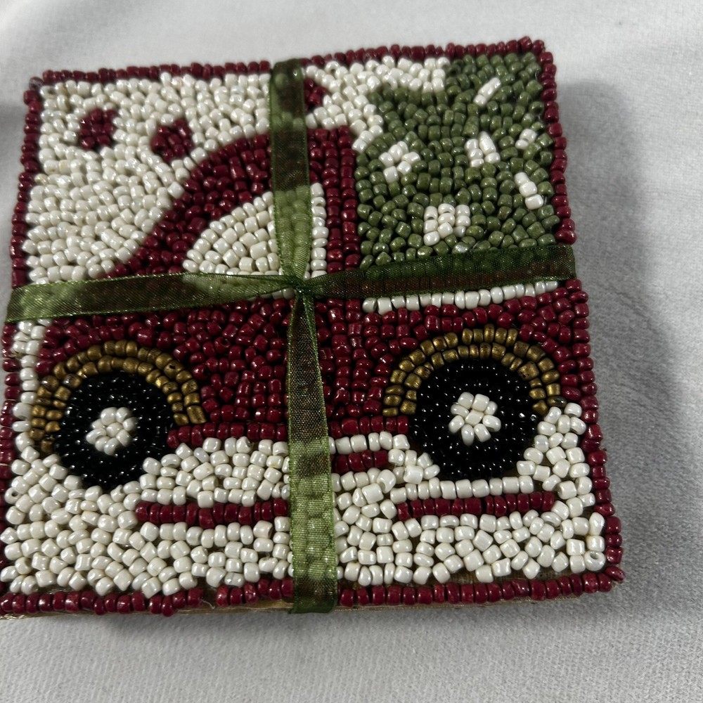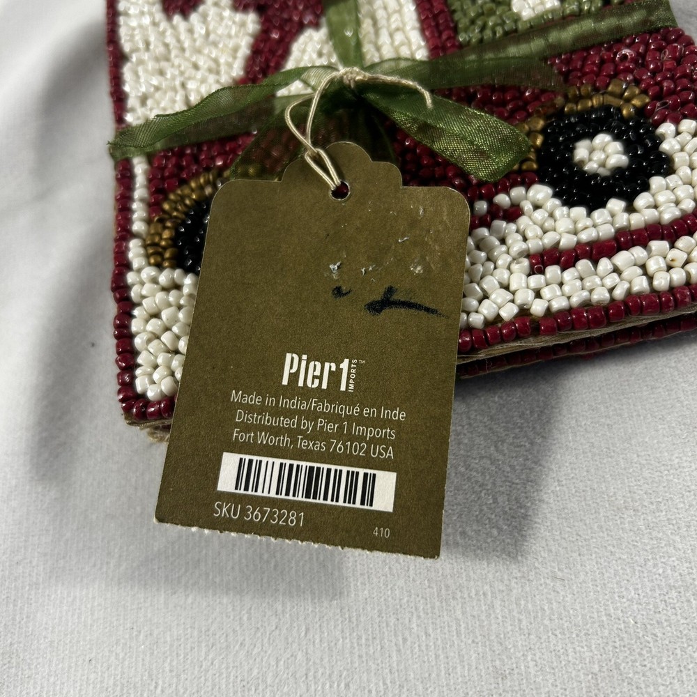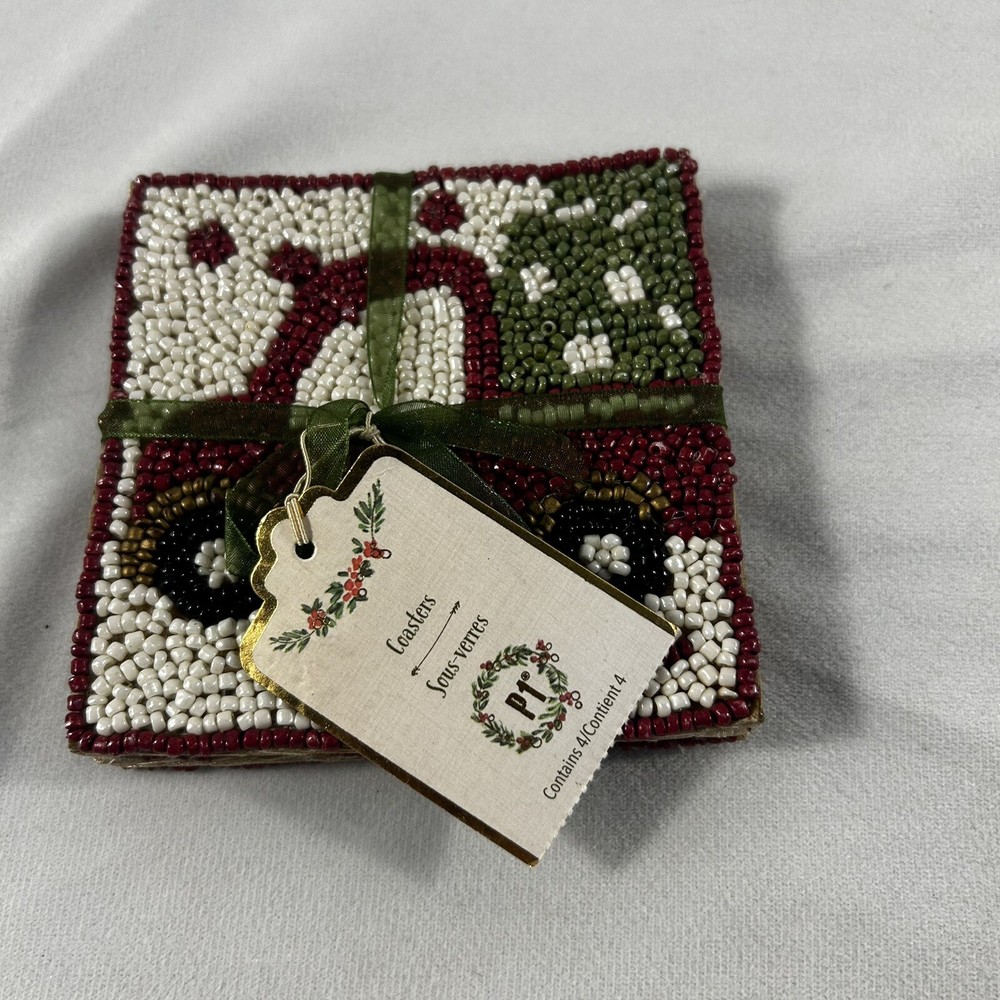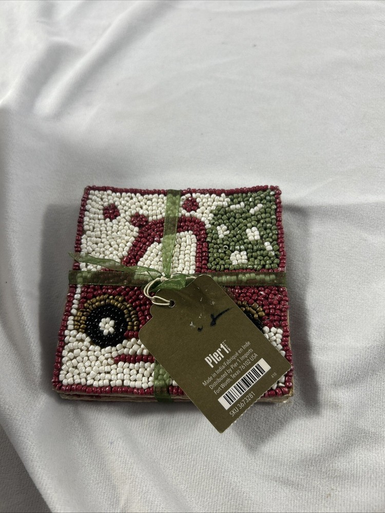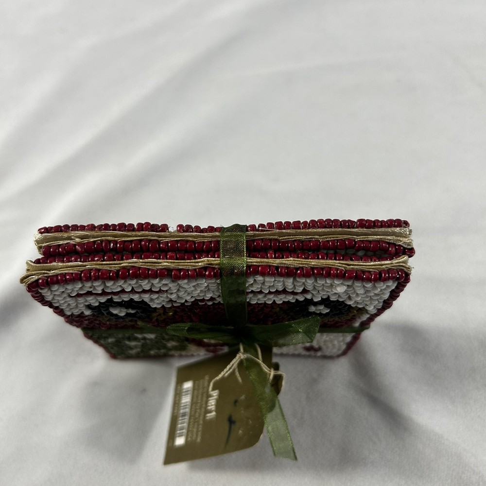 The Pier 1 Imports coaster set includes 4 beaded coasters featuring a design of a truck carrying a Christmas tree, perfect for the holiday season. The coasters are shaped like a truck with a tree and have a multicolor design. Each coaster measures 5 inches in length and 4.5 inches in width, with a diameter of 0.2 inches. They are hand wash only and made in India. The set is a festive and traditional addition to any home during the Christmas holidays.