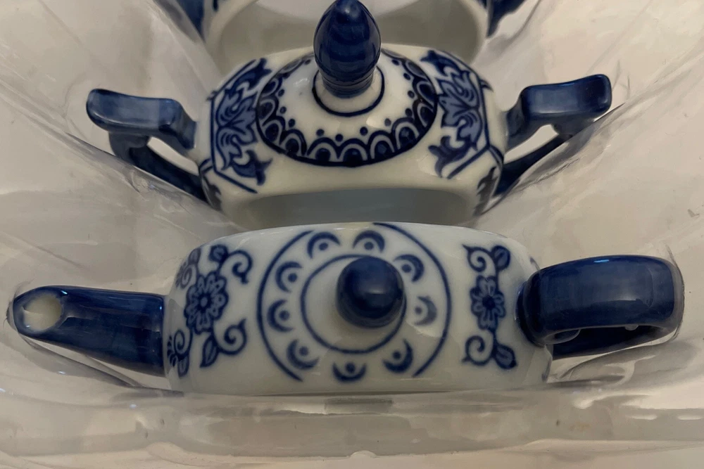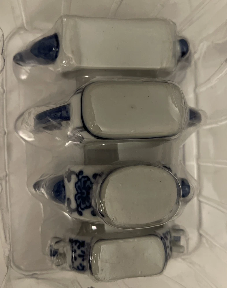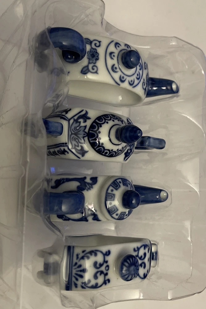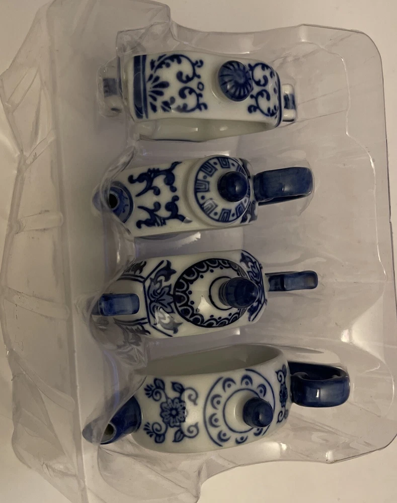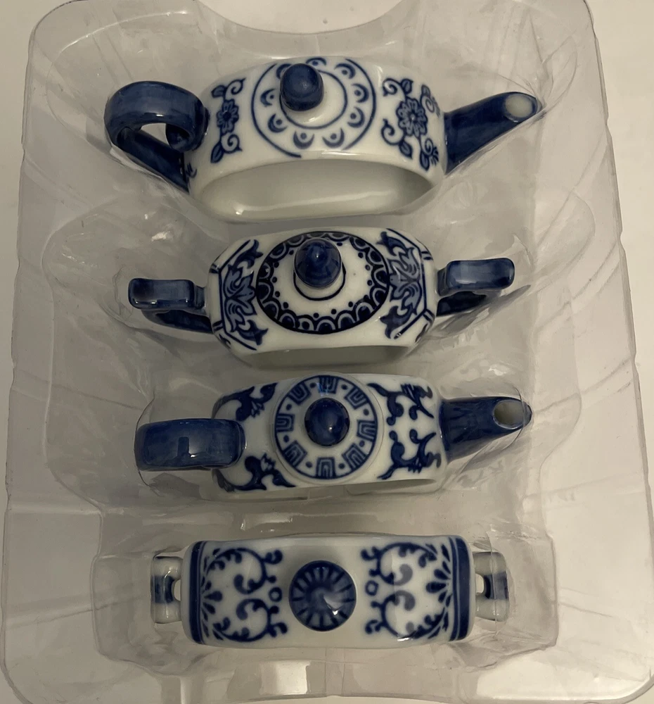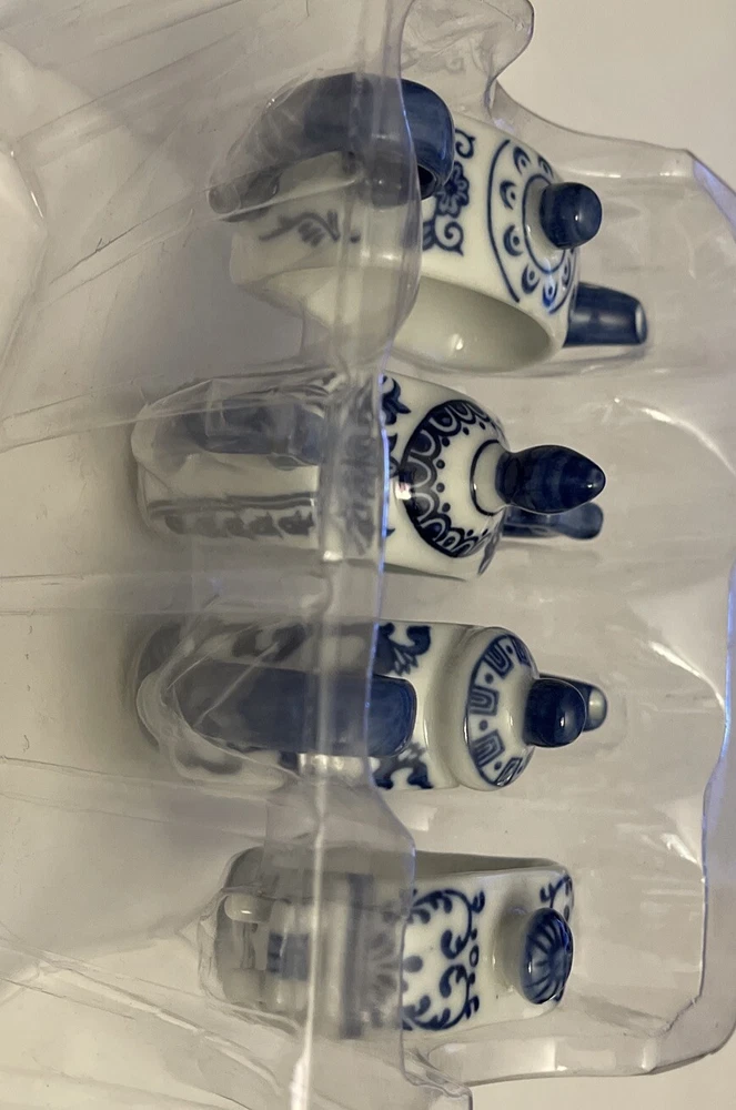 Pier One English Tea Time Porcelain Blue and White Teapot shaped Napkin Rings. Set of 4 100% Authentic! Brand New, but lose the original box. Please look at the pictures for details and condition. Accept to combine shipments.