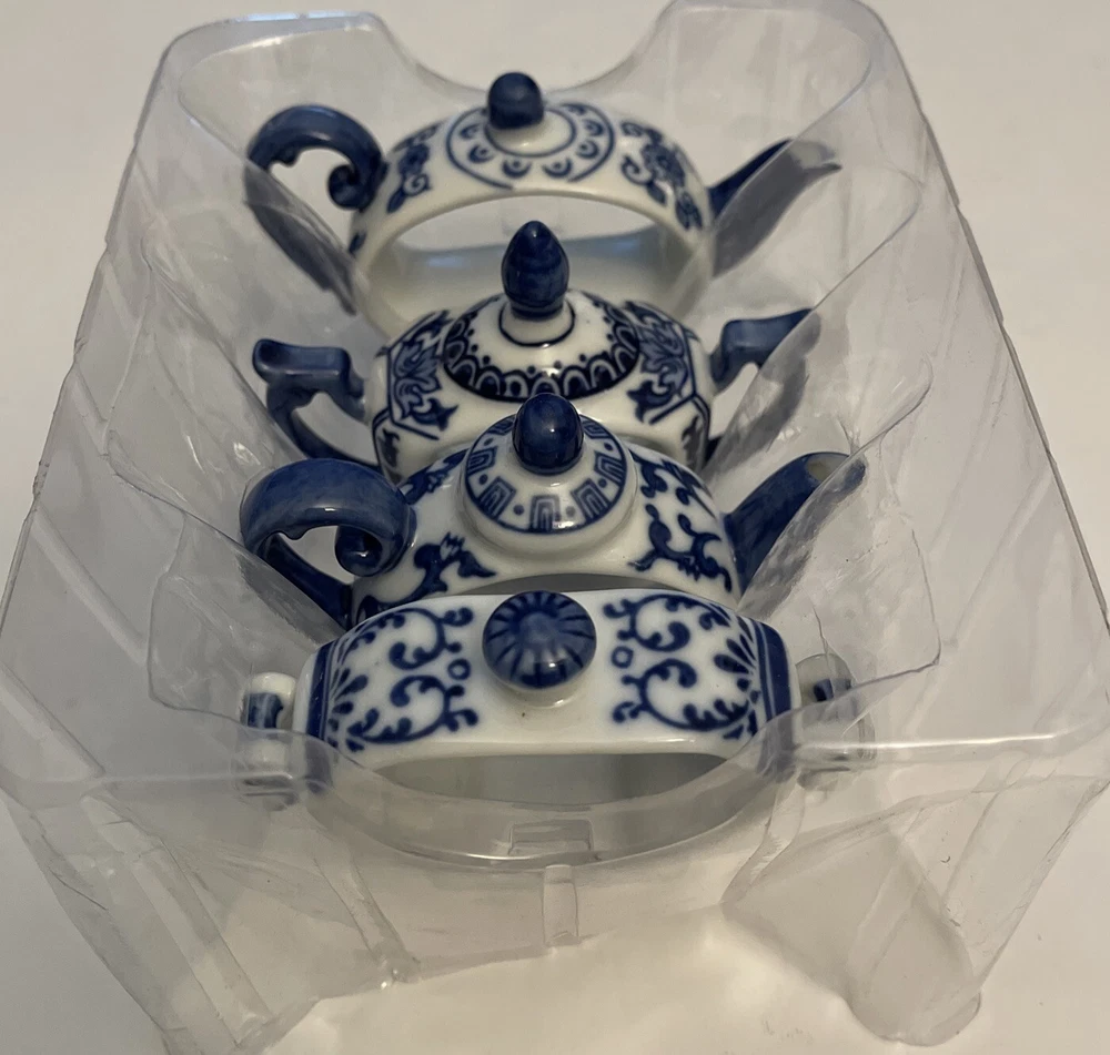 Pier One English Tea Time Porcelain Blue and White Teapot shaped Napkin Rings. Set of 4 100% Authentic! Brand New, but lose the original box. Please look at the pictures for details and condition. Acc...