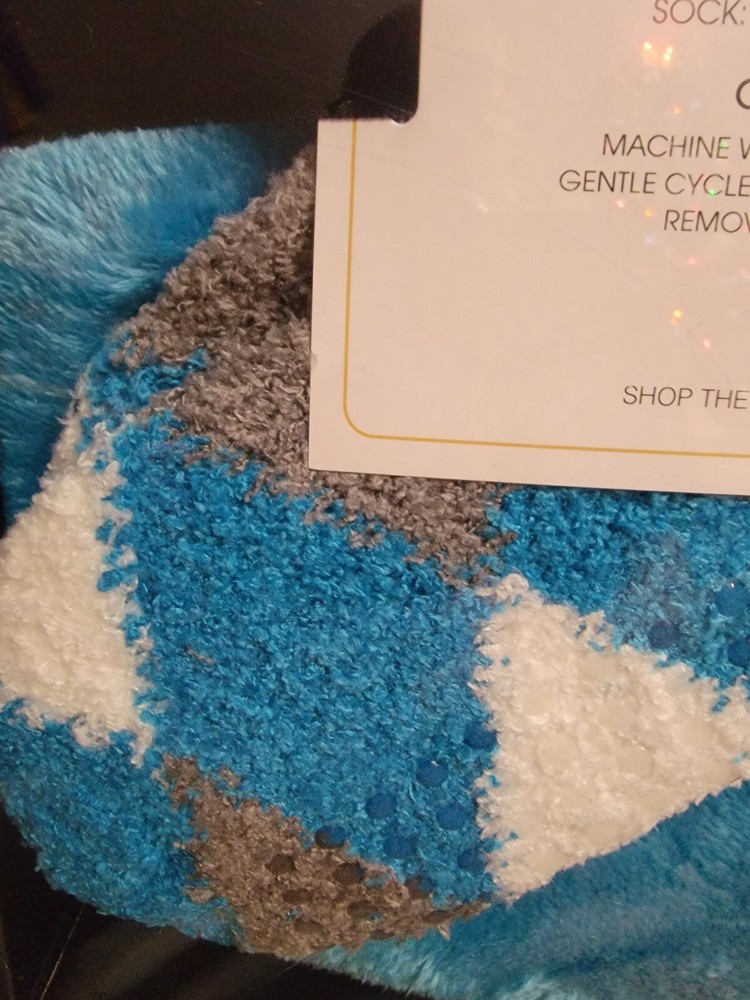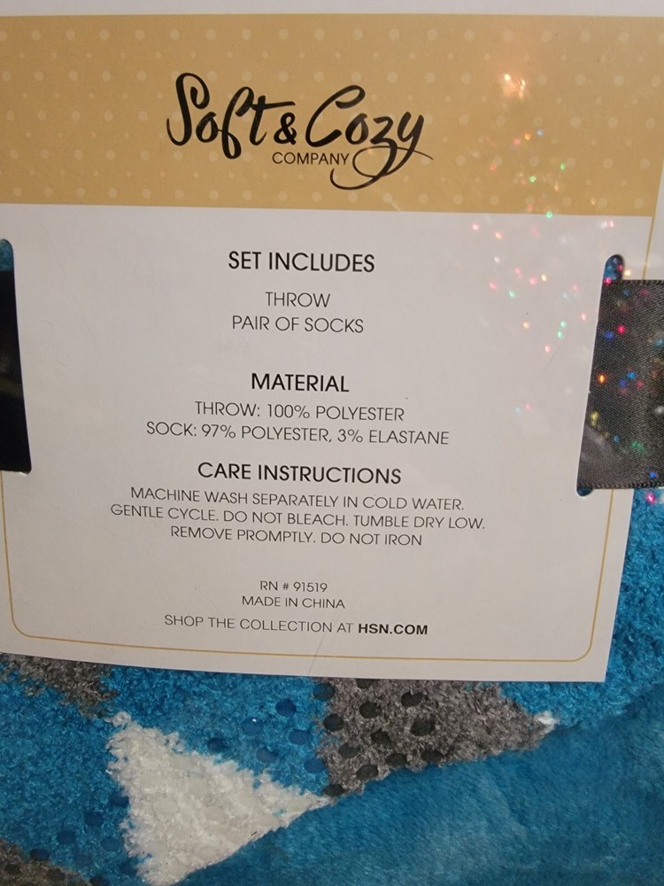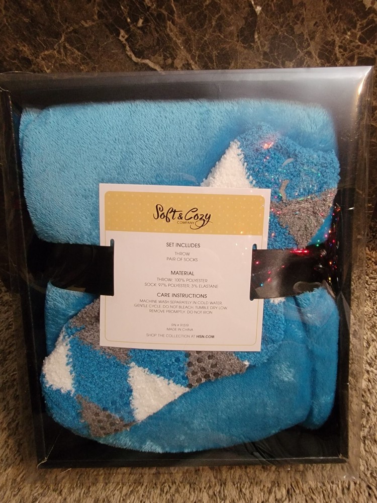 This is a NEW SOFT & COZY Throw with Socks Set, Very Nice and WARM in a Blue White and Grey color. If you have any questions at all, please ask! Thank you so much for looking!