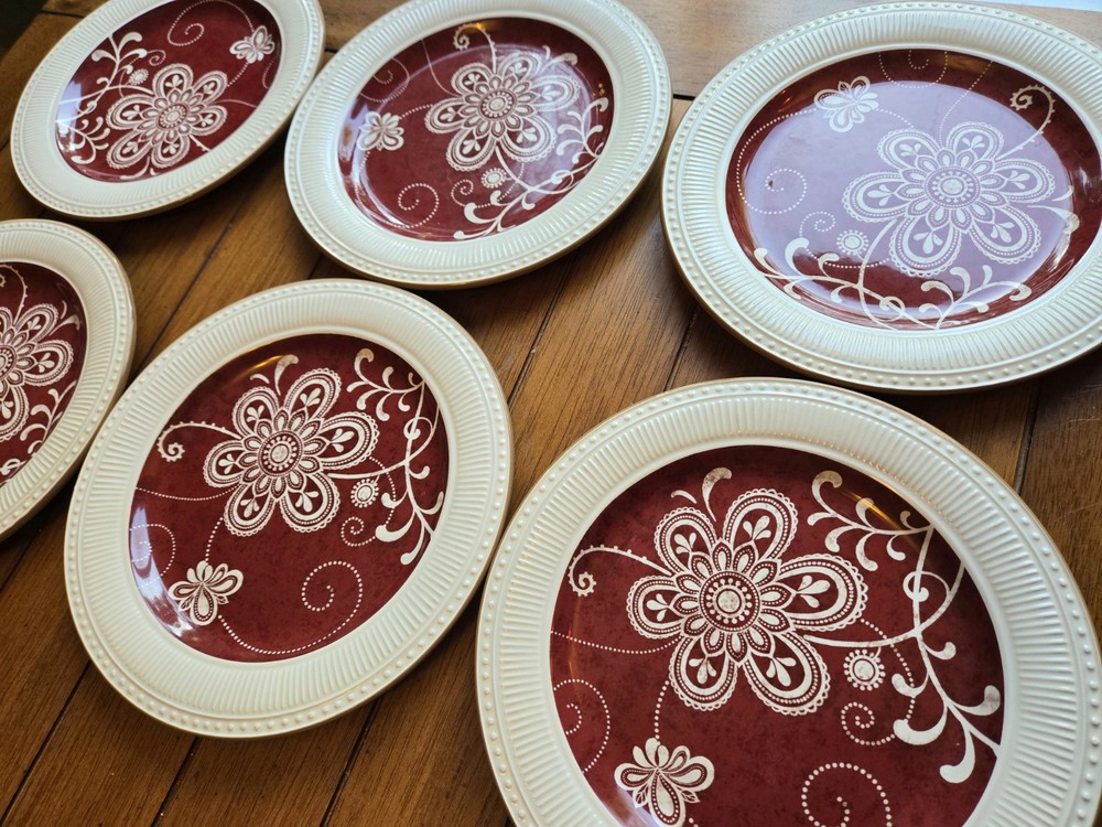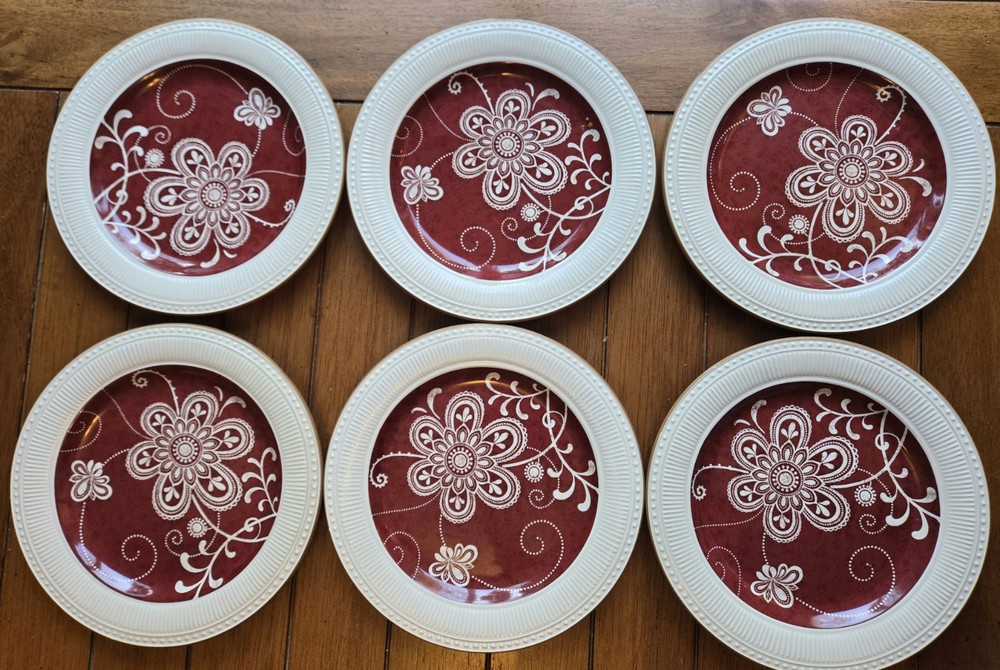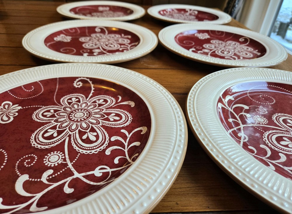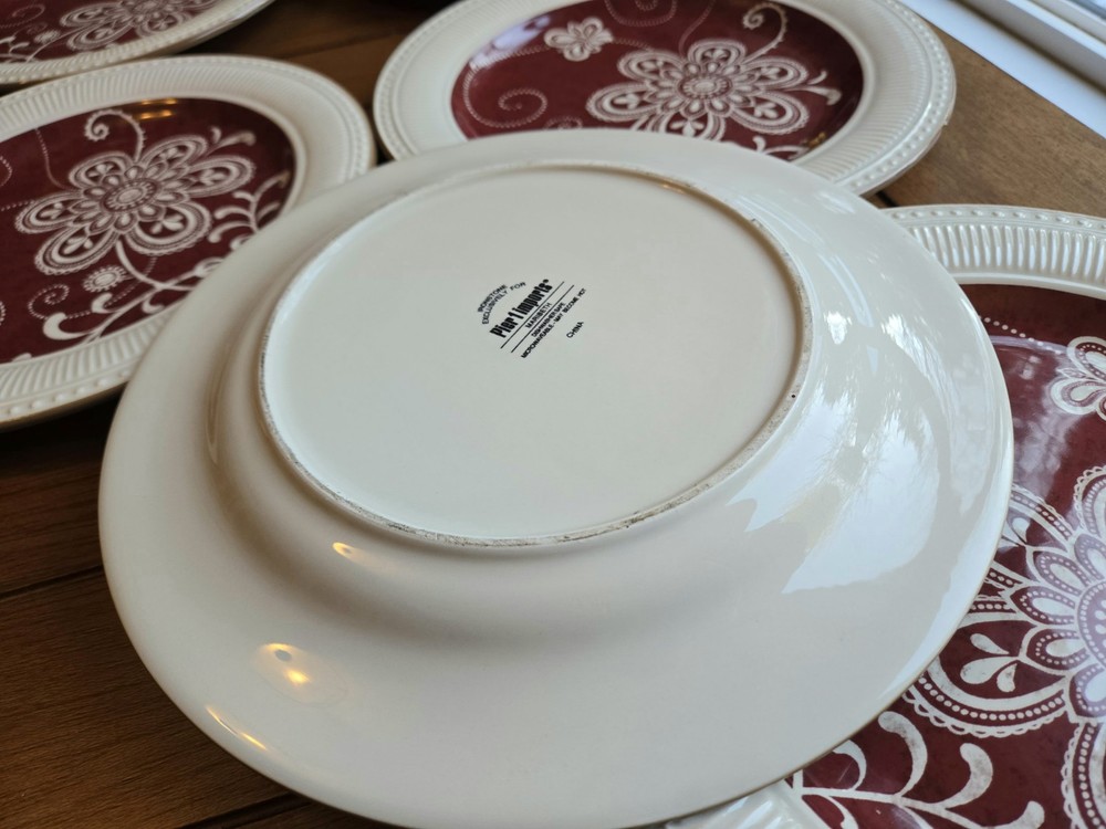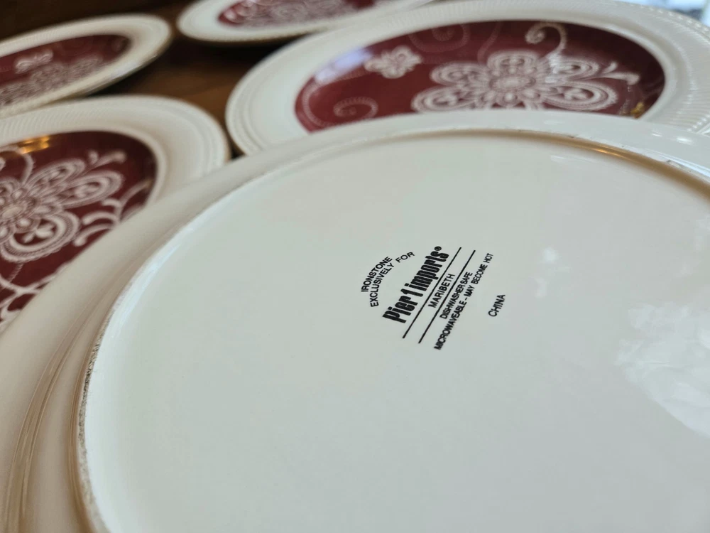 NEW, Stored, unused ☆Set Of 6 ~ PIER 1 Imports MARIBETH Ironstone Dinner Plates Measure 11” diameter Please note the last photo, one plate, though new, got a chip, through storage Retired Set Beautiful ☆Elegant Set Thanks For Looking - Fast Shipment