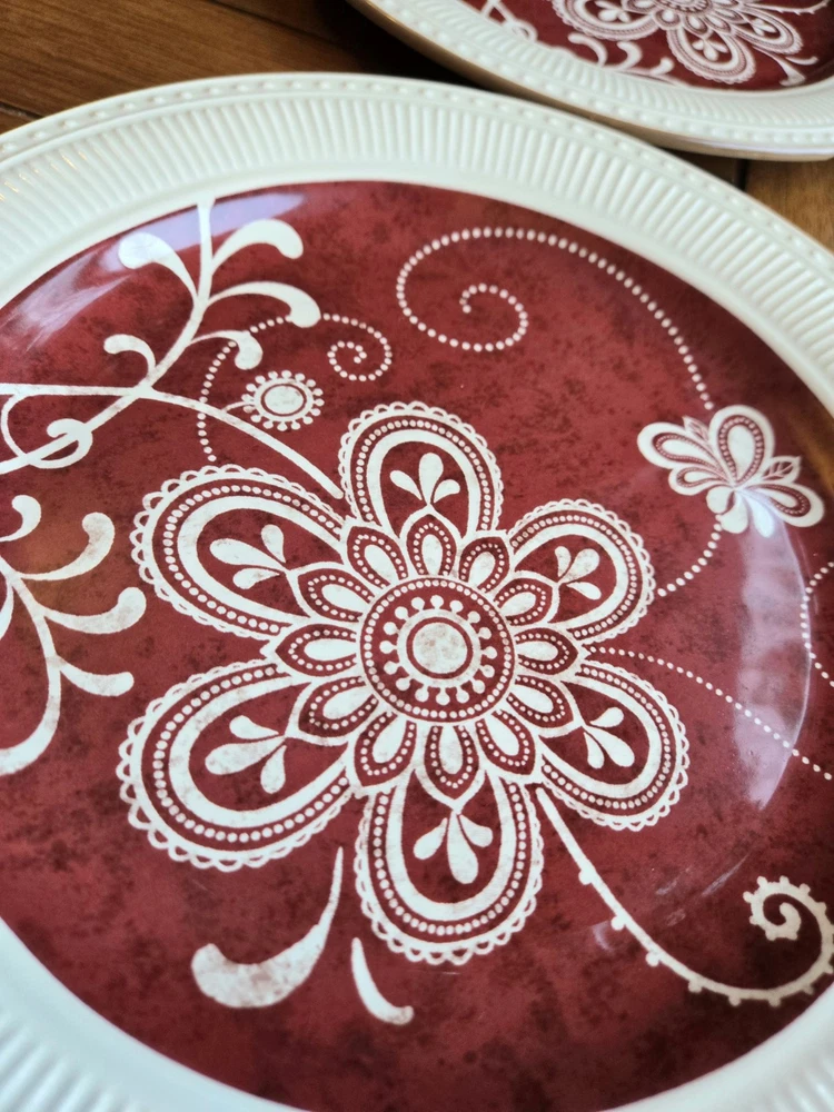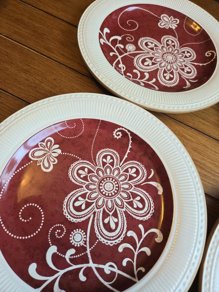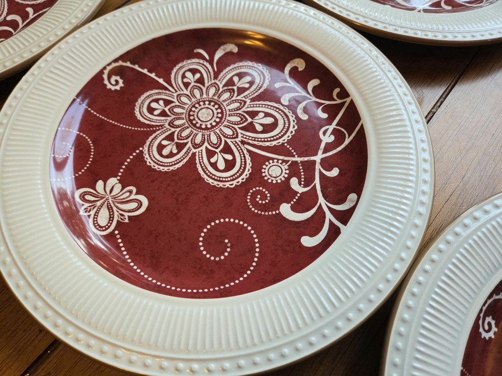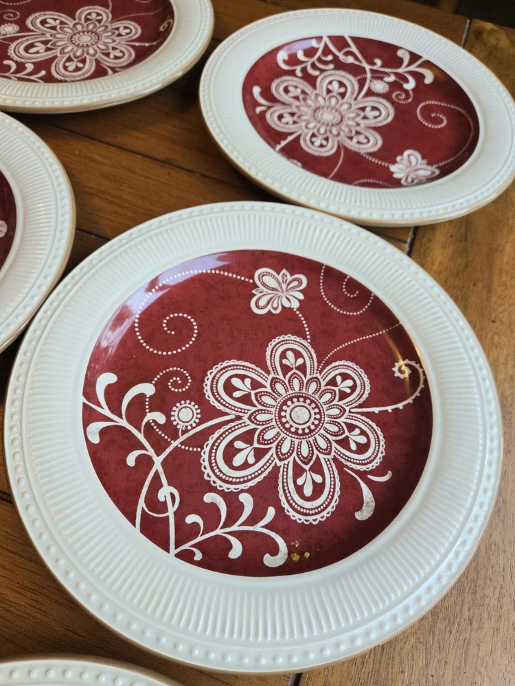 NEW, Stored, unused ☆Set Of 6 ~ PIER 1 Imports MARIBETH Ironstone Dinner Plates Measure 11” diameter Please note the last photo, one plate, though new, got a chip, through storage Retired Set Beautiful ☆Elegant Set Thanks For Looking - Fast Shipment