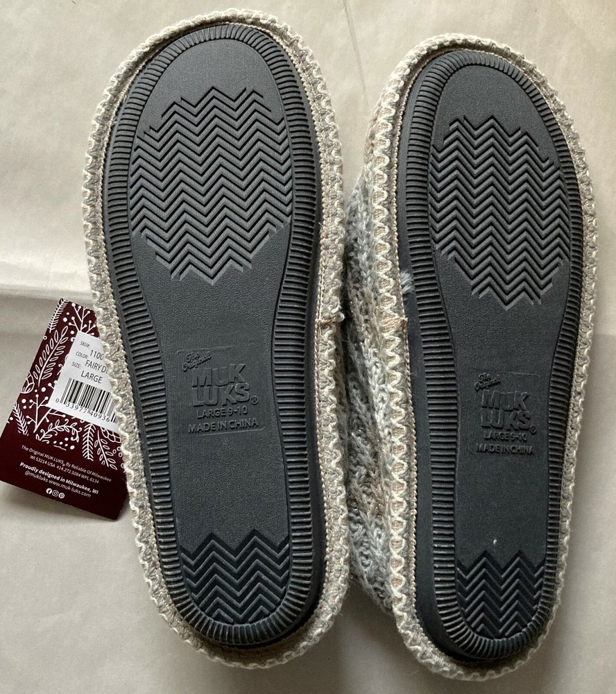 You are buying a pair of MUK luks slippers, size 9-10 large. These pretty fairy dust (color shown) slip on slippers feature: round toe; cozy comfort foam; warm and cozy lining; slip resistant soles for safety; hand clean. Winning bidder to pay shipping costs. All items come from a smoke-free home. Items shipped free that are returned will be refunded less all shipping costs. Thanks for looking and good luck!