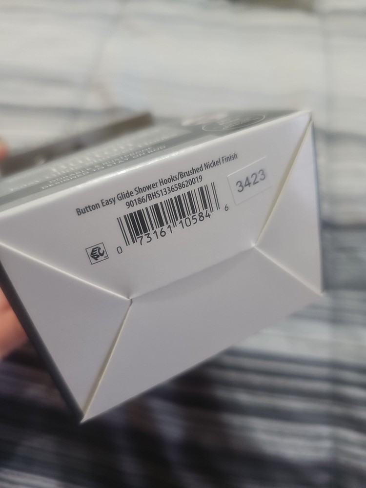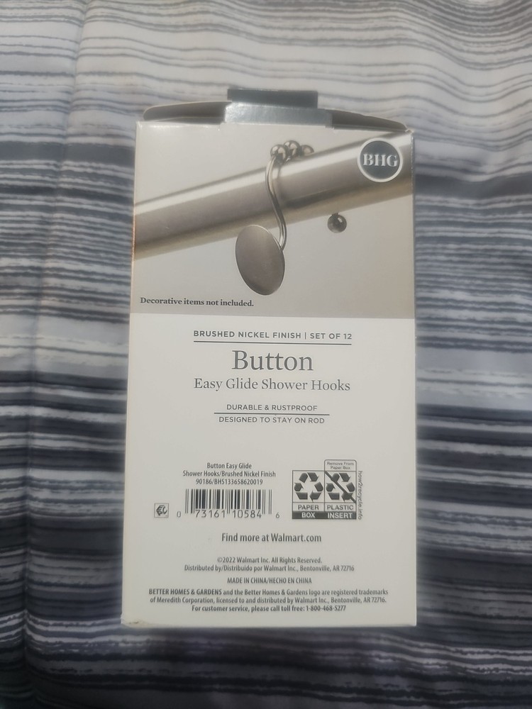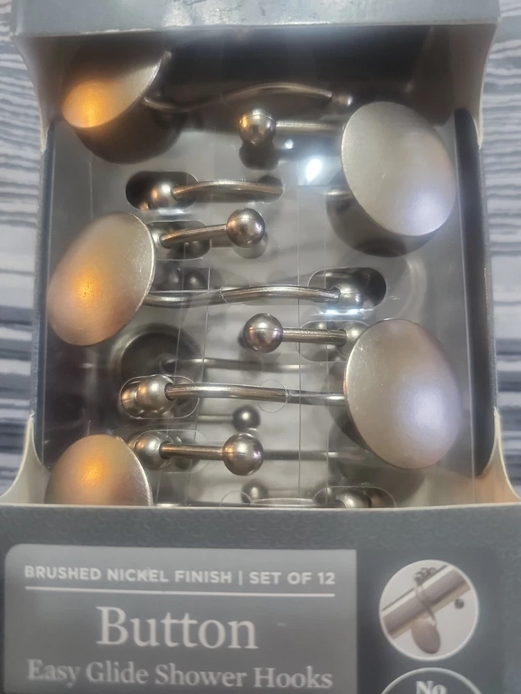 WELCOME TO KEMMMW5 : WE DON'T ACCEPT RETURNS ABOUT YOUR ITEM : New in box better homes and gardens button style brushed nickel finish easy glide shower hooks. They are durable and rustproof. Made in China. This is a set of 12. Please see the pictures. Fast shipping :) NEW WITH A BOX SEE PHOTOS FOR DETAILS AND INSTRUCTIONS. IF YOU HAVE ANY QUESTIONS PLEASE LET ME KNOW! VIEW THE PHOTOS CAREFULLY BEFORE BUYING WHAT YOU SEE IS WHAT YOU WILL RECEIVE. I DO FREE SHIPPING SO SHOP SHOP SHOP! You may receive some extra surprises in your bag! They are for you to keep and enjoy :) Thank you for your business!