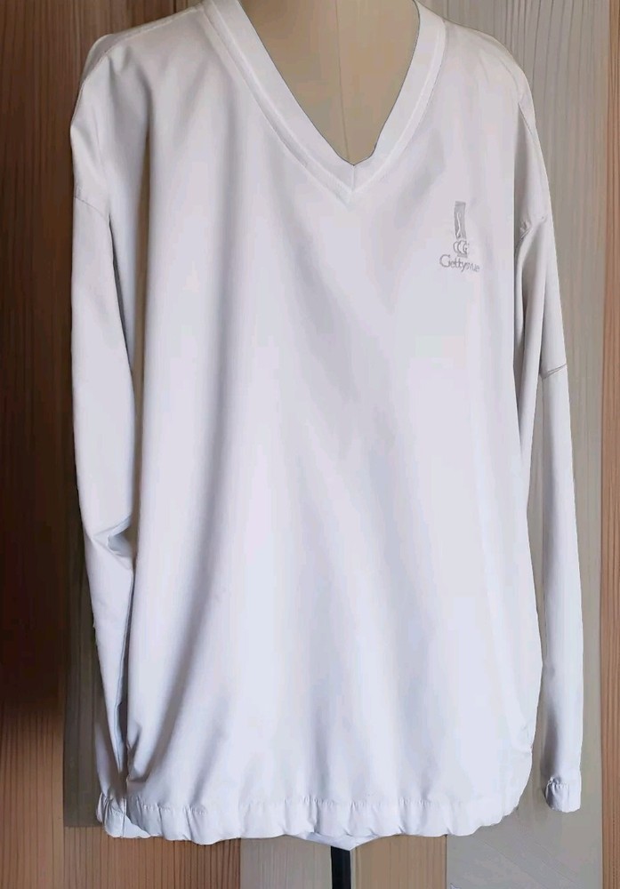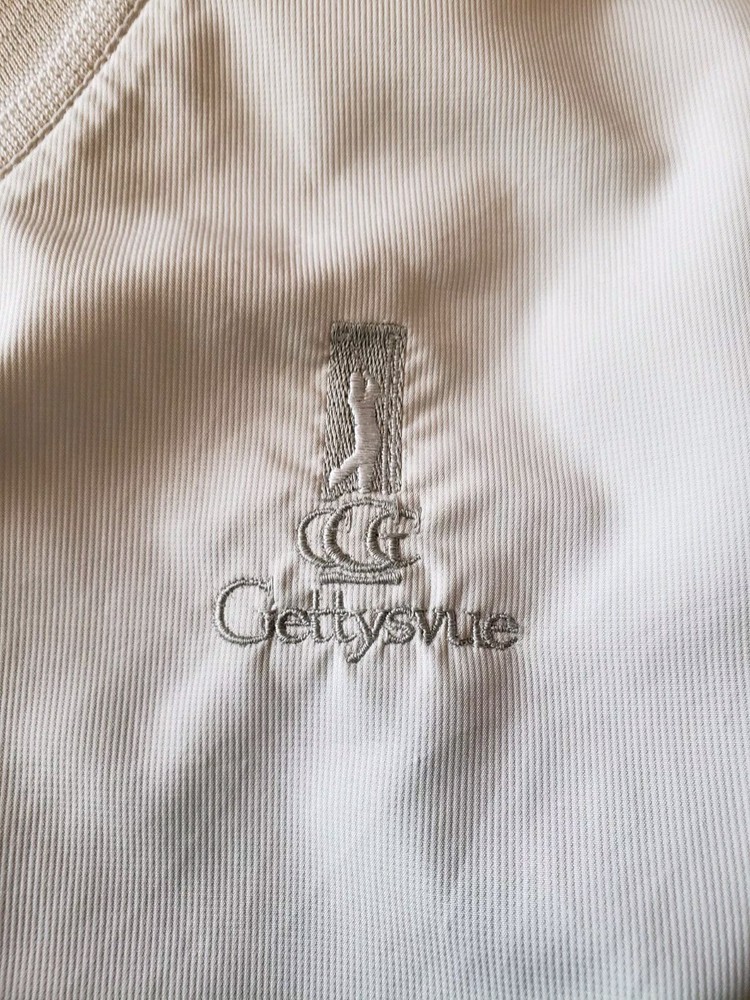 This Nike Golf jacket is a vintage piece that will elevate your activewear and casual outfits. Made with polyester outer shell material and lined with polyester, this wind-resistant and breathable jacket is perfect for all seasons, including winter, summer, fall, and spring. It features an embroidered Nike logo and a solid beige color that will match any outfit. The jacket has a regular fit, short sleeves, and a V-neck closure. It also has zipped pockets, an elastic waist, and is machine washable for easy care. Gettysvue is embroidered on the front. Visit my ebay store Attic Depot I do combined shipping just message me.
