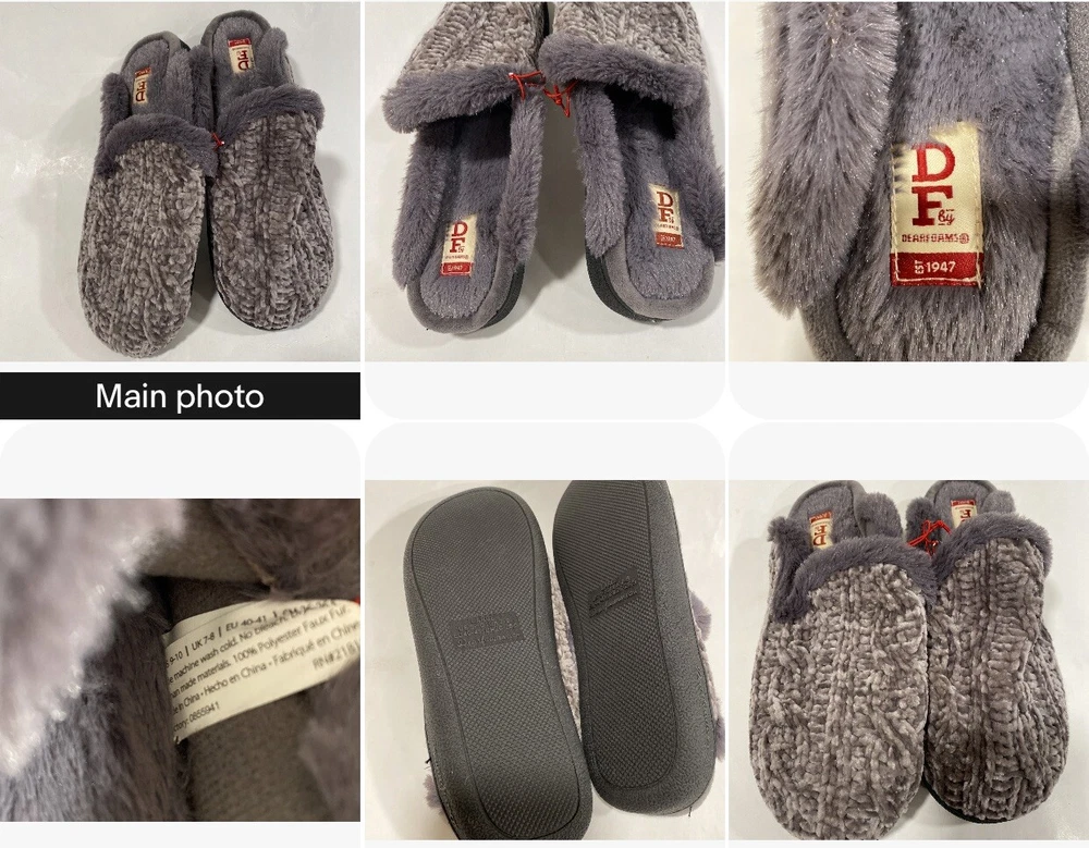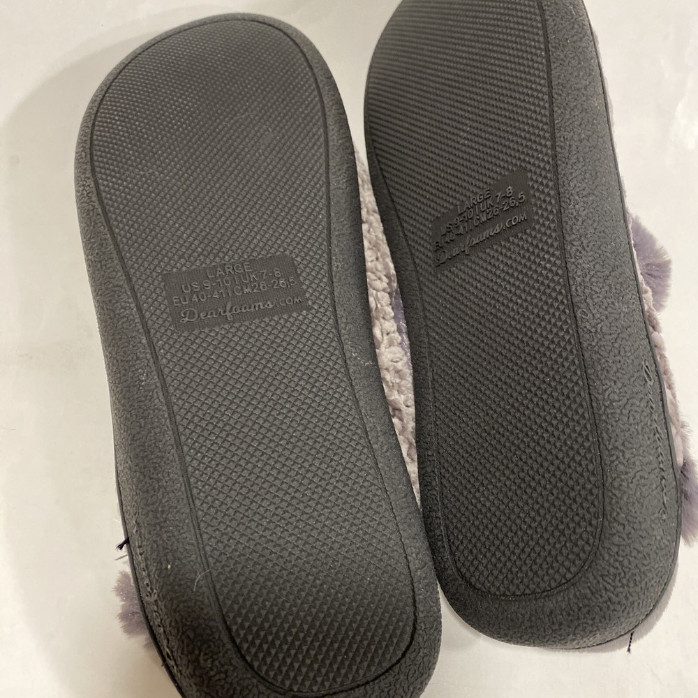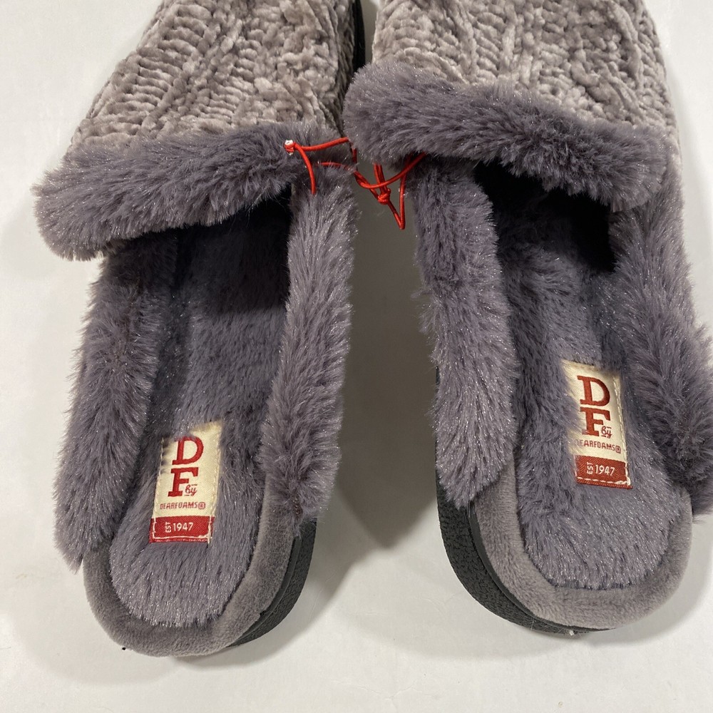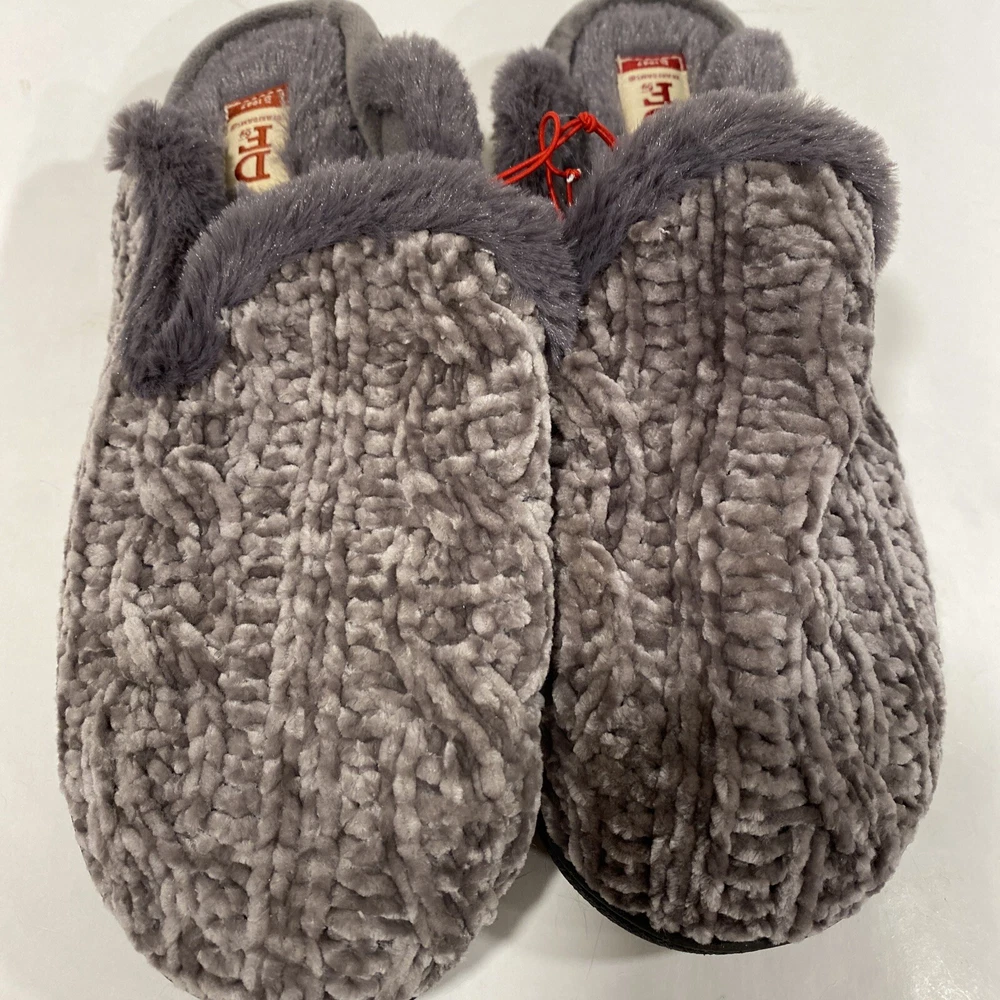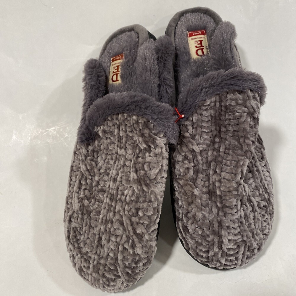 Dearforms Cozy Comfort Cushion No Sweat Chenille Tab Scuff SZ LG 9-10 Grey NWOT. 100% polyester Dearfoams Women's Cozy Comfort Chennile Tab Scuff Featuring over-the-top soft furry lining and our classic memory foam insoles, these scuffs are a great way to treat your feet to a well-deserved break! Plus, with no-sweat DF Adapt designs and machine washable materials, quick refreshes are a breeze. Size: Large (9-10) Color: Grey Features: Textured Chenille Knit Upper Cozy furry lining and footbed No sweat comfort with DF Adapt keeps feet cozy and dry Cushioned insole with Gel Memory Foam for added comfort. See photos for details on style and condition - all sales final, no returns or refunds. Thank you for looking. Feel free to ask questions before buying. Shipped with USPS Mail. Condition: New with out Tags