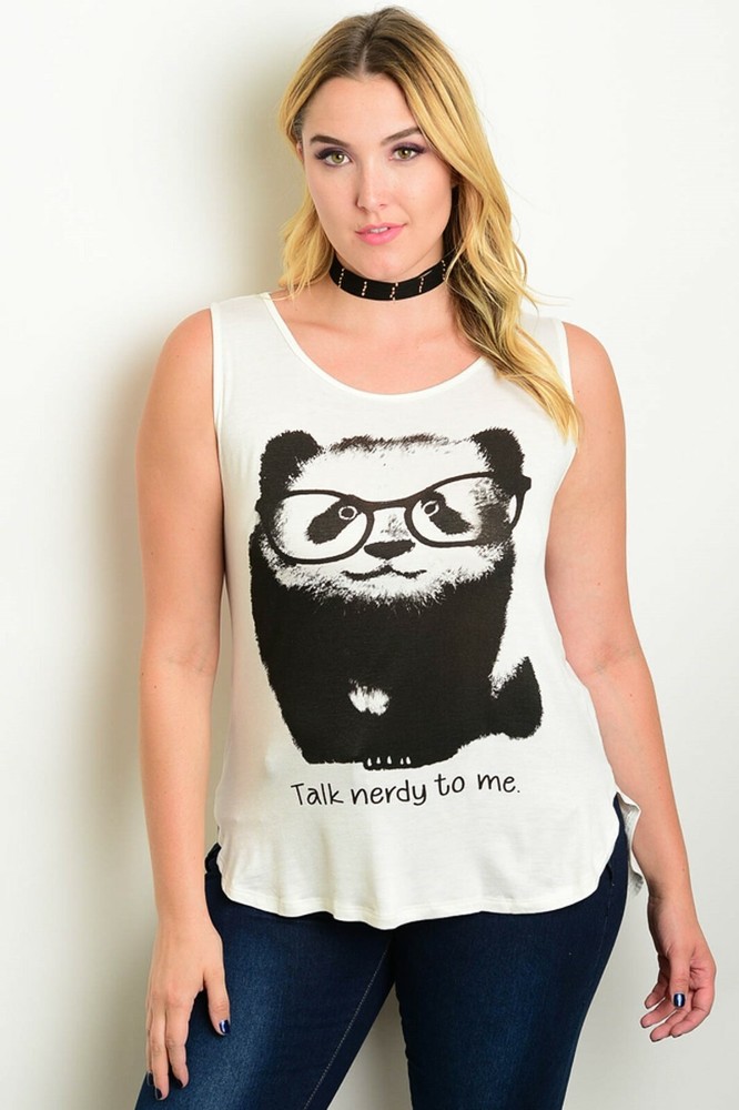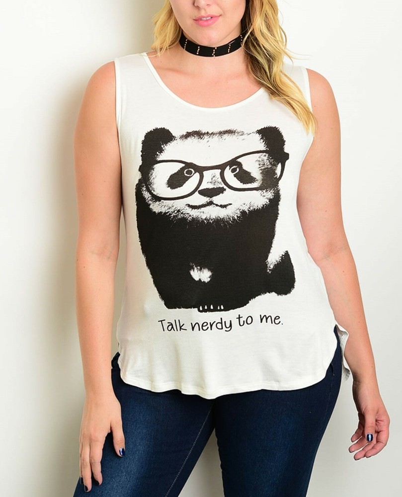 NEW WITHOUT TAGS! Soft and lightweight Ivory background with a large black panda on front (Panda is wearing glasses) Beneath (also in black) it reads "Talk nerdy to me" Curved hemline with dolphin slit at sides Subtle hi-low hem Will hit below the waist (Please see pictures) 96% Rayon 4% Spandex 3X If you have any questions or would like exact measurements (as size chart below is for reference only) please let me know; I am here to help! Thanks for looking and have a great day! * Size chart is for reference only and to give you an idea of fit. Sizing varies from brand to brand and depends on style of item. If you need more exact measurements or have any questions please don't hesitate to ask! HOW TO MEASURE BUST Measure around your body, under your arms and over the fullest part of your bust WAIST Hold measuring tape at your natural waistline. HIPS Measure around the fullest part of your body, placing the tape about midway between your crotch and belly button * Keep the tape comfortably loose. Only Paypal is accepted at this time. Payment is due within 3 days; if you cannot pay for item within this time, please contact me so I can make a note of that. Thank you! Shipping is for the 50 U.S states and does not apply to international buyers. International Buyers: Please contact me for an updated shipping quote. To save you money, I do combine shipping on all your beautiful purchases. Please wait to pay until I can send you a revised shipping invoice. Please ask any and all questions prior to purchasing or placing a bid. Due to flash from camera, colors will be close, but may not be an exact match. Keep checking back as new items are consistently listed! If you are not happy with your purchase or feel I misrepresented the item in any way please let me know and give me a chance to work things out to your satisfaction prior to leaving negative feedback. "Beauty is defined by depth of the heart and freedom of the spirit"