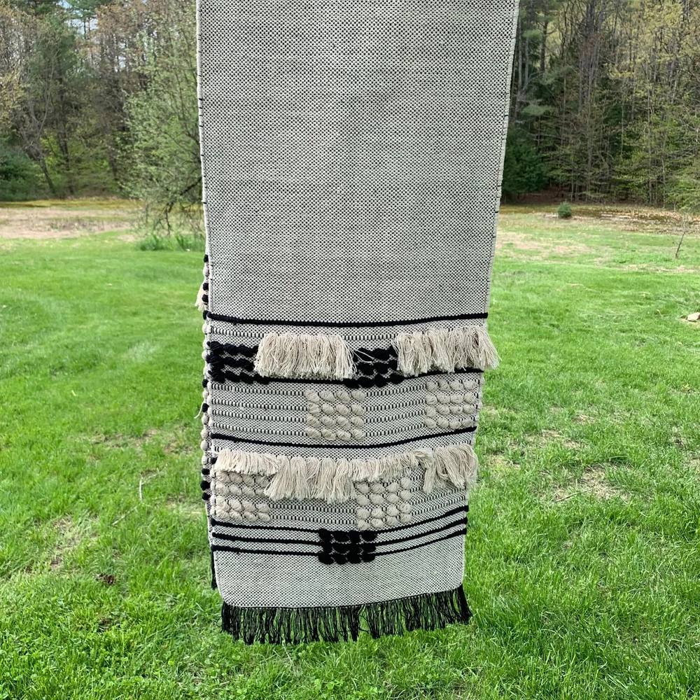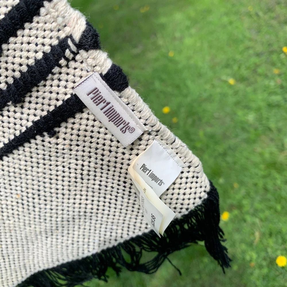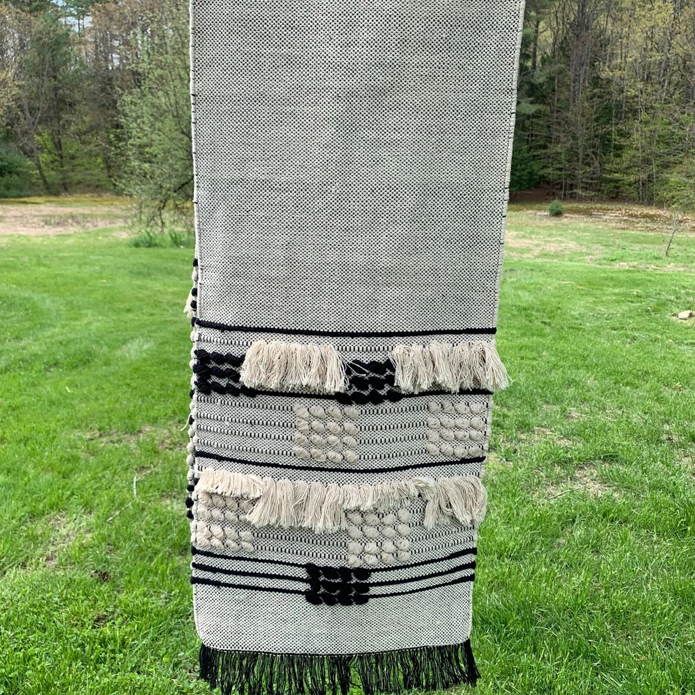 New with price tag still attached Pier 1 Imports table runner. Measures 72” by 13” in black and white with fringe and detailed weavings on each end. Excellent condition no issues. A lovely gift, too. Sale supports Vermont’s Puppetree. Thank you & please check our Support Store.