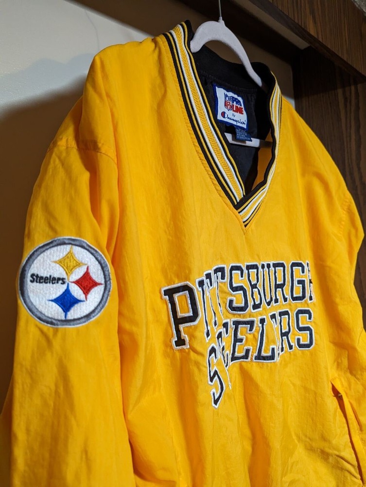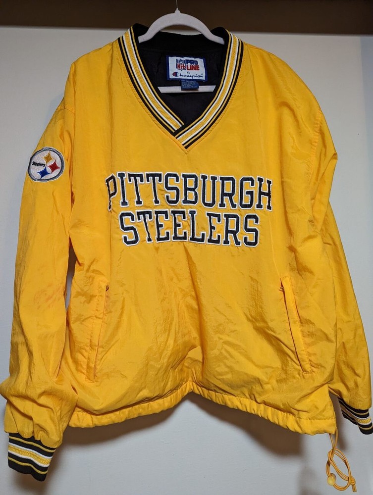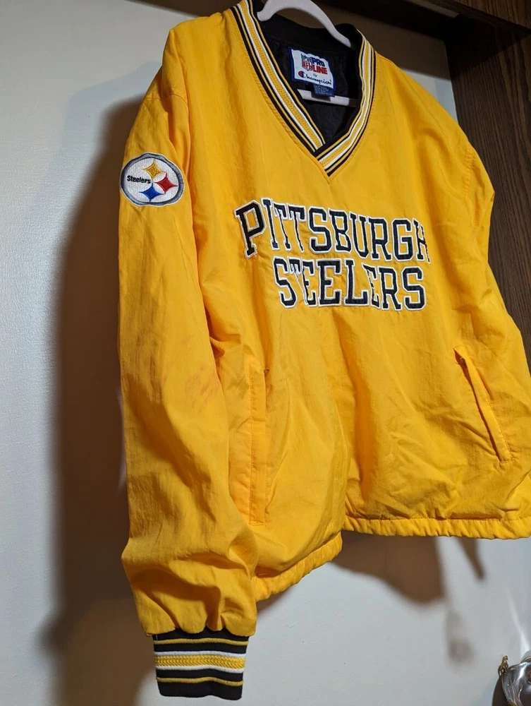 Vintage Champion NFL Pro Line Pittsburgh Steelers Pullover Wind Breaker. Large size New This jacket has 2 zipper pockets on the front. Both zippers work great. Condition is very good, no stains or holes or any kind.
