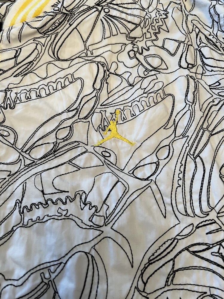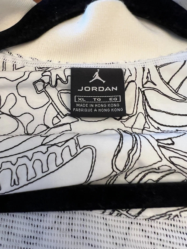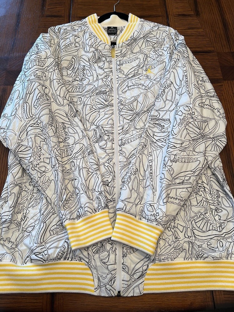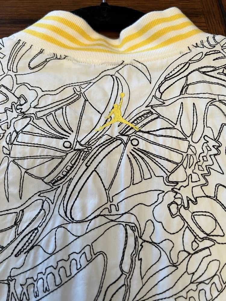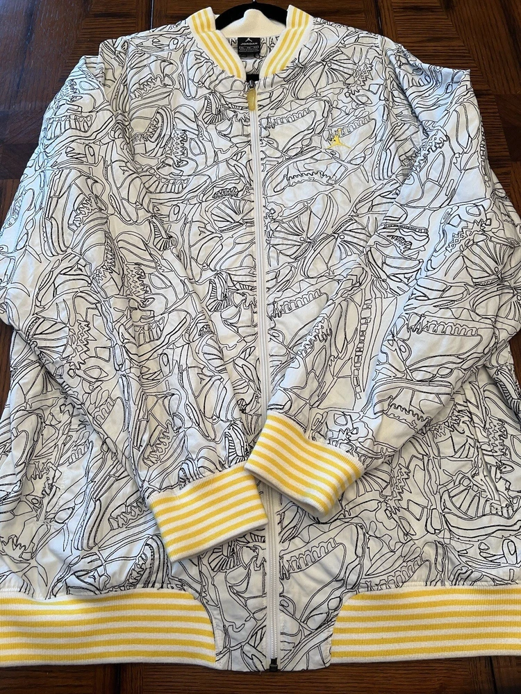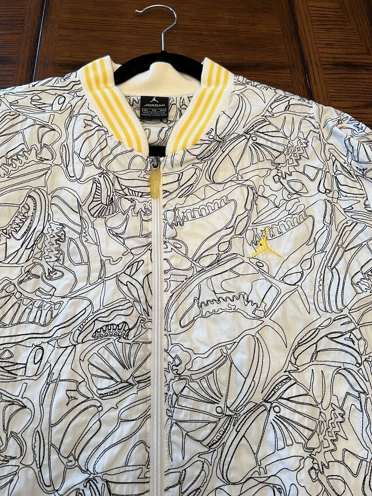 Get ready to stand out with this rare vintage Jordan Lightning Thunder Laser Jacket from 2006. This XL jacket features a unique geometric pattern and is made of comfortable cotton jersey fabric with a full zip closure. It includes a variety of accents such as quilted, embroidered, sequin, and logo details, making it a perfect choice for parties, casual outings, or even formal occasions. In addition, this limited edition jacket is wind-resistant, insulated, and moisture-wicking, making it suitable for all seasons. It also features zipped pockets, taped seams, and a collarless design for added convenience and style. Don't miss out on this one-of-a-kind piece that represents the Italian, princess, colorful, stars, retro, western, designer, school, outdoor, hip hop, sports, space, motorcycle, USA, thunder, hippie, nautical, snake, classic, flag, hipster, laser, skull, 80s, and 90s themes.