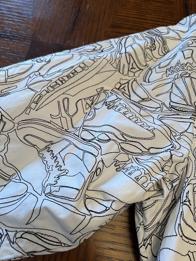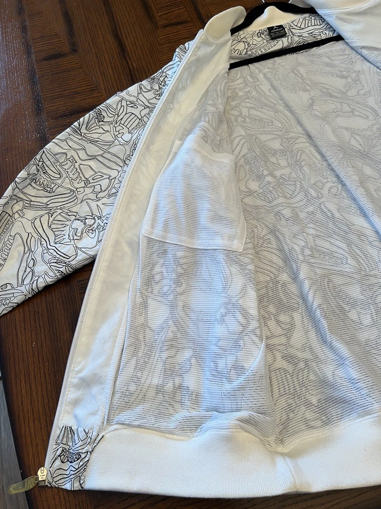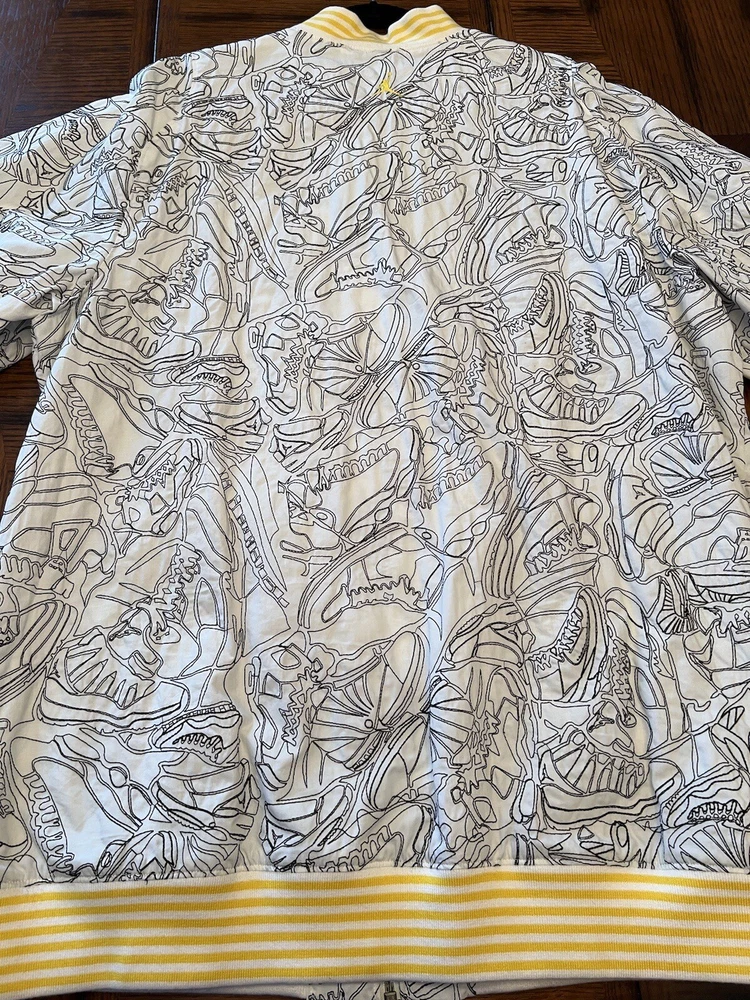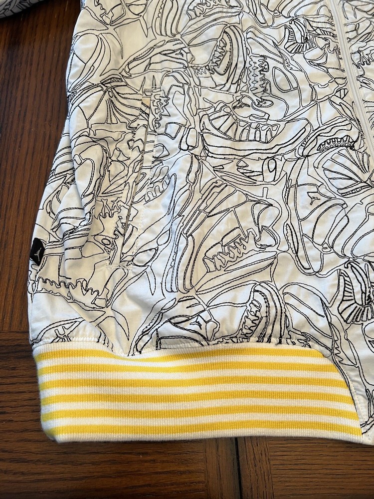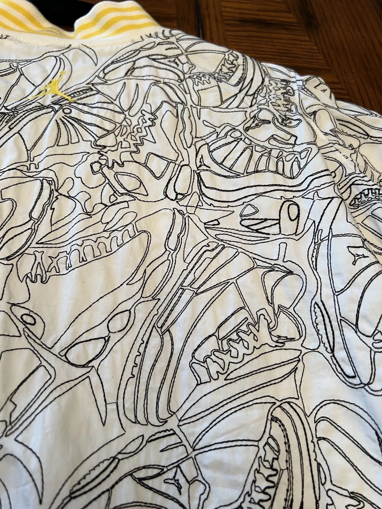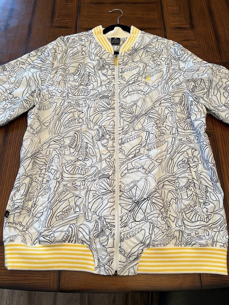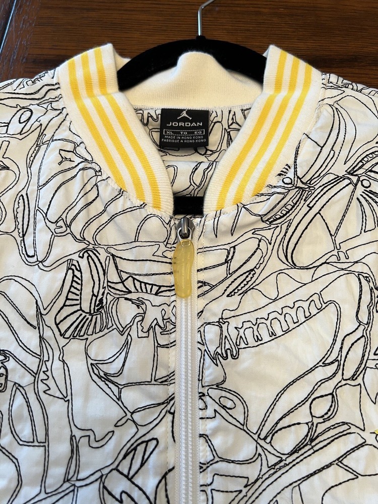Get ready to stand out with this rare vintage Jordan Lightning Thunder Laser Jacket from 2006. This XL jacket features a unique geometric pattern and is made of comfortable cotton jersey fabric with a full zip closure. It includes a variety of accents such as quilted, embroidered, sequin, and logo details, making it a perfect choice for parties, casual outings, or even formal occasions. In addition, this limited edition jacket is wind-resistant, insulated, and moisture-wicking, making it suitable for all seasons. It also features zipped pockets, taped seams, and a collarless design for added convenience and style. Don't miss out on this one-of-a-kind piece that represents the Italian, princess, colorful, stars, retro, western, designer, school, outdoor, hip hop, sports, space, motorcycle, USA, thunder, hippie, nautical, snake, classic, flag, hipster, laser, skull, 80s, and 90s themes.