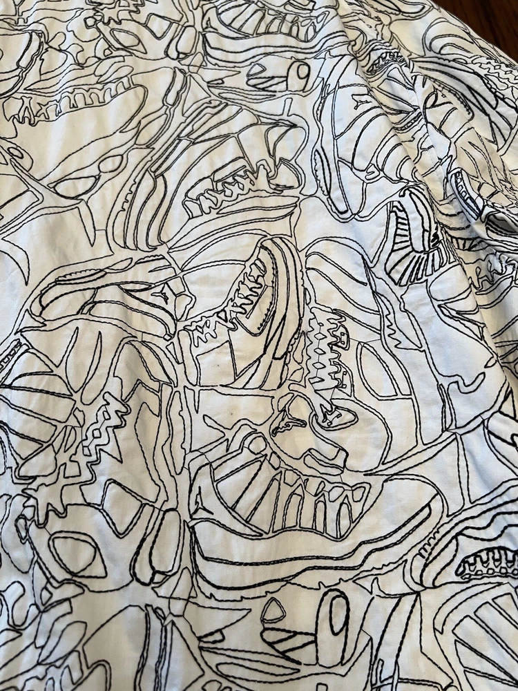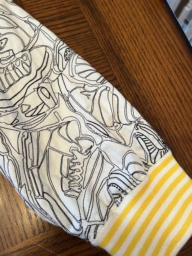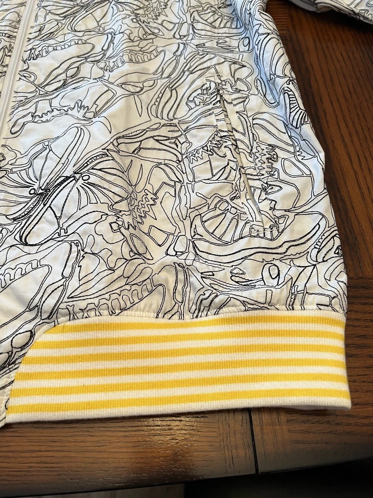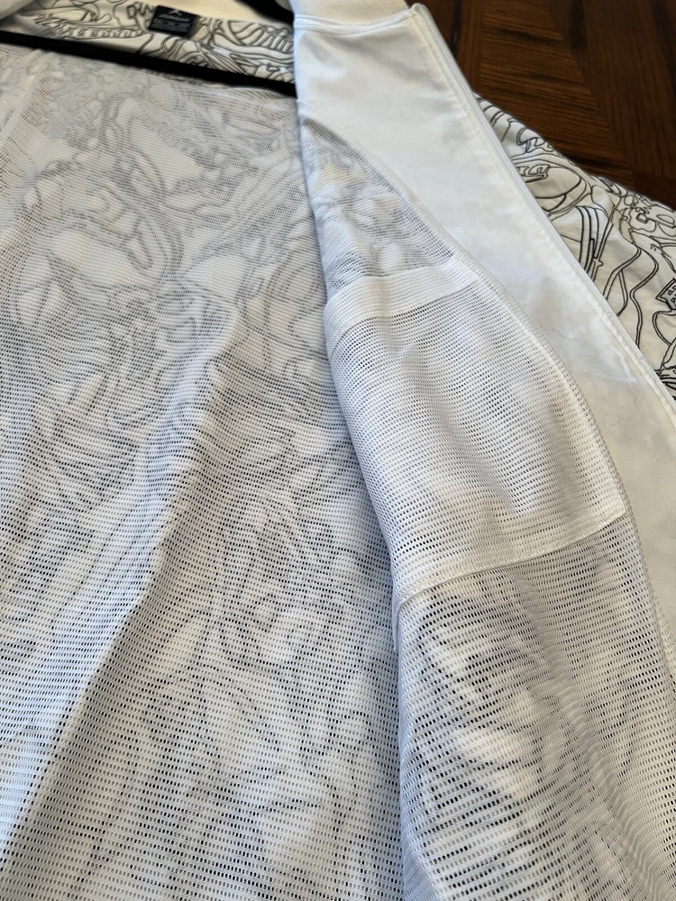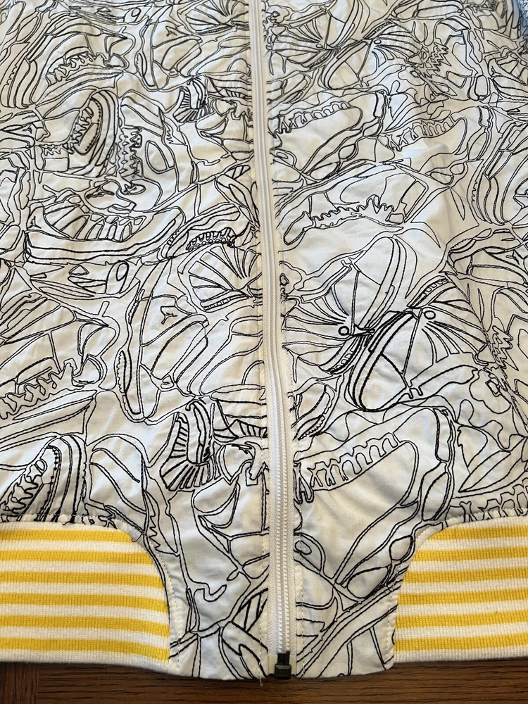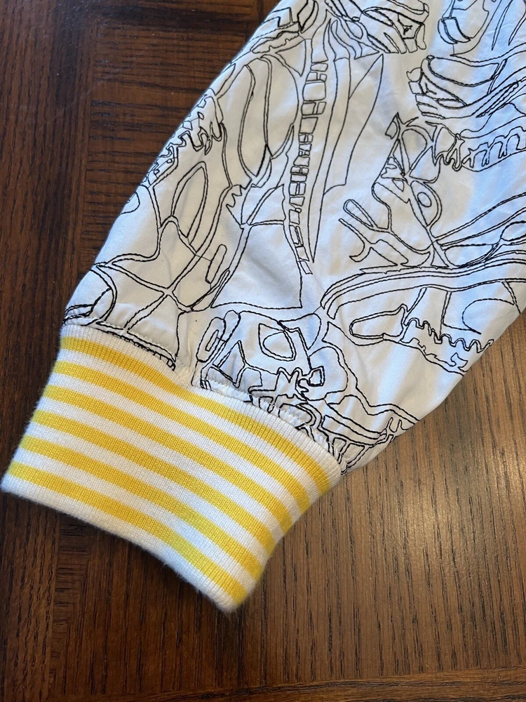 Get ready to stand out with this rare vintage Jordan Lightning Thunder Laser Jacket from 2006. This XL jacket features a unique geometric pattern and is made of comfortable cotton jersey fabric with a full zip closure. It includes a variety of accents such as quilted, embroidered, sequin, and logo details, making it a perfect choice for parties, casual outings, or even formal occasions. In addition, this limited edition jacket is wind-resistant, insulated, and moisture-wicking, making it suitable for all seasons. It also features zipped pockets, taped seams, and a collarless design for added convenience and style. Don't miss out on this one-of-a-kind piece that represents the Italian, princess, colorful, stars, retro, western, designer, school, outdoor, hip hop, sports, space, motorcycle, USA, thunder, hippie, nautical, snake, classic, flag, hipster, laser, skull, 80s, and 90s themes.
