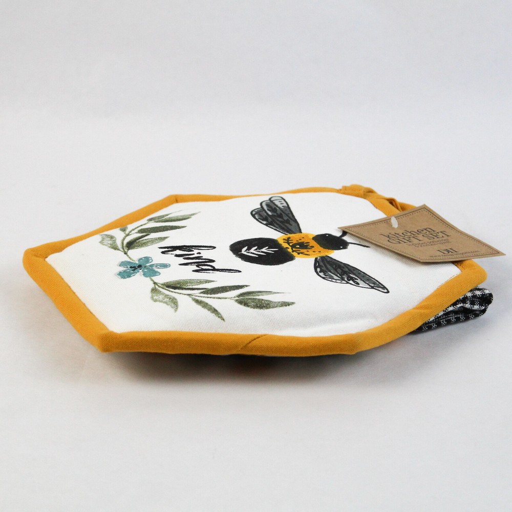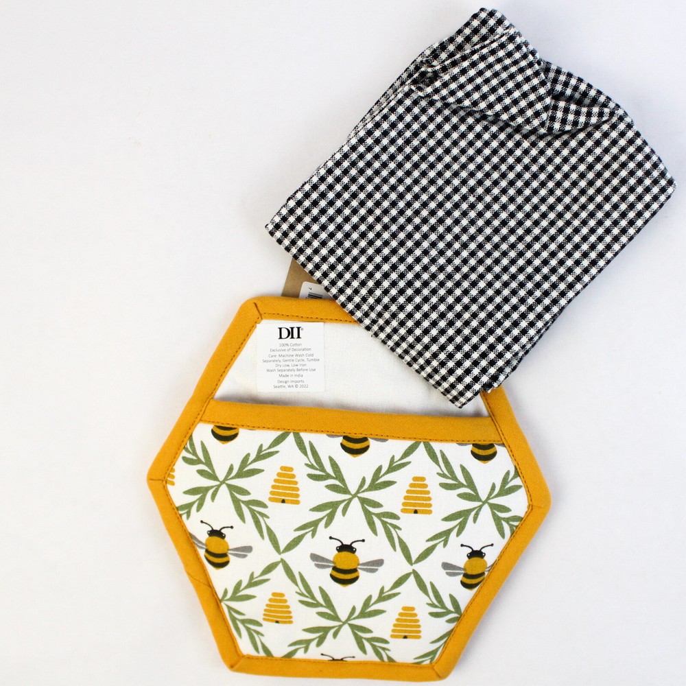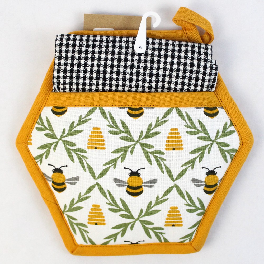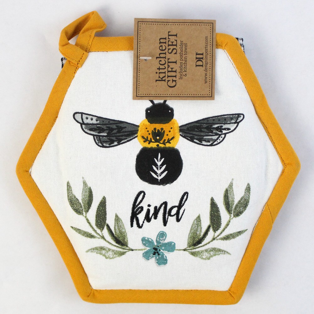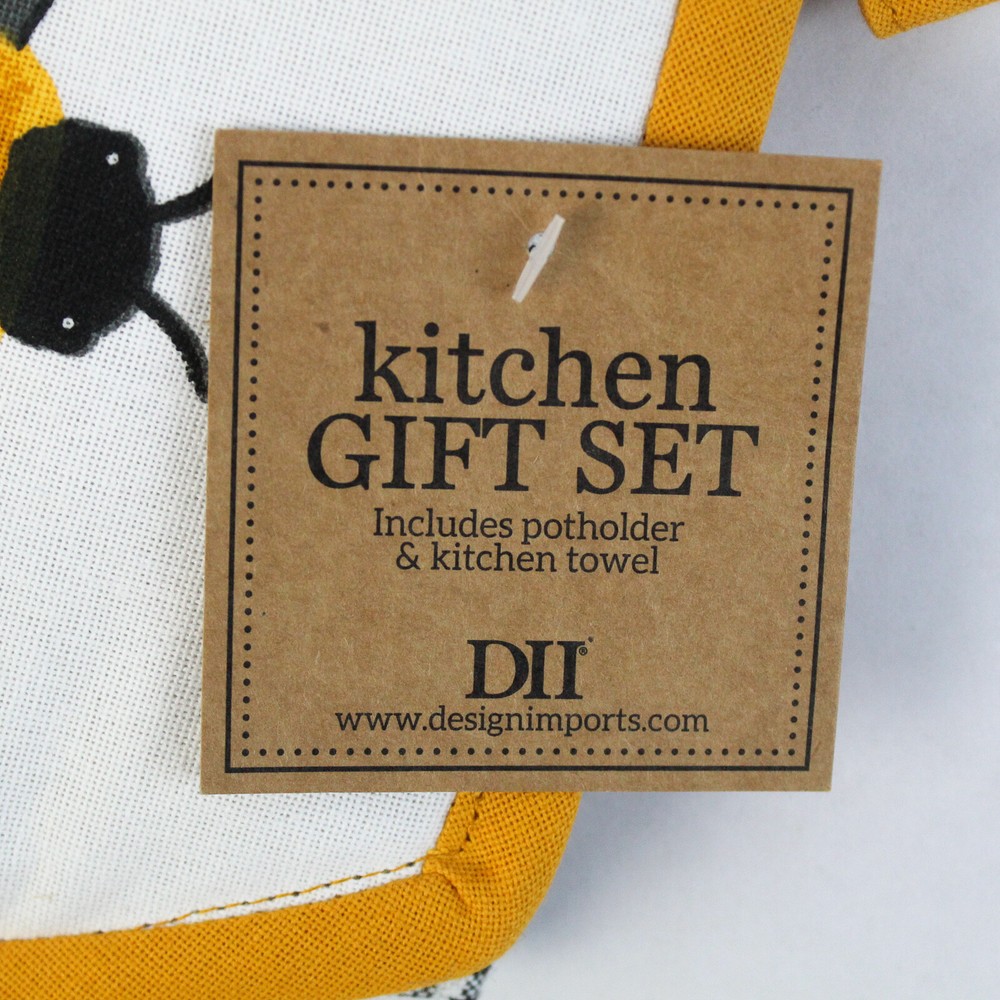 Add a touch of charm to your kitchen with this delightful bee-themed kitchen gift set from Design Imports. This set includes a stylish potholder and a matching kitchen towel, perfect for any home chef. Brand new with its original tag, this set is a great gift for housewarmings or special occasions. Dimensions: 8.5" height x 9" width.