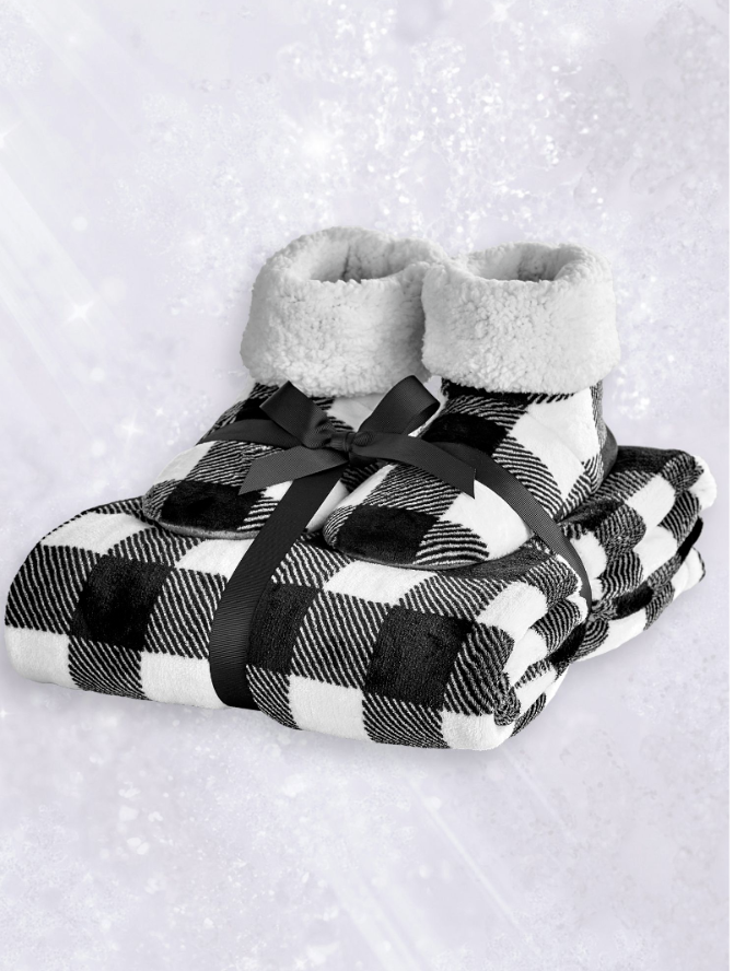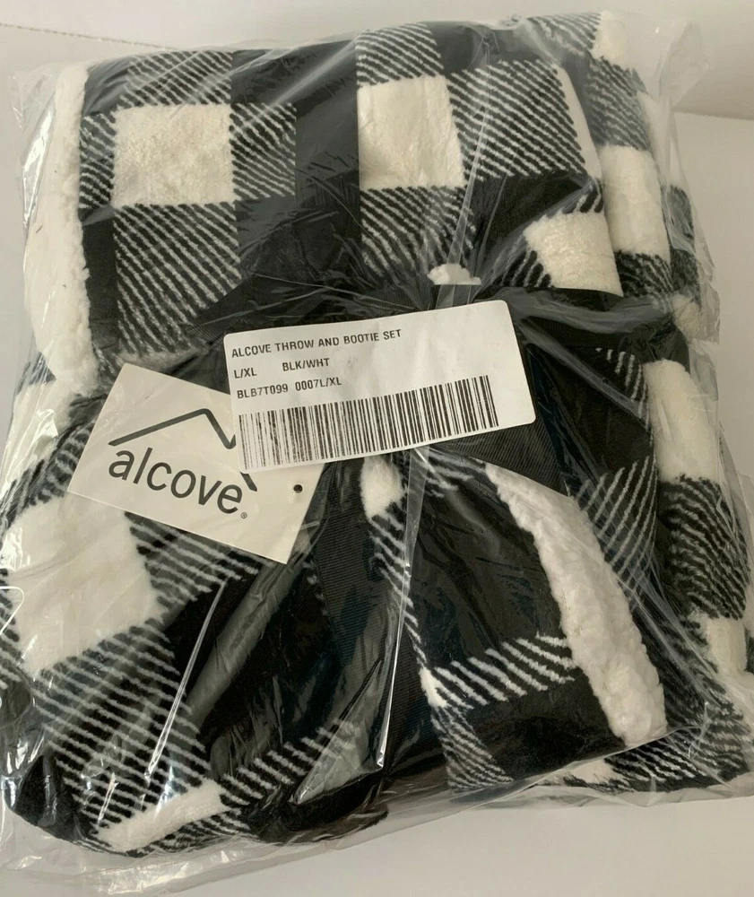 Plaid Plush Throw and Bootie Gift Set by ALCOVE Throw Size: 50" x 60" Bootie Size: L/XL (fits shoe size 9-10) Color: Black/White Plaid The Alcove line delivers outstanding value with products that bring comfort and warmth to your home. Lofty coral fleece is machine washable and won't pill, making it the perfect choice for a luxurious throw. Along with a cozy pair of fleece booties, this duo makes an irresistible gift set. Includes throw and booties Throw is 50" wide x 60" long Slippers L/XL - fits shoe size 9/10 Slippers measure 11" long on the sole 100% Polyester Cozy fleece construction Both are machine washable Brand new with tags attached First photo is a stock image Please email with ANY questions...I answer promptly! No Returns accepted Reasonable offers will be considered Payment requested at the time of purchase Smoke Free * Pet Friendly Home Thank you for your interest in my listings :) ~Tamara