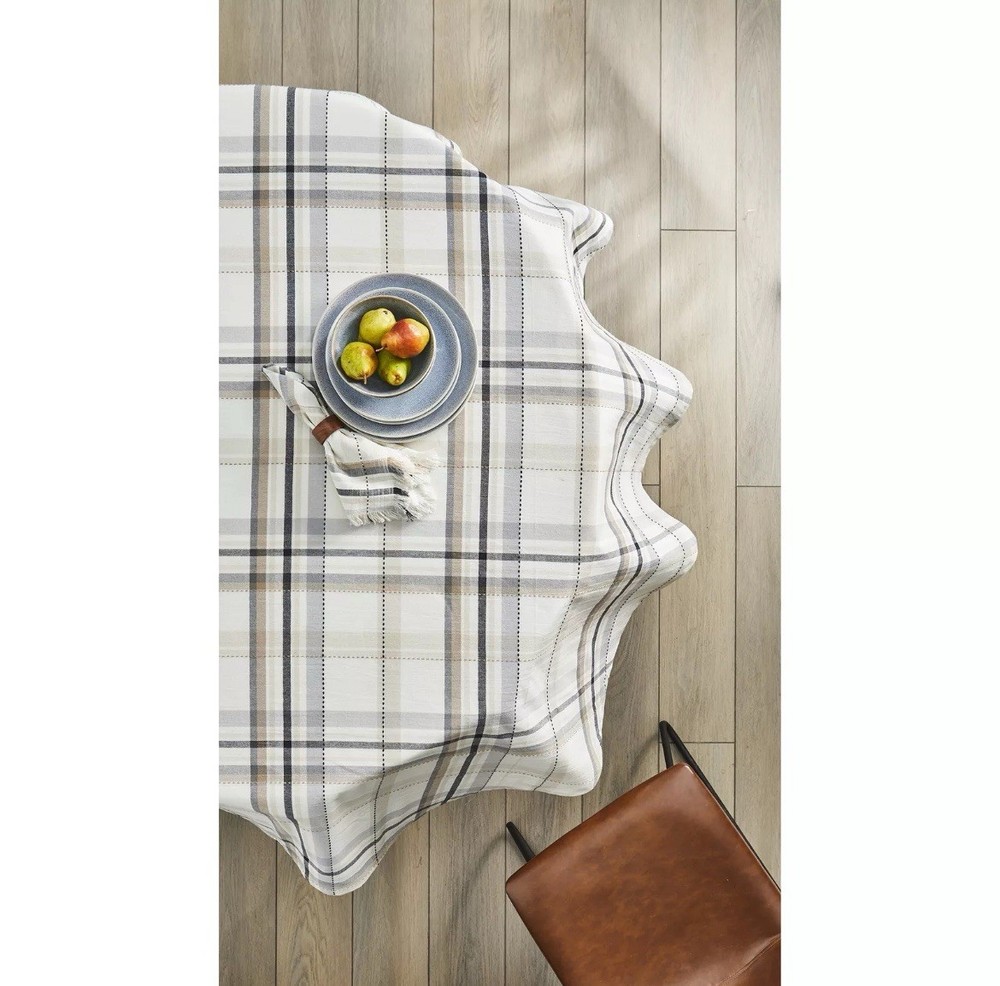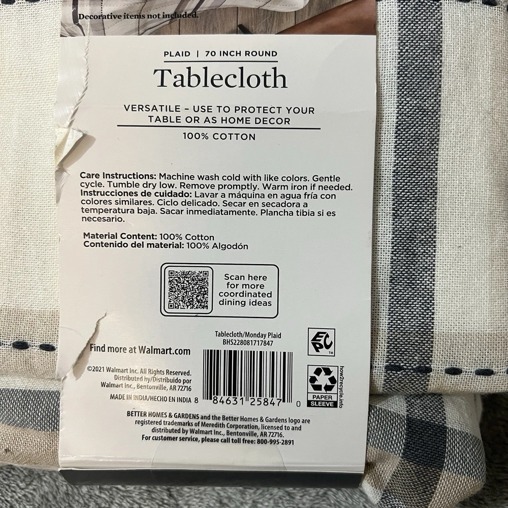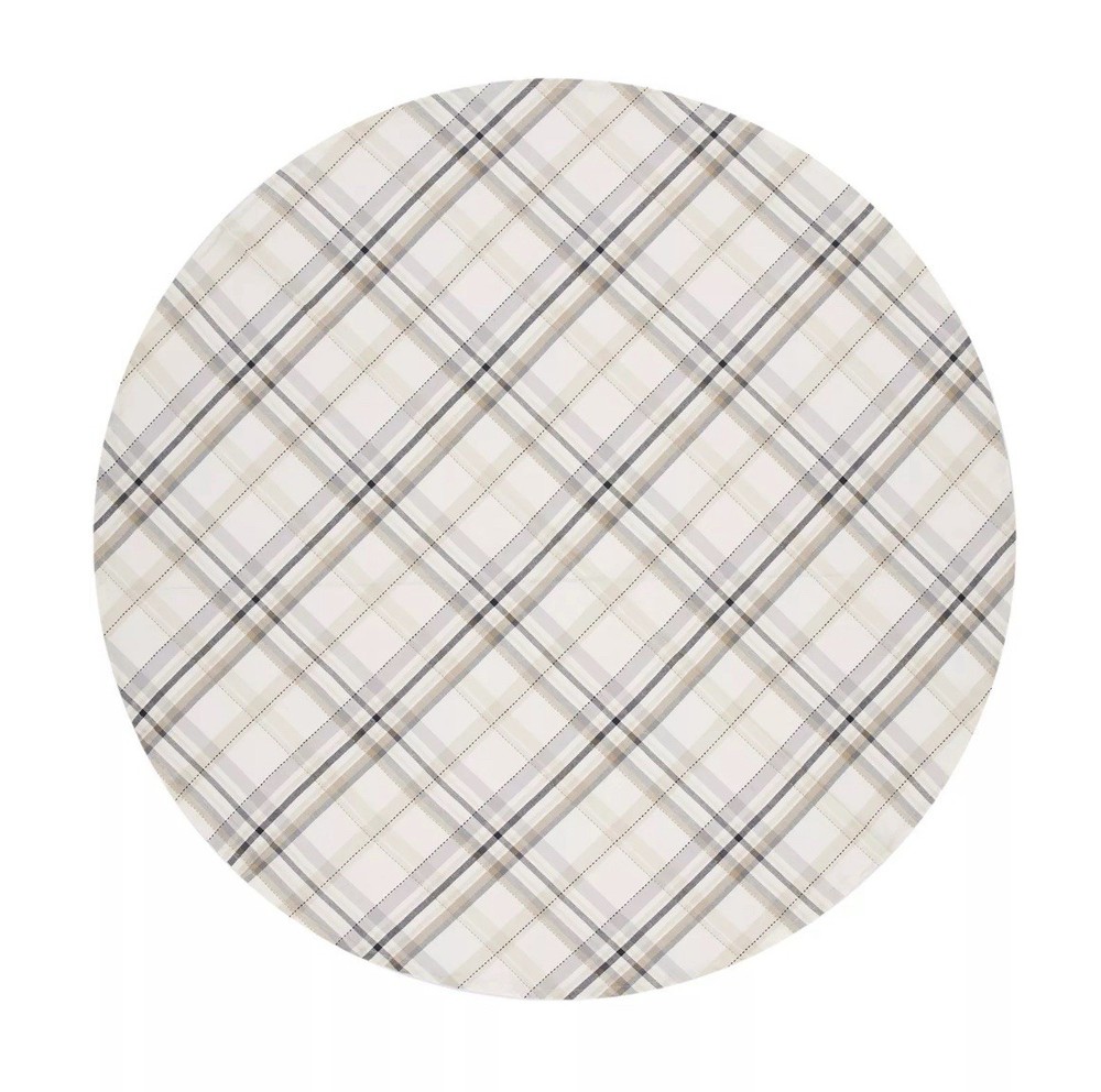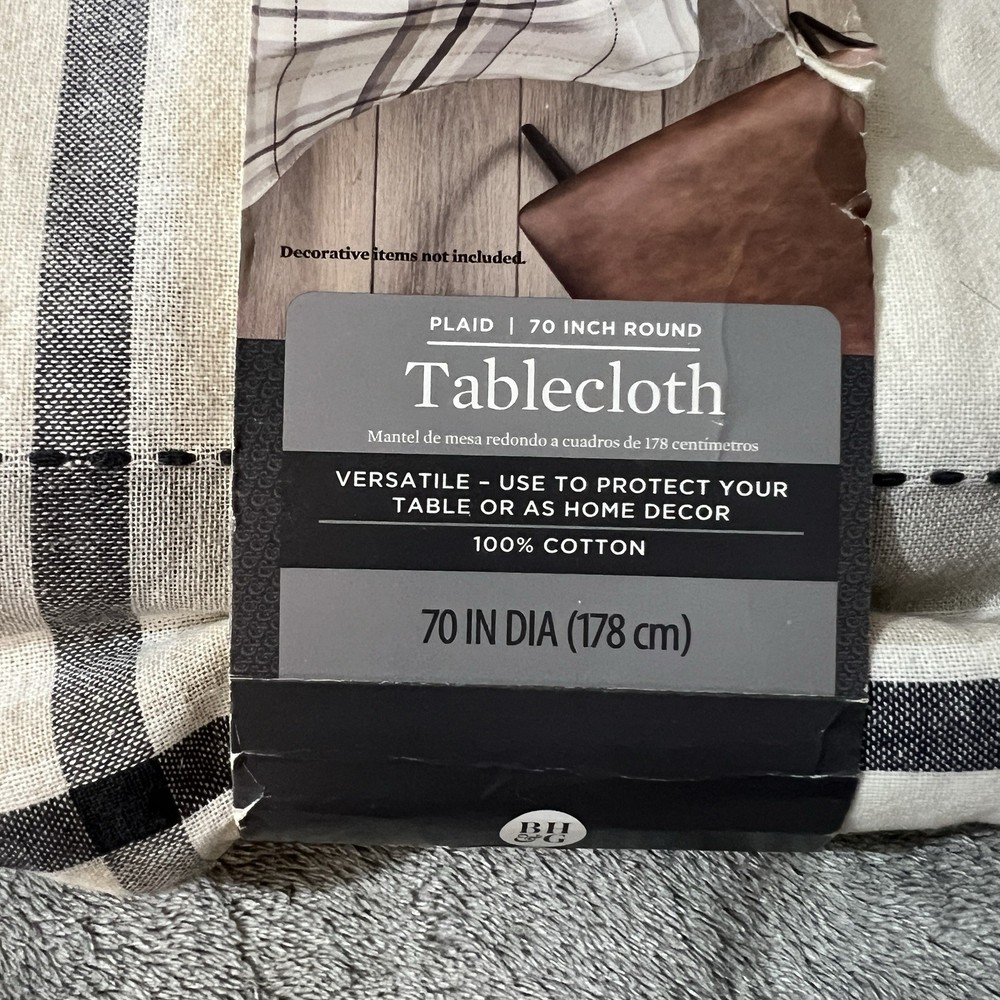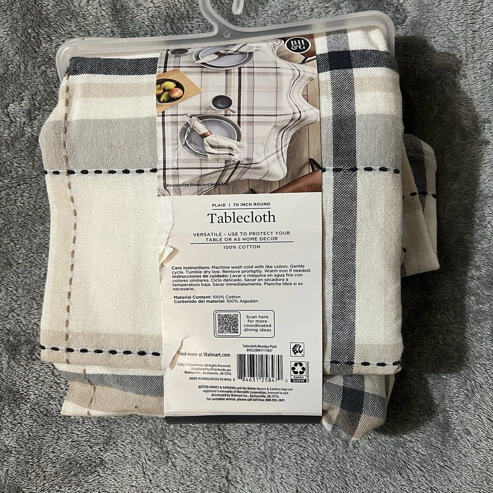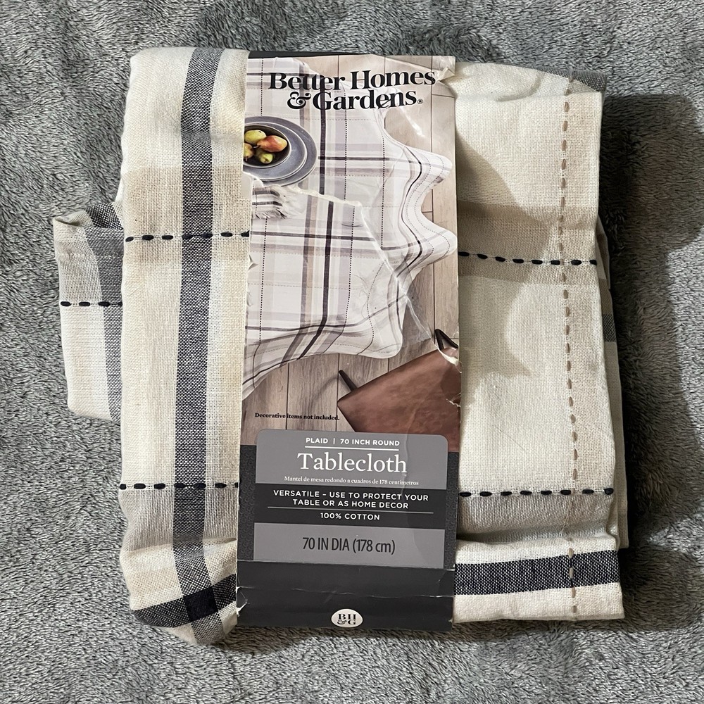 Add a touch of farmhouse charm to your home with this Better Homes & Gardens 70 inch round tablecloth. Made from 100% cotton, this plaid tablecloth is perfect for any occasion, whether it's a party, new home or everyday use. The multi-color plaid pattern will complement any decor and the round shape will fit any table size. This tablecloth is easy to care for and can be machine washed cold. It's also imported and assembled with dimensions of 70 x 70 x 0.05 inches, weighing 0.97 lbs. Enhance your kitchen, dining or bar area with this multi-purpose tablecloth that is both stylish and functional.